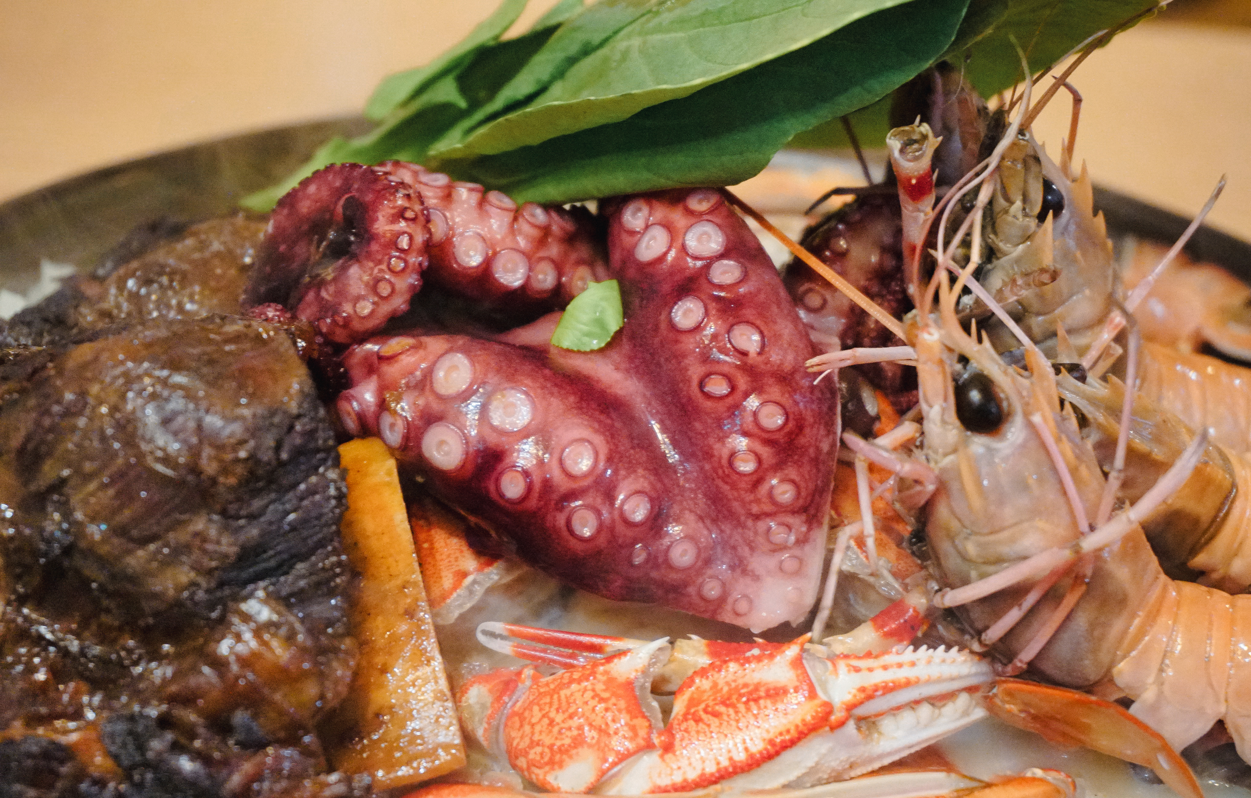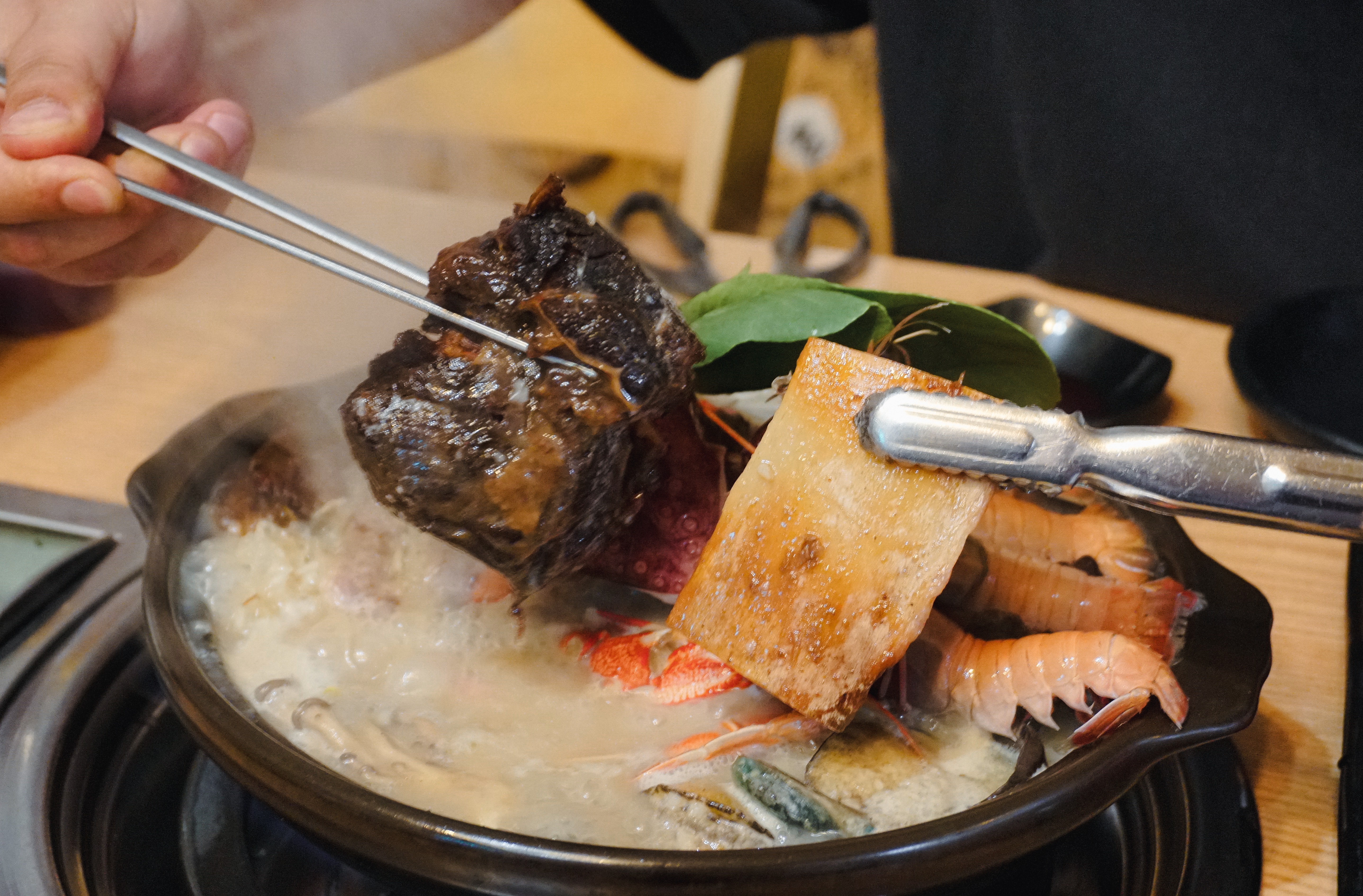 장인의집에서 권장하는 맛있게 먹는 방법대로 하나씩 차례로 먹어보았습니다. ➊ 소갈비찜(소갈비찜은 잘 삶아져서 그런지 뼈를 발라낼 필요도 없이 쏙 하고 빠지더라고요). ➋ 문어(문어는 먹기 좋은 크기로 잘라서 먹었습니다). ➌ 버섯(버섯은 진한 사골국물이 잘 배어있어 고소하면서 향도 좋았어요).