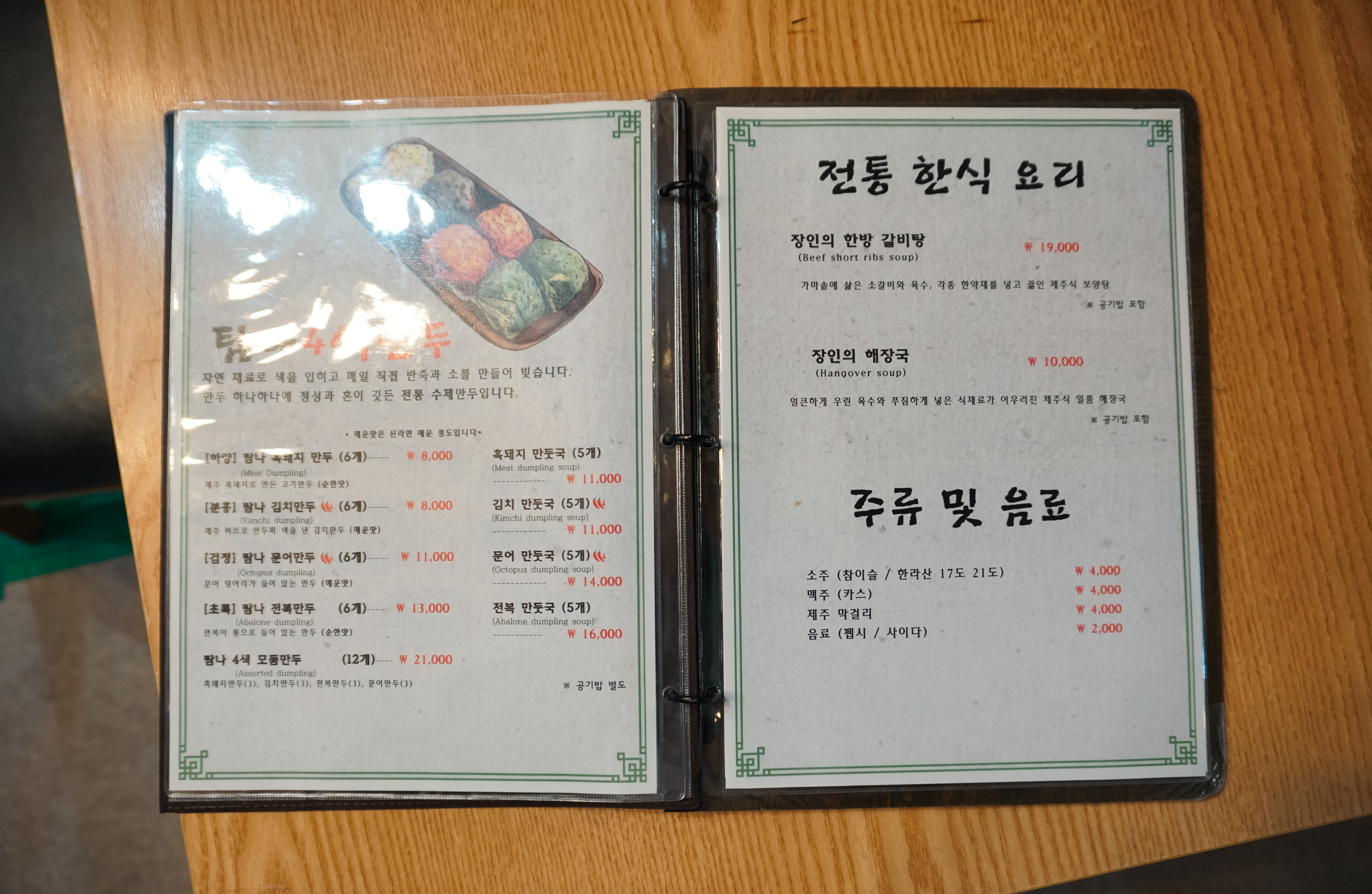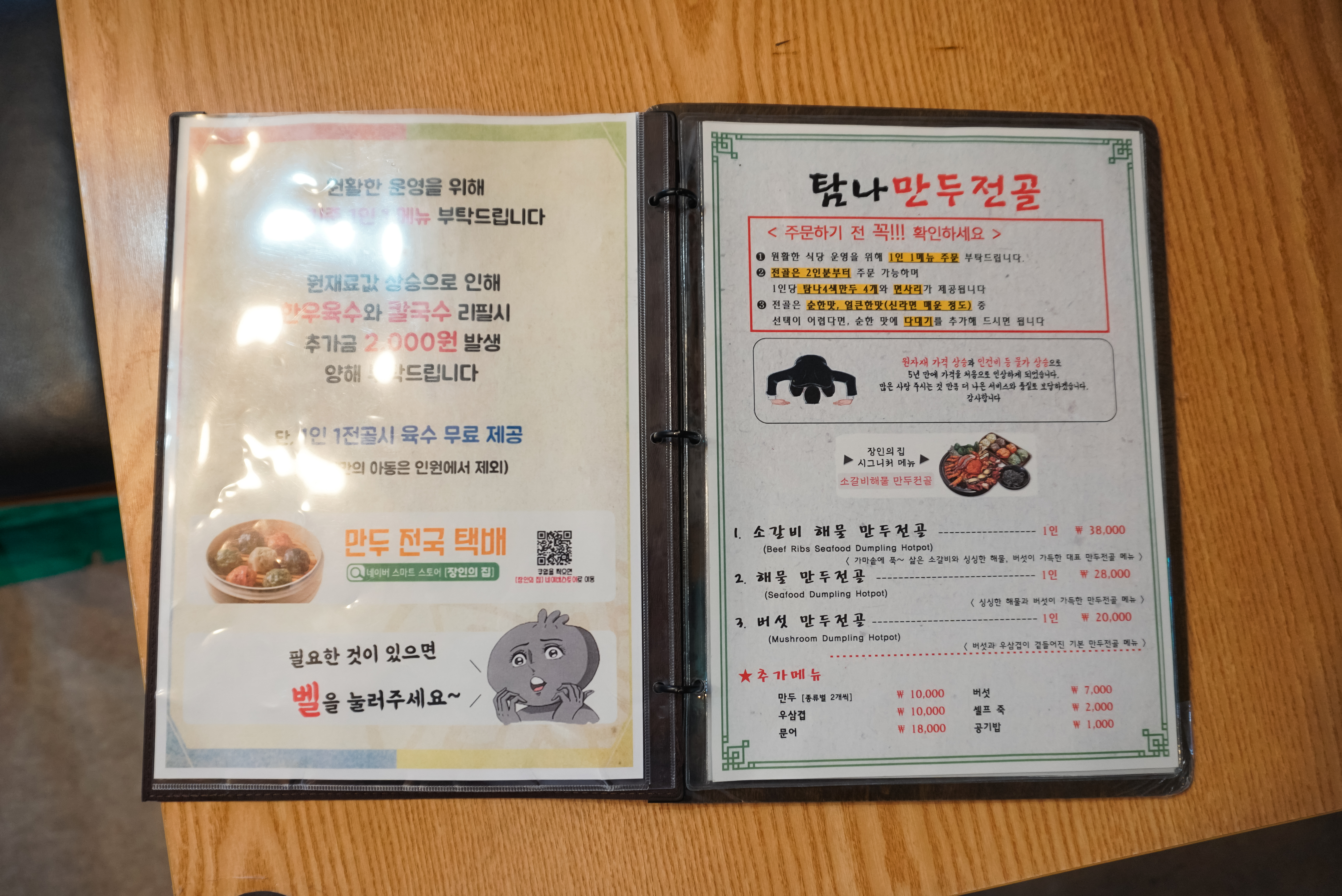 애월 장인의 집 메뉴는 탐나만두전골(소갈비해물만두전골, 해물만두전골, 버섯만두전골)이 있었고, 탐나4색만두, 만둣국, 장인의 한방갈비탕, 장인의해장국 등이 있었습니다. 저희는 장인의집 시그니쳐 메뉴인 '소갈비해물만두전골'을 주문했습니다.