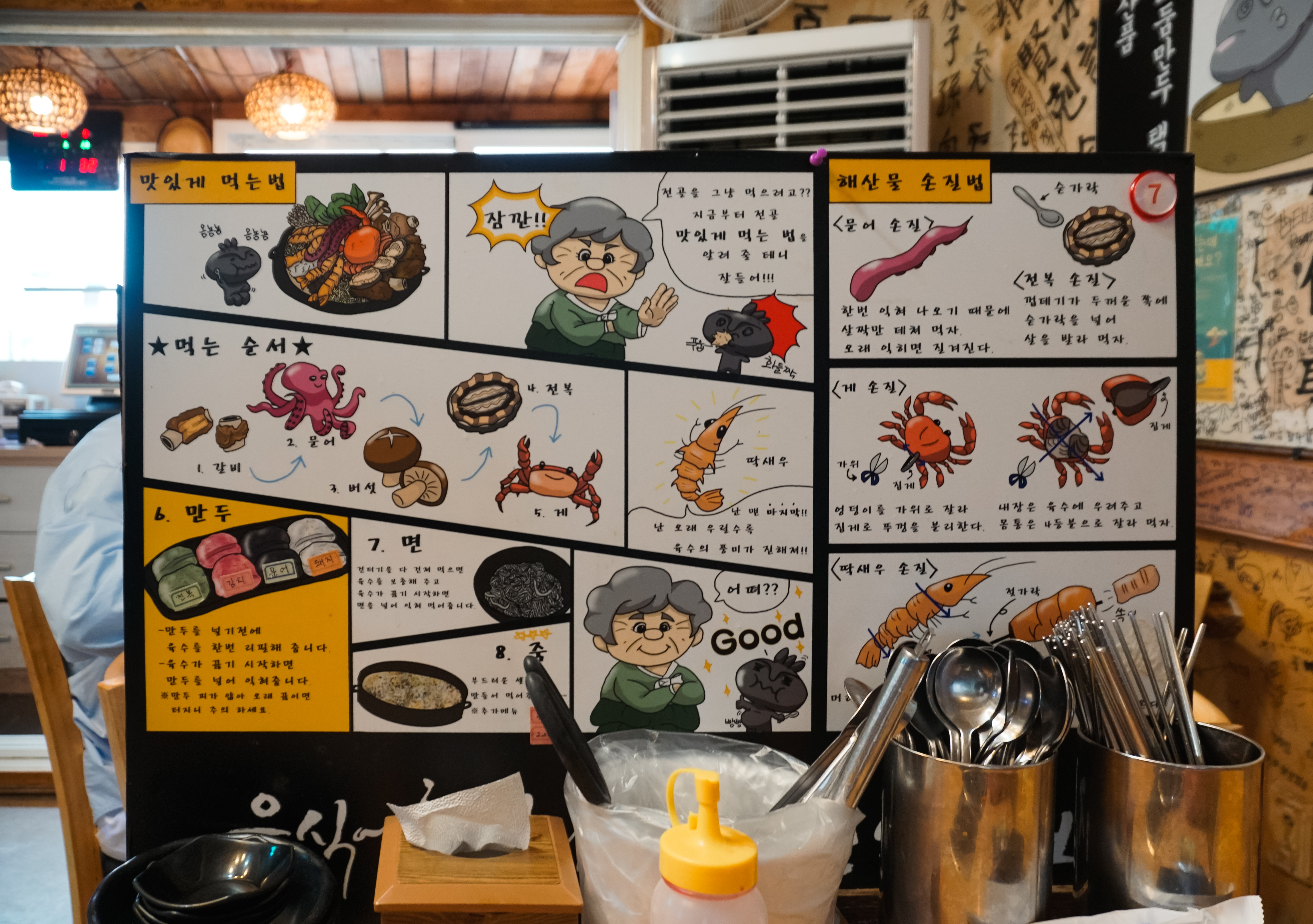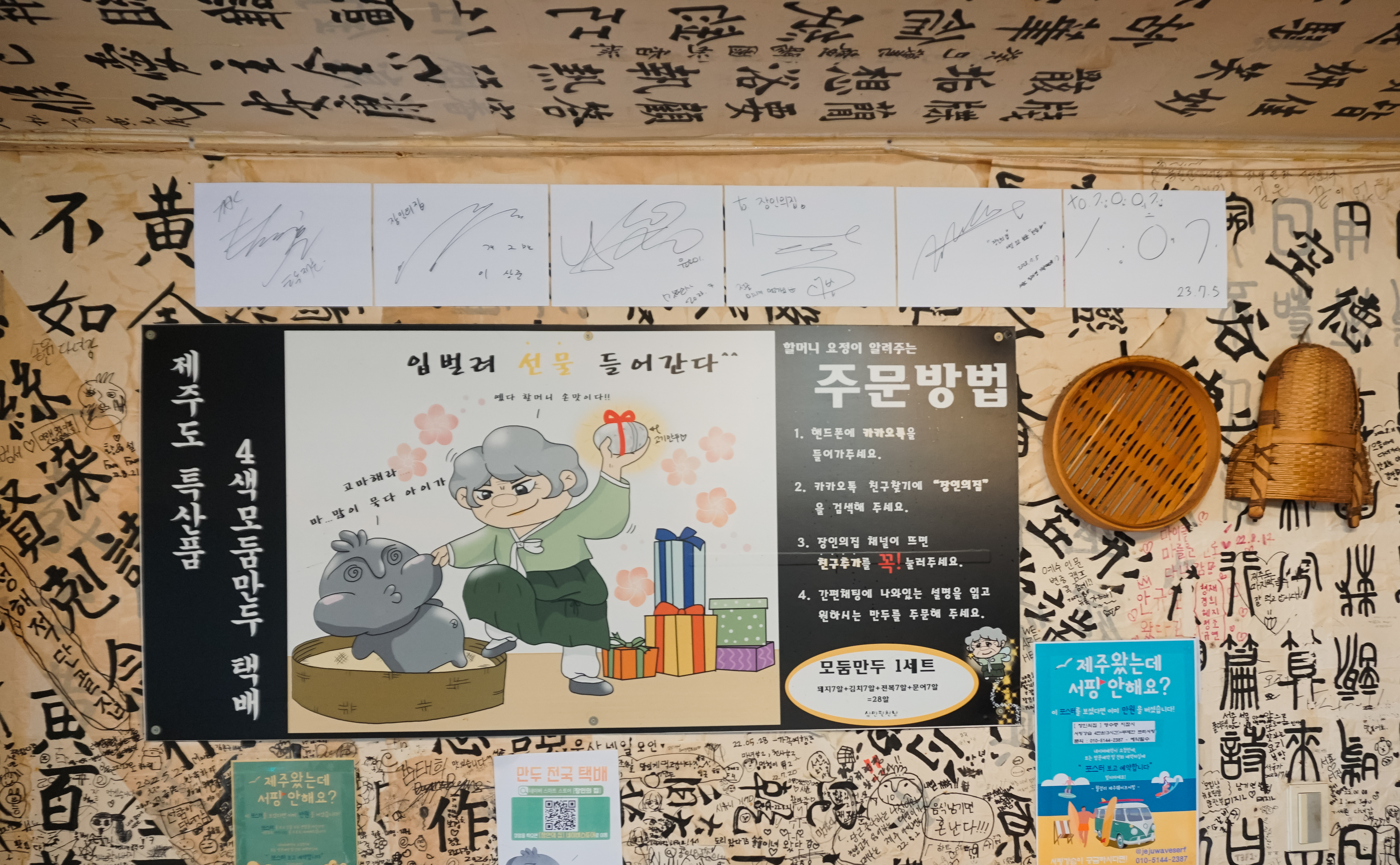 실내에 들어가니 소문난 맛집답게 손님들이 많이 있었습니다. 가게 벽에는 애월 장인의집 '만두전골을 맛있게 먹는 법'을 안내하는 안내문이 붙어있었고, 만두 주문하는 방법들을 안내하고 있었습니다. 유명한 맛집답게 유명인들의 사인도 곳곳에서 심심치 않게 볼 수 있었습니다. 자리를 잡고 메뉴를 주문해 보았습니다.