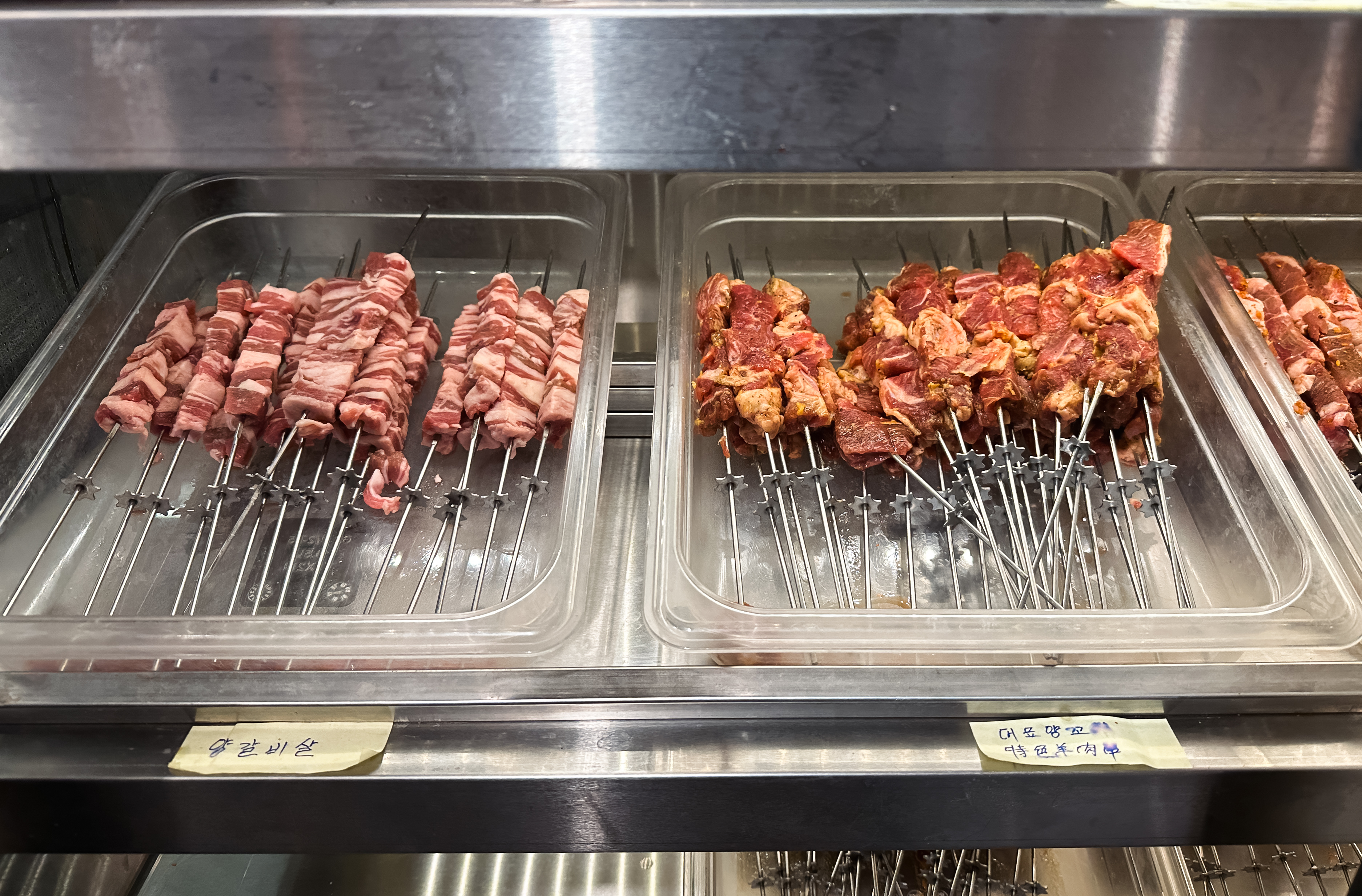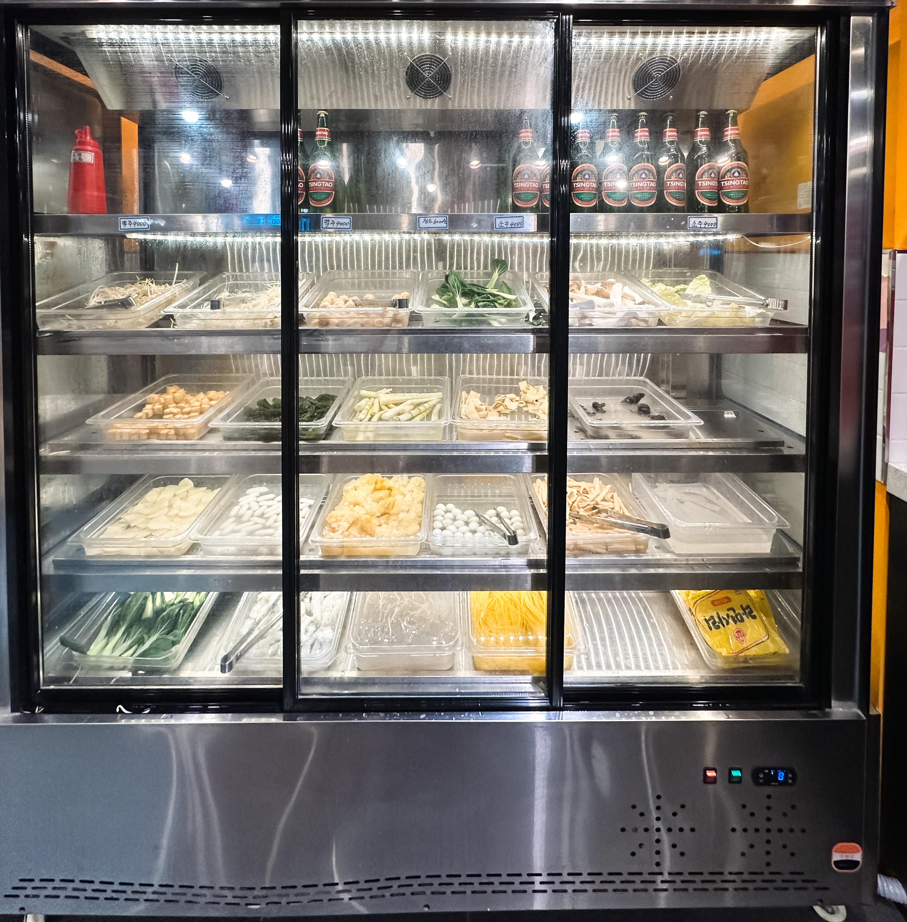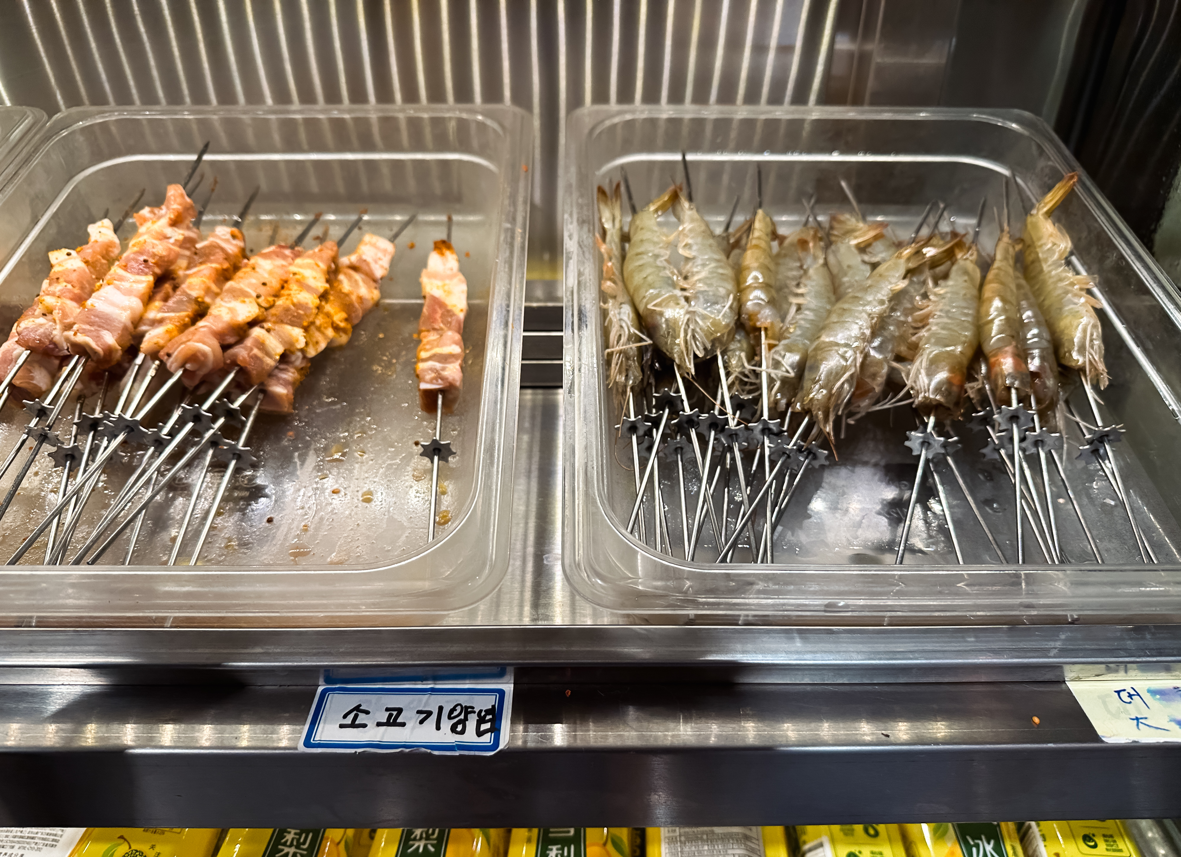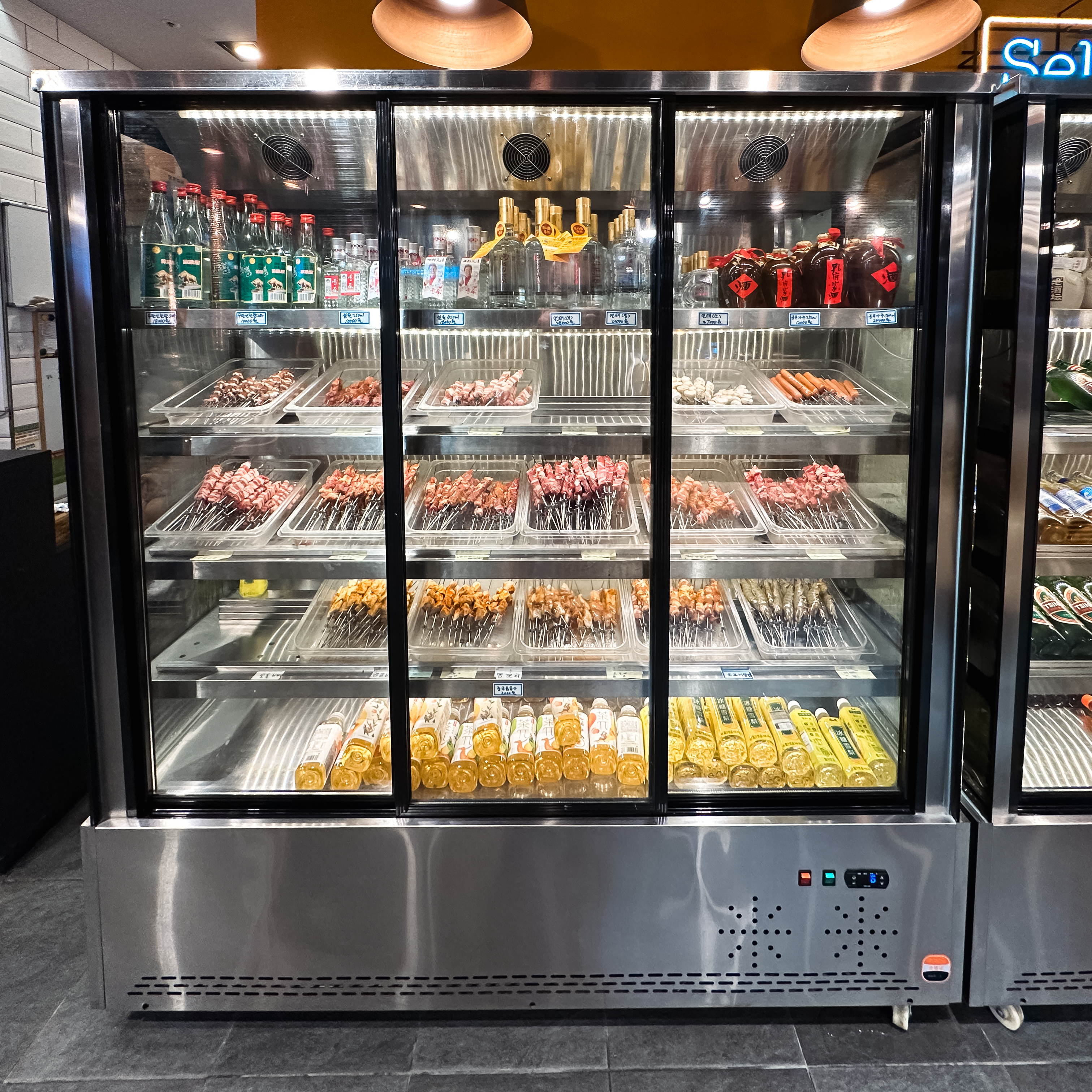 냉장고는 크게 양꼬치, 주류, 마라탕 재료로 구분되어 재료를 한눈에 보기 쉽게 진열되어 있었습니다. 양꼬치는 우리가 흔히 먹는 양꼬치 외에도 소고기나 양념을 한 양꼬치, 새우, 오징어, 막창 등 다양하게 구비되어 있었습니다. 마라탕 재료들도 마찬가지로 전문점만큼은 아니었지만, 다양한 재료들이 있었습니다.
