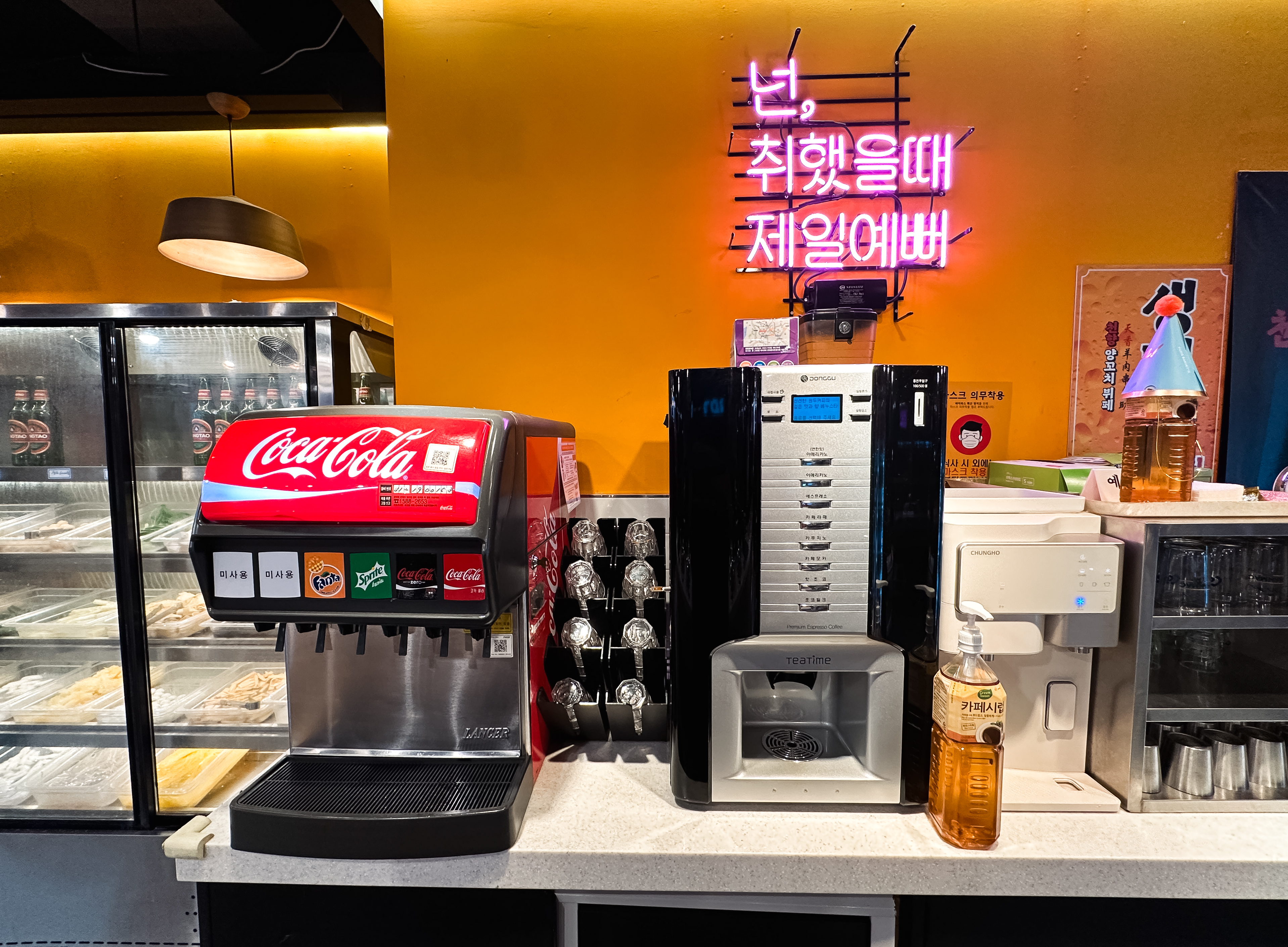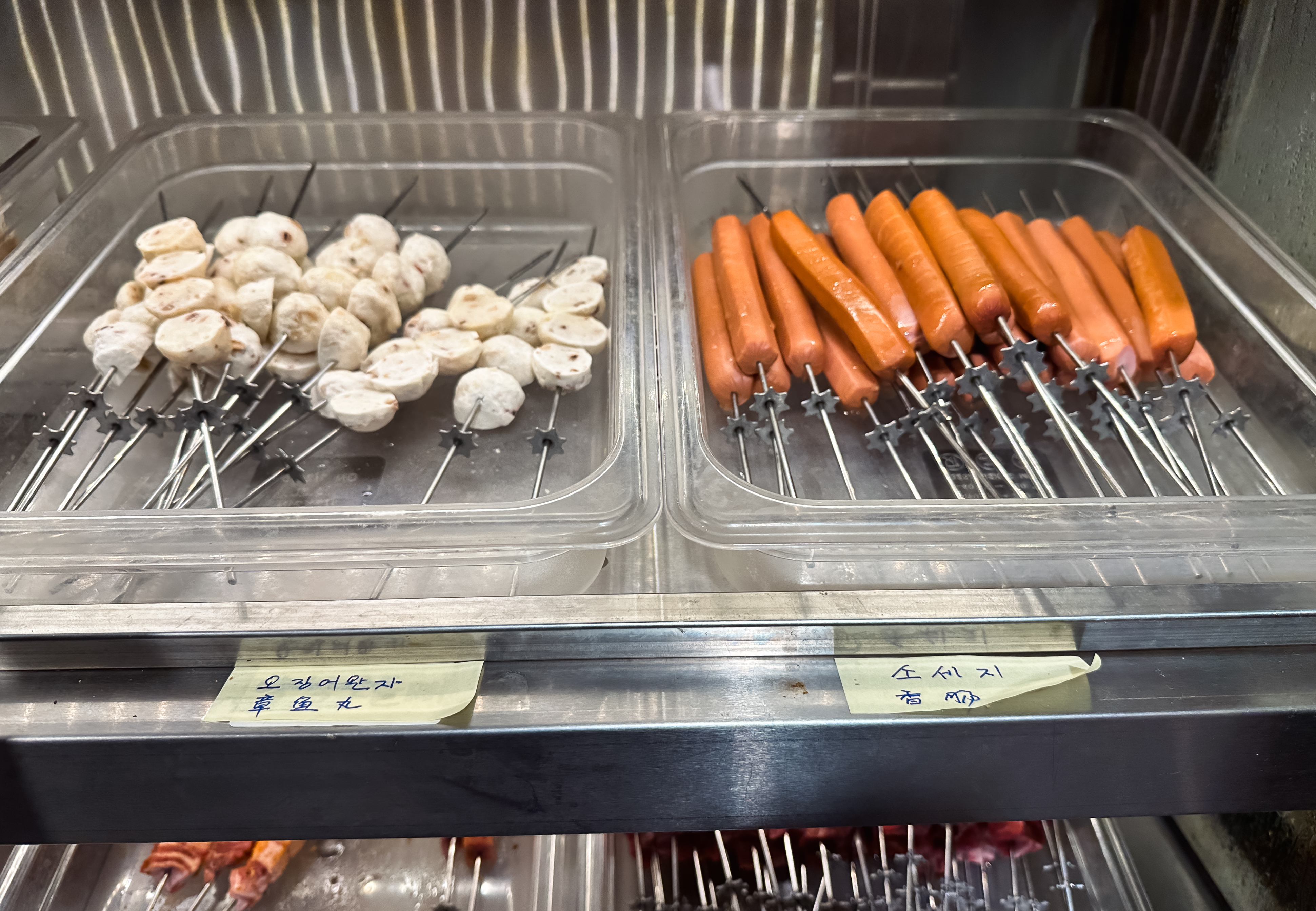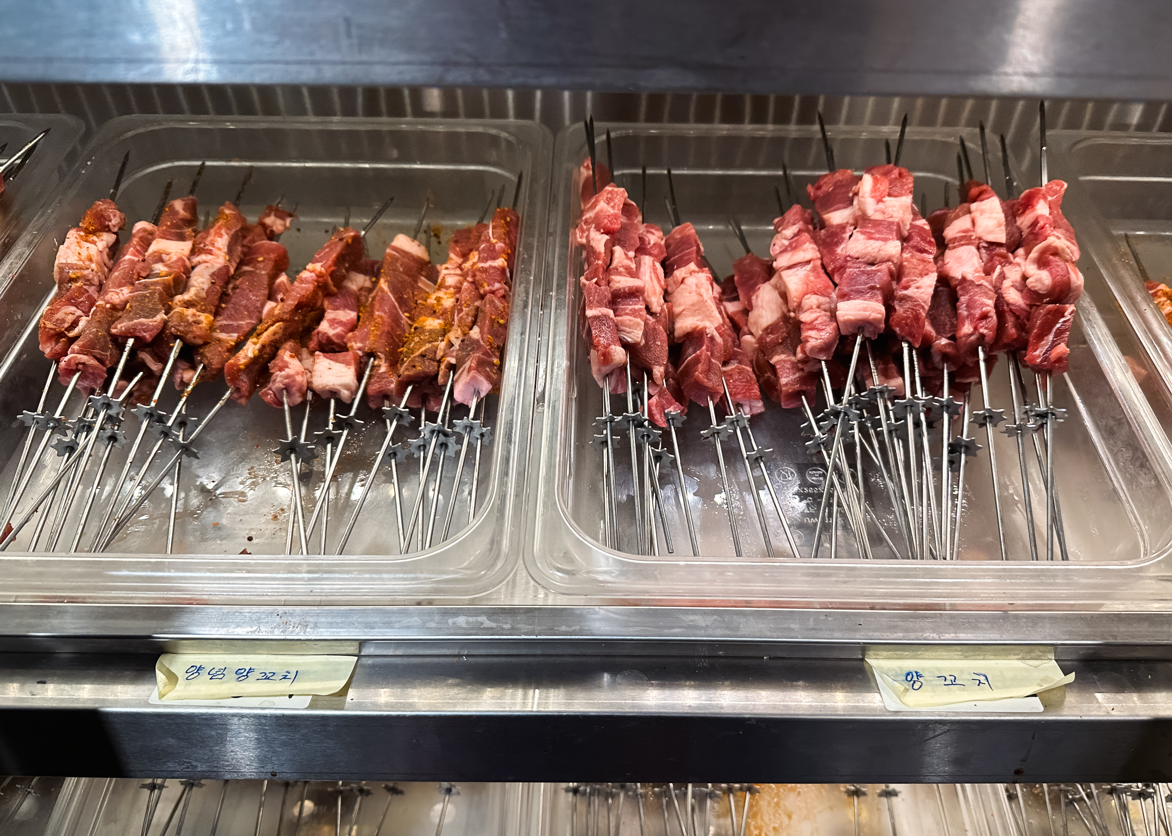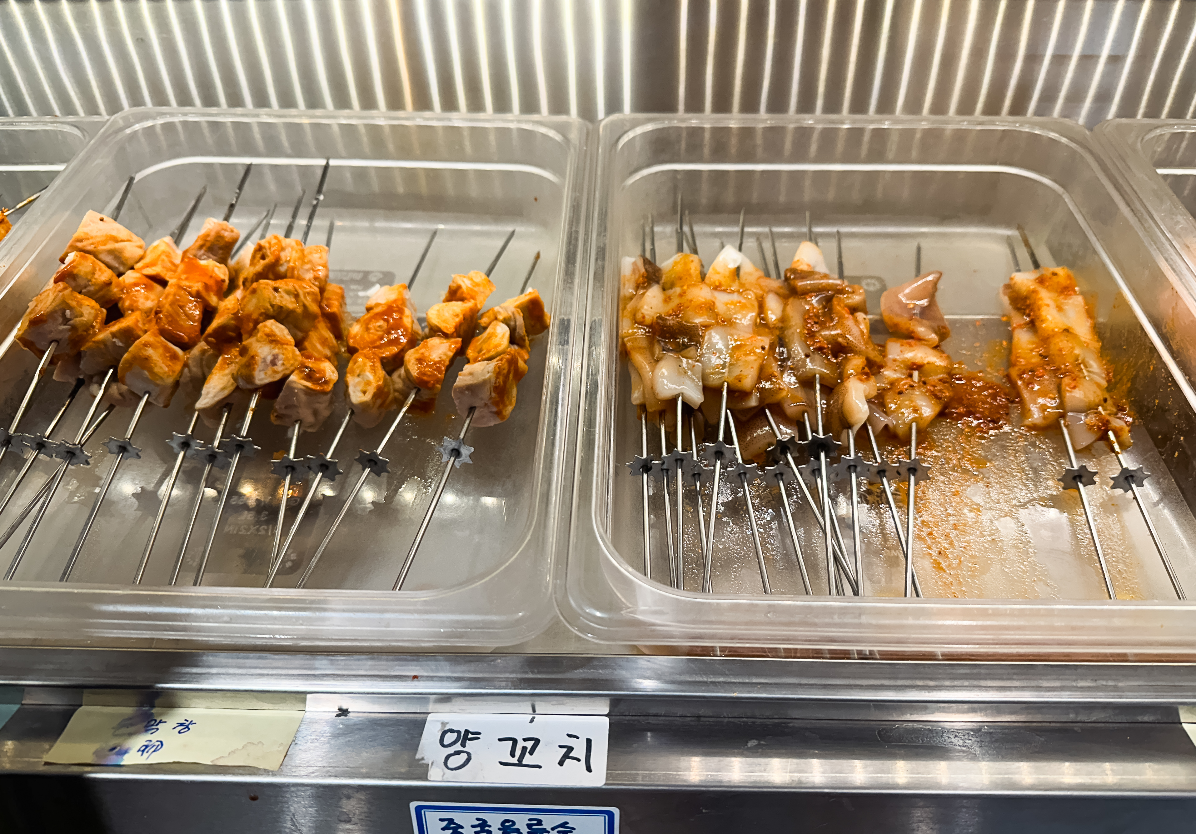 냉장고는 크게 양꼬치, 주류, 마라탕 재료로 구분되어 재료를 한눈에 보기 쉽게 진열되어 있었습니다. 양꼬치는 우리가 흔히 먹는 양꼬치 외에도 소고기나 양념을 한 양꼬치, 새우, 오징어, 막창 등 다양하게 구비되어 있었습니다. 마라탕 재료들도 마찬가지로 전문점만큼은 아니었지만, 다양한 재료들이 있었습니다.