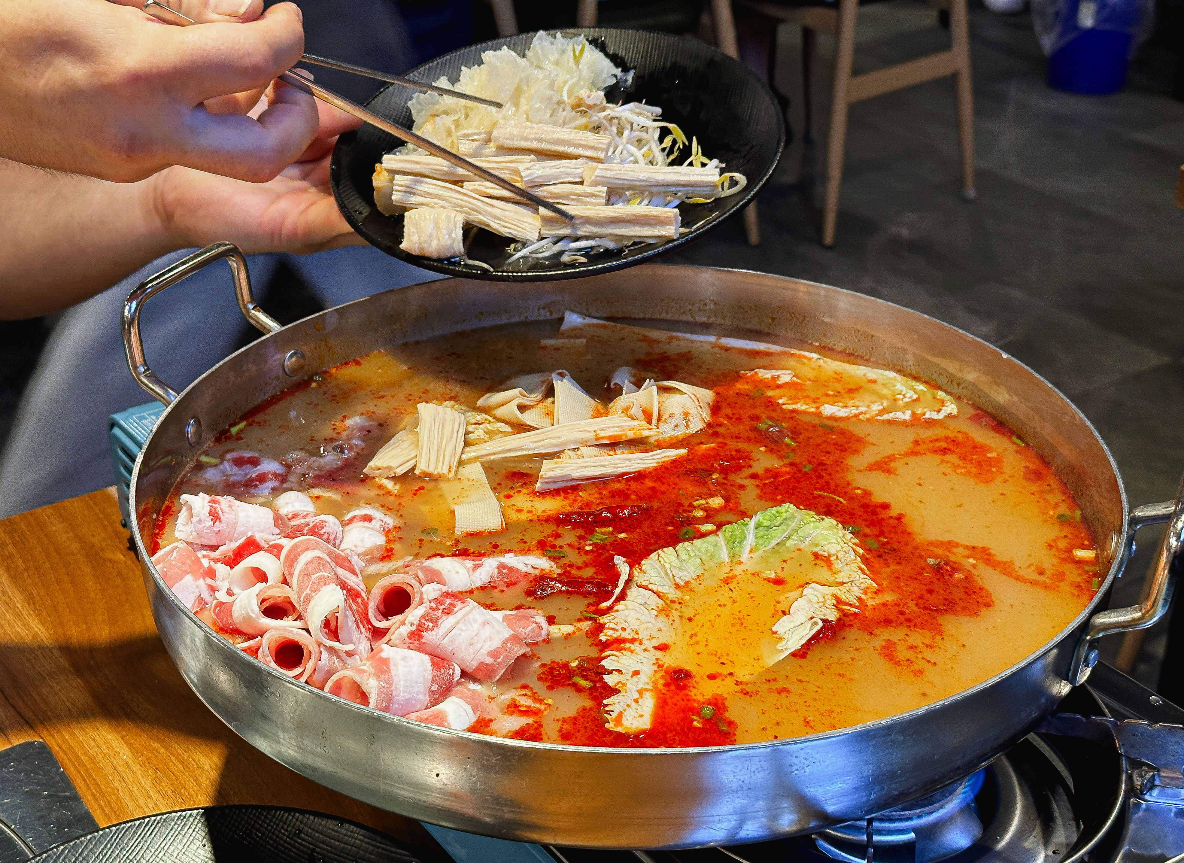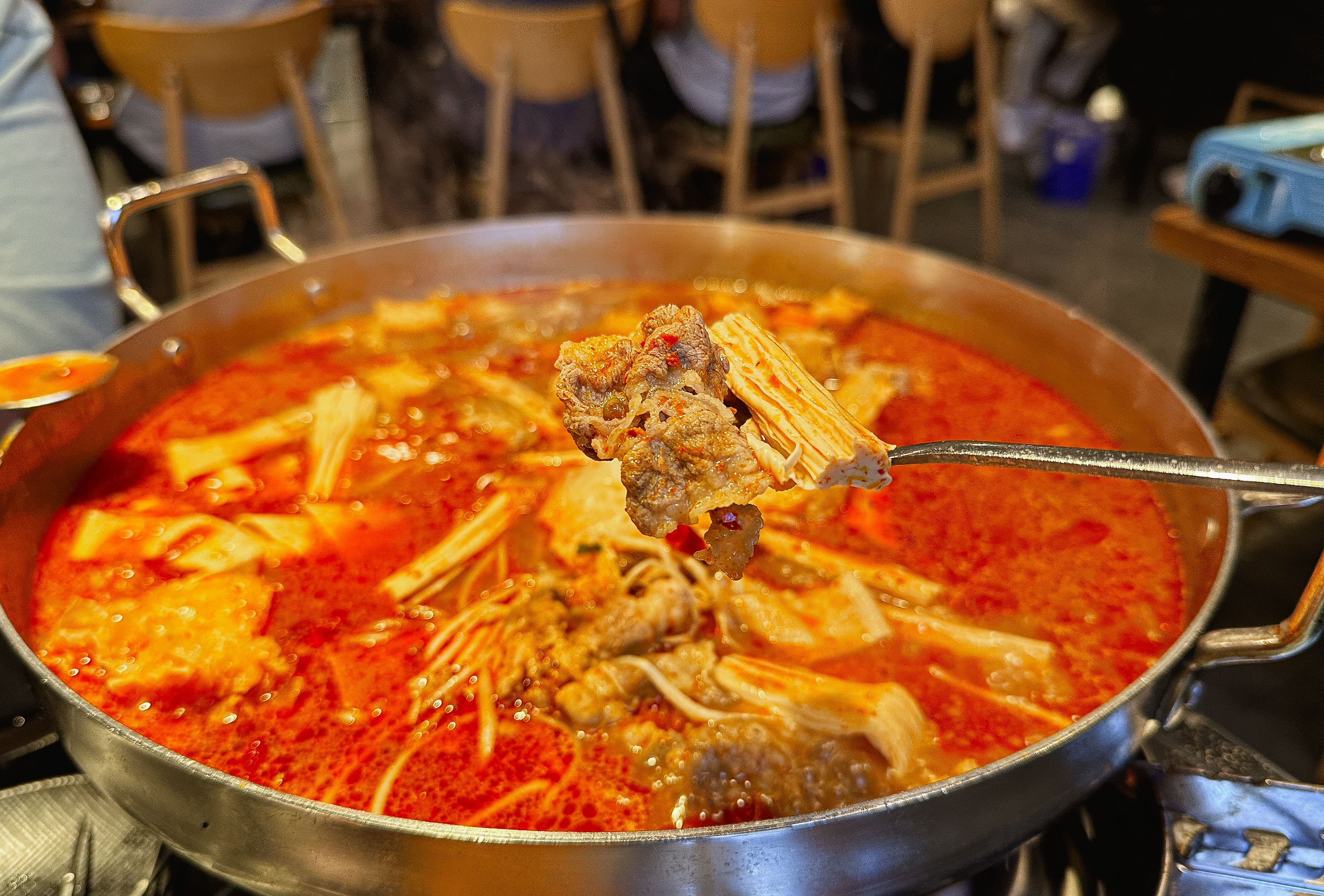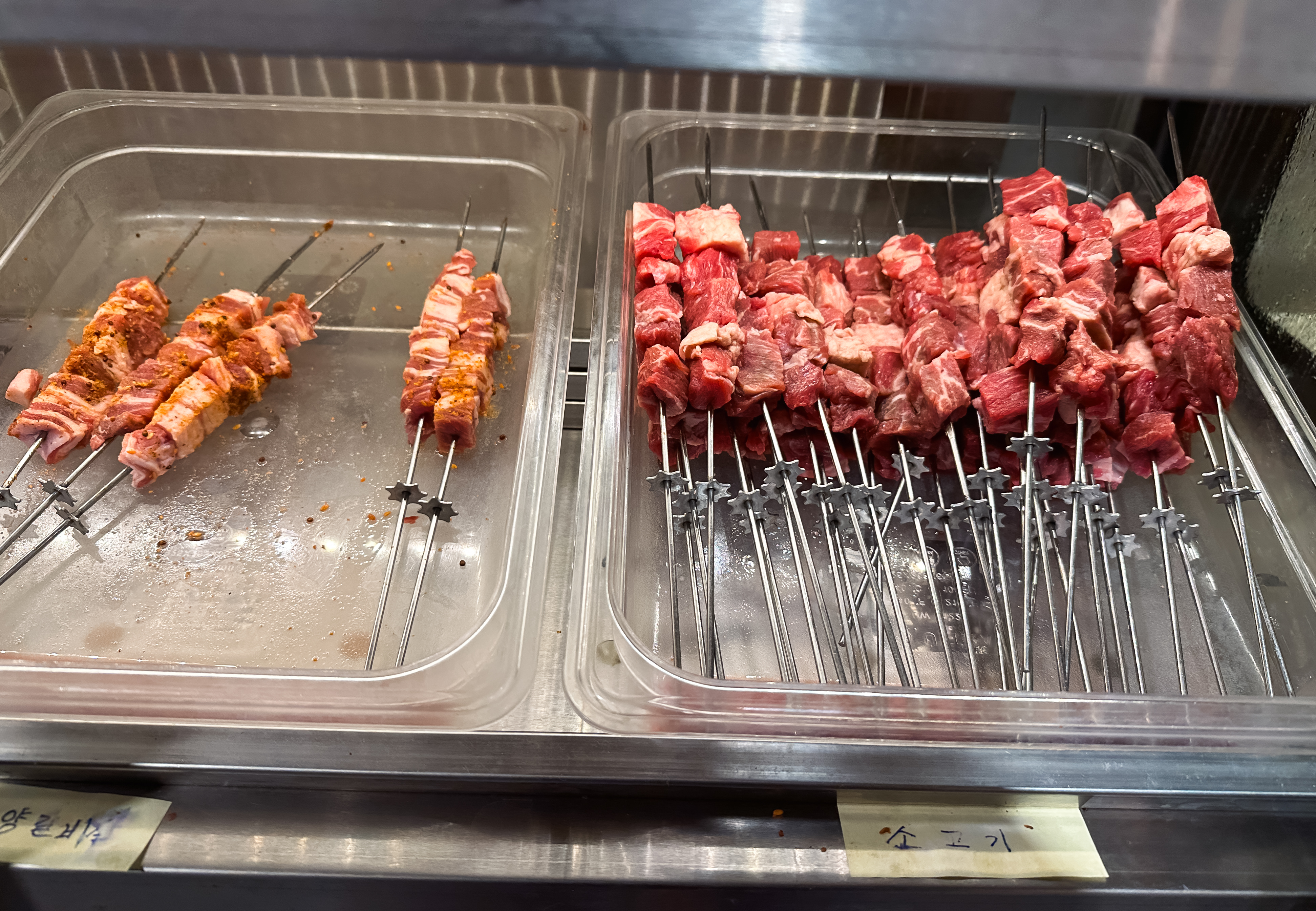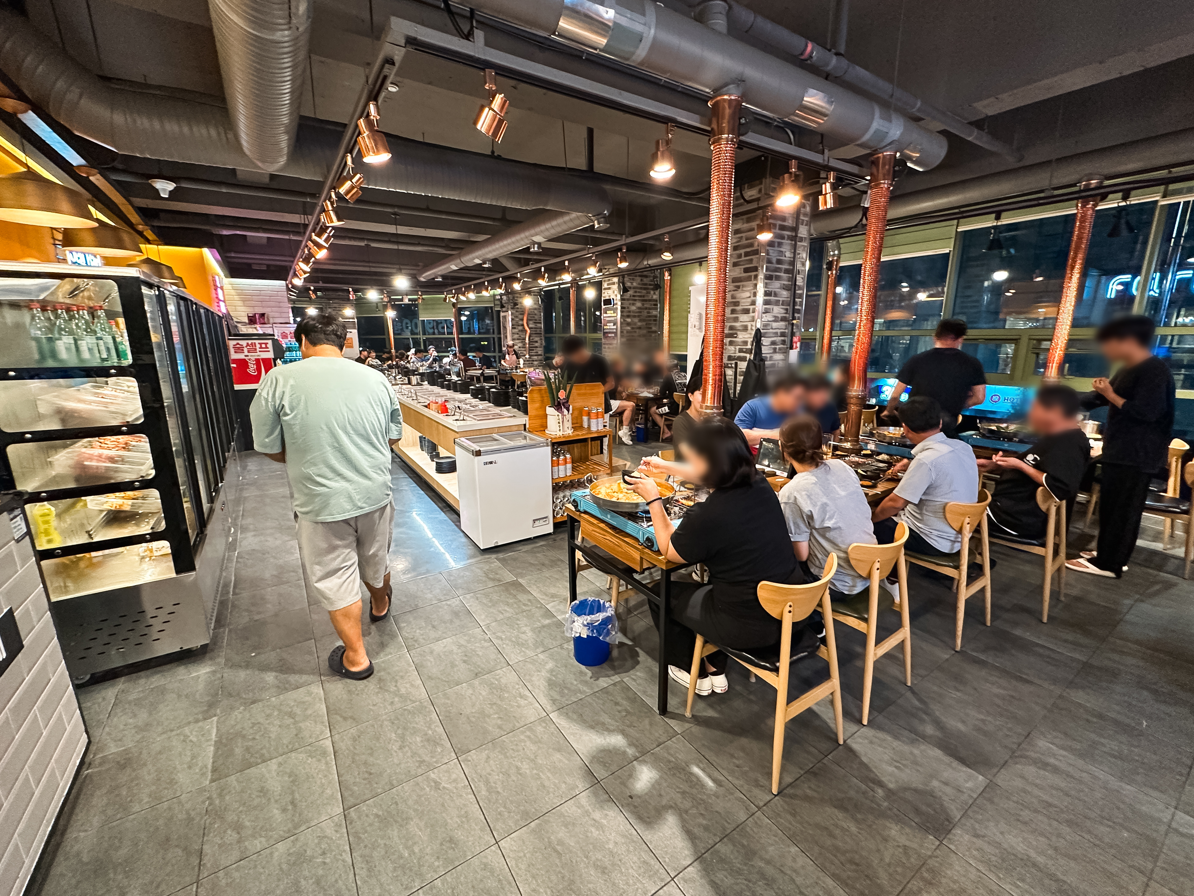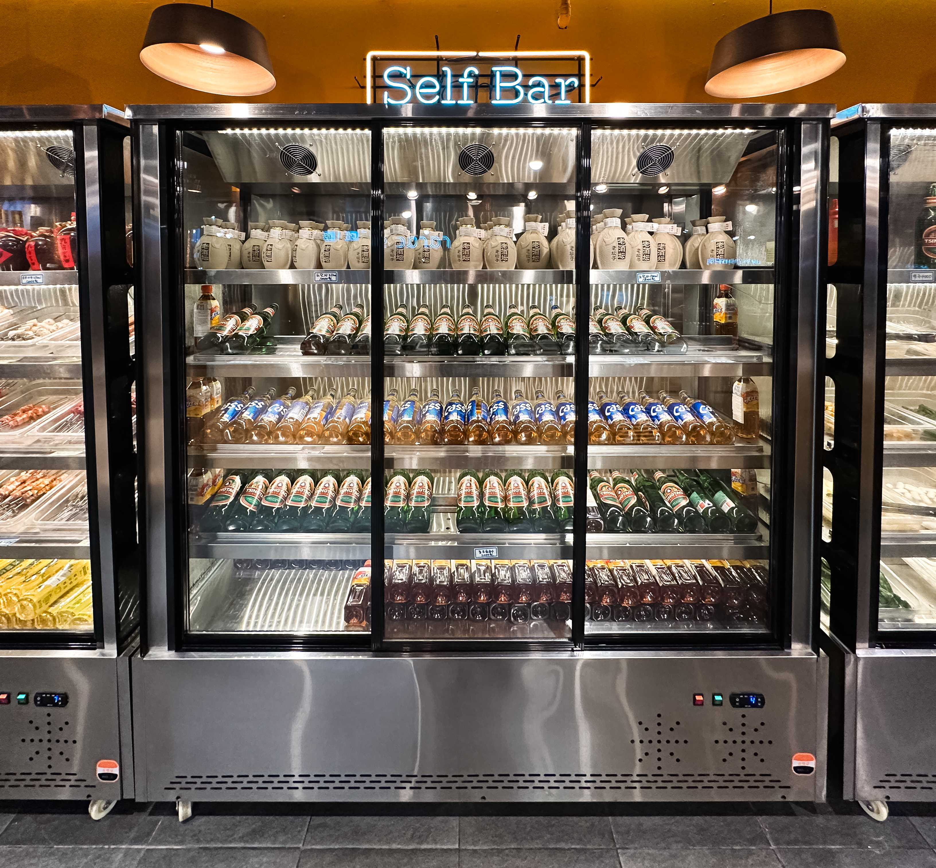 천향 양꼬치 뷔페에 들어가면 일단 양꼬치 굽는 있는 화로에 숯불을 넣어줍니다. 그리고 양꼬치와 함께 먹을 마라탕을 준비해 주십니다. 이제, 재료들을 접시에 담으러 냉장고로 향했습니다.