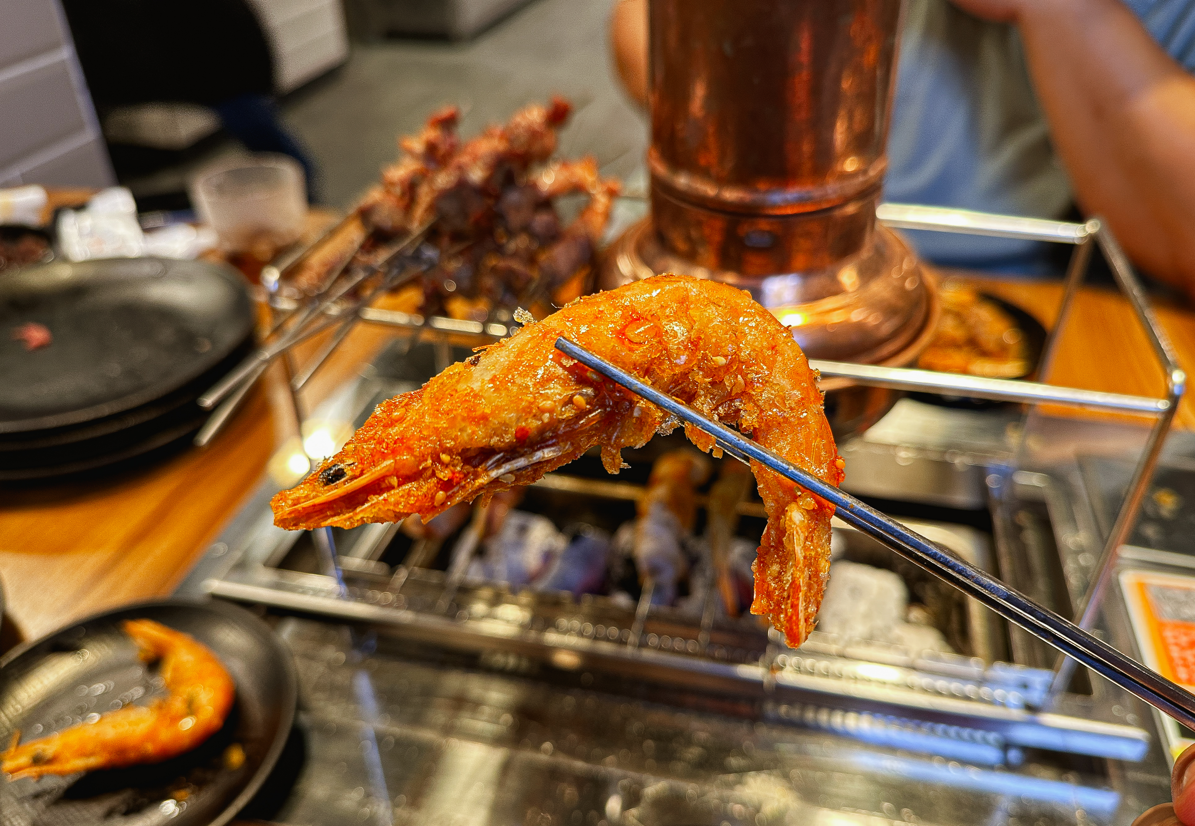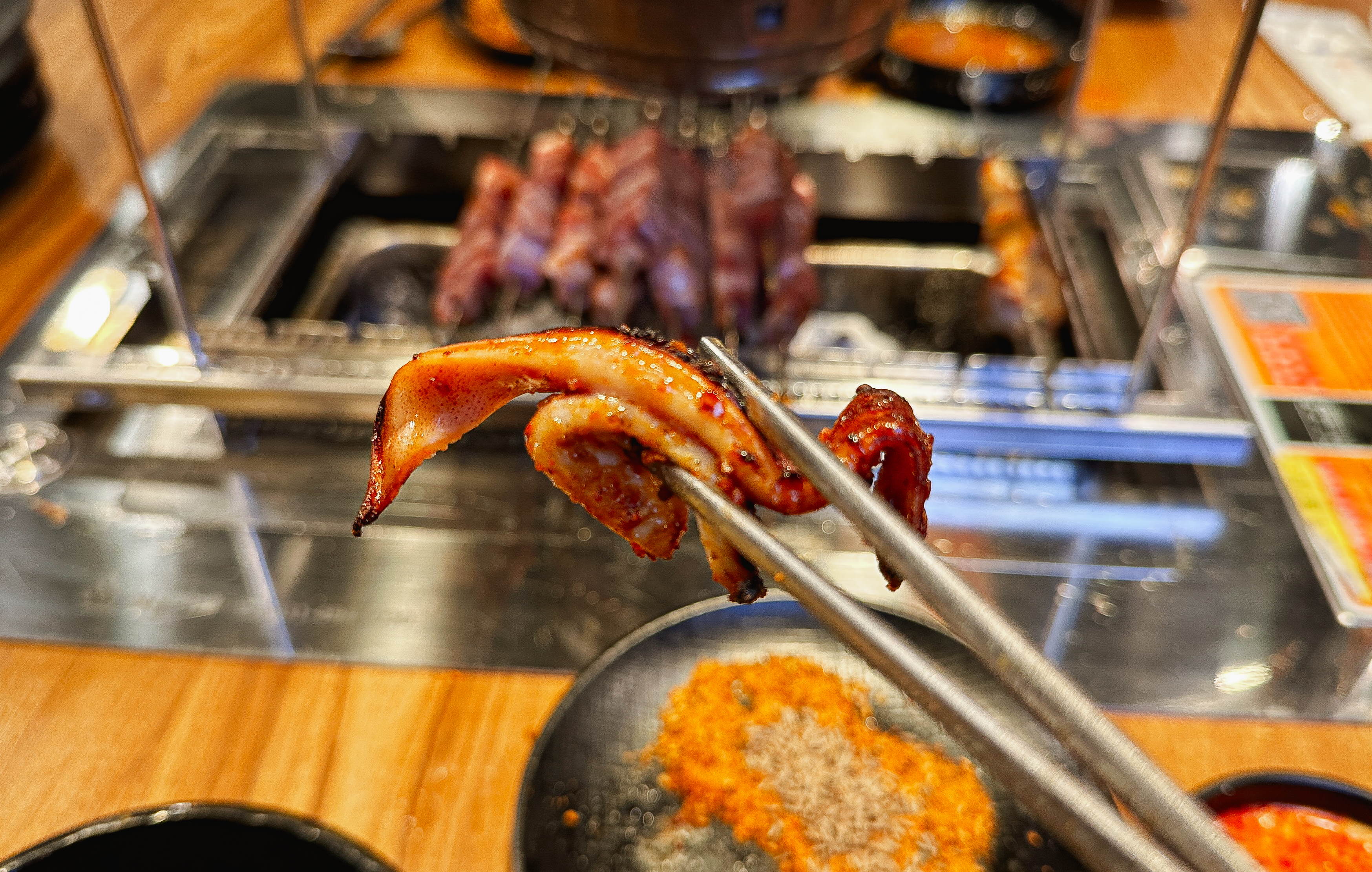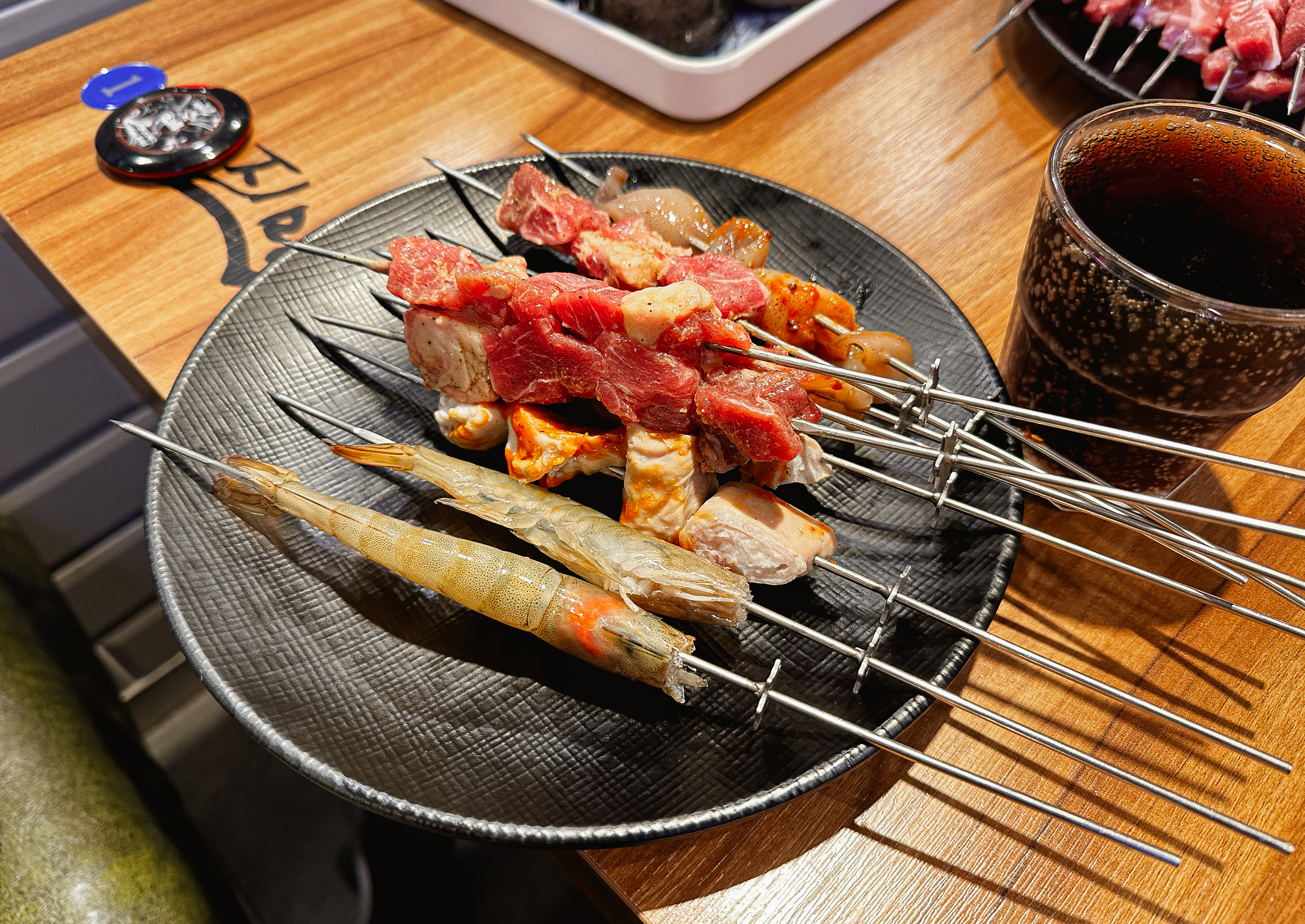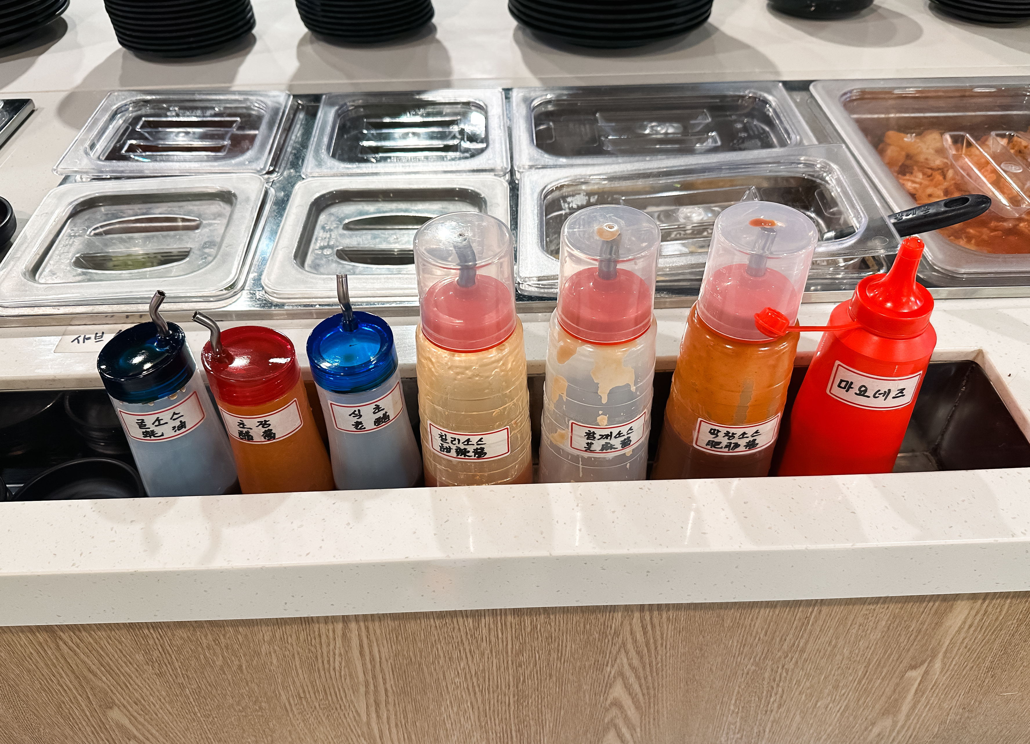 냉장고에서 닭염통부터 양갈비살, 양꼬치, 양념양꼬치, 오징어완자, 막창, 소시지, 소고기, 새우 등 입맛에 맞게 꺼내 먹으면 되었고, 양념도 굴소스, 초장, 식초, 칠리소스, 참깨소스, 막창소스, 마요네즈 등으로 취향껏 골라먹을 수 있도록 되어있었습니다.