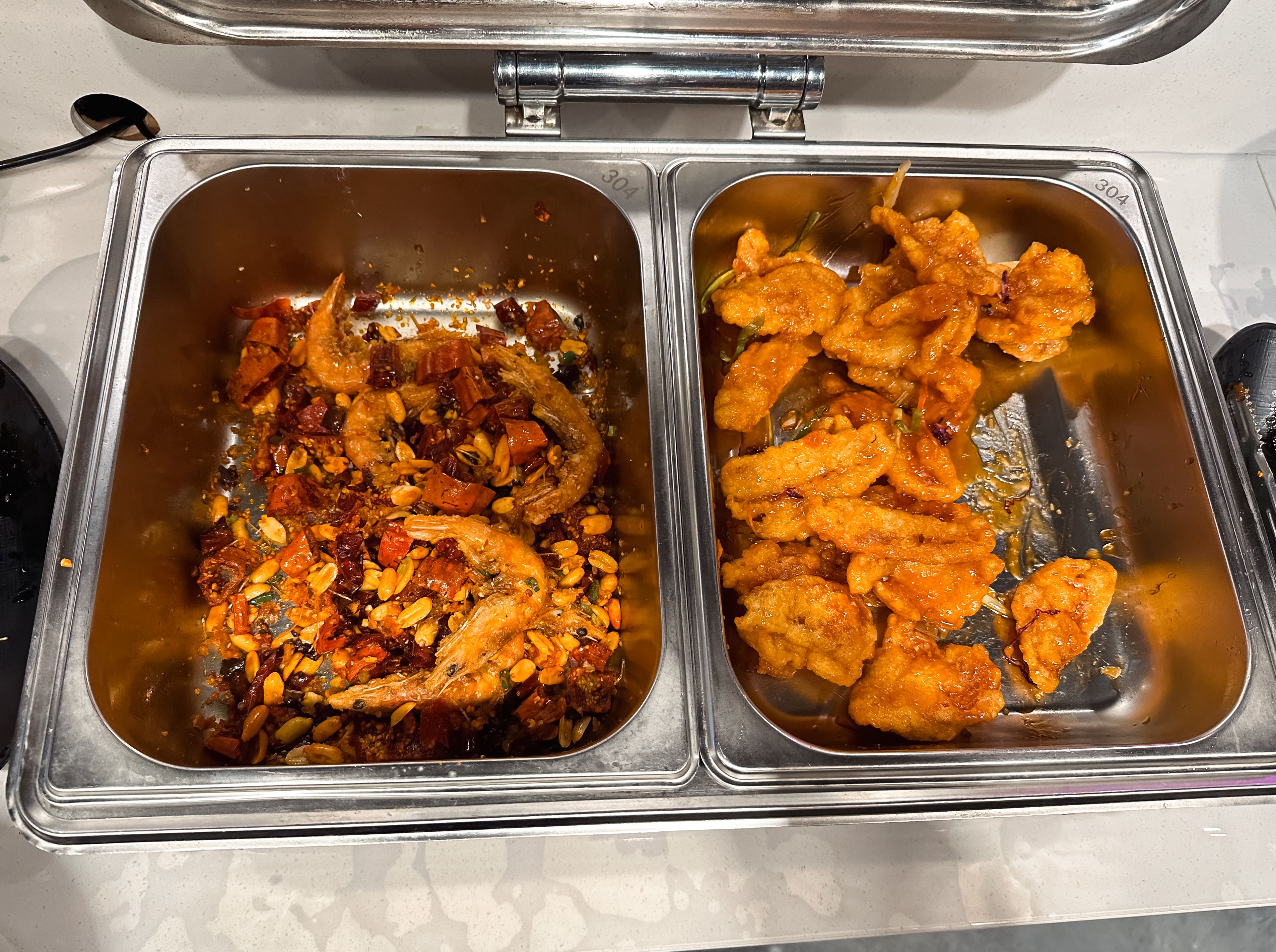 다른 곳에는 미리 조리되어 있는 음식들도 골라 담을 수 있었는데, 마파두부와 새우요리 꿔바로우 등 골라담을 수 있었습니다. 음료수나 커피도 셀프코너로 마련되어 있어서 직접 디스펜서를 통해 뽑아먹을 수 있어서 좋았습니다.