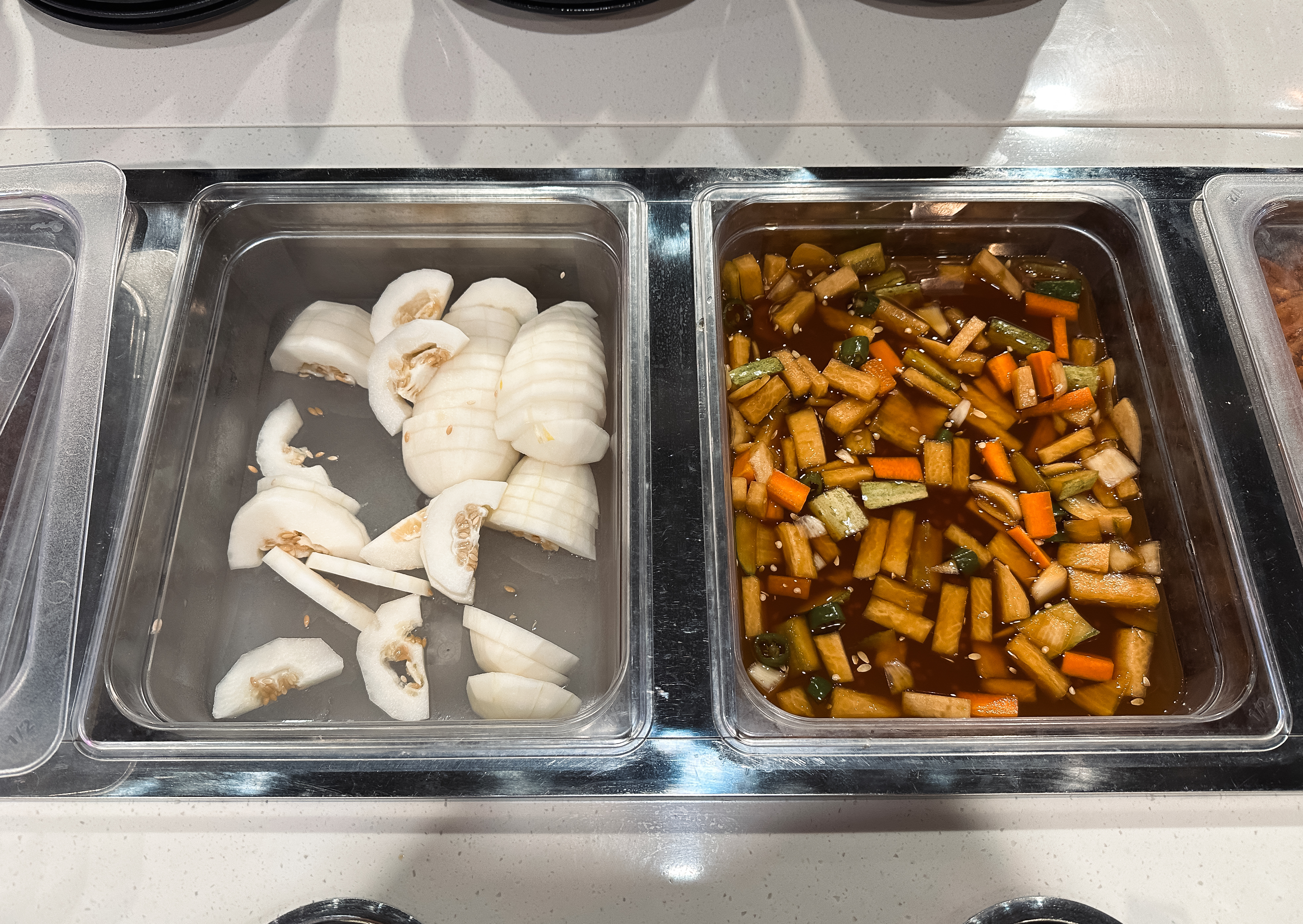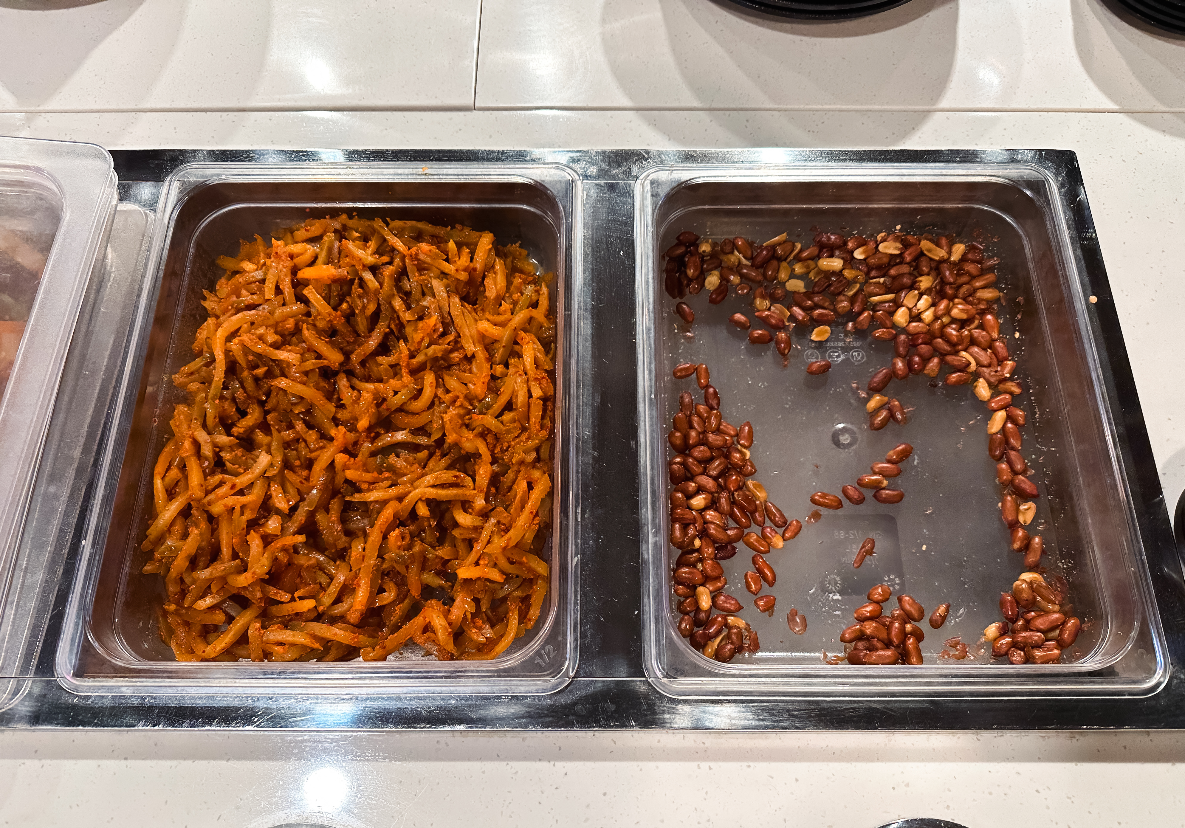 다른 곳에는 미리 조리되어 있는 음식들도 골라 담을 수 있었는데, 마파두부와 새우요리 꿔바로우 등 골라담을 수 있었습니다. 음료수나 커피도 셀프코너로 마련되어 있어서 직접 디스펜서를 통해 뽑아먹을 수 있어서 좋았습니다.