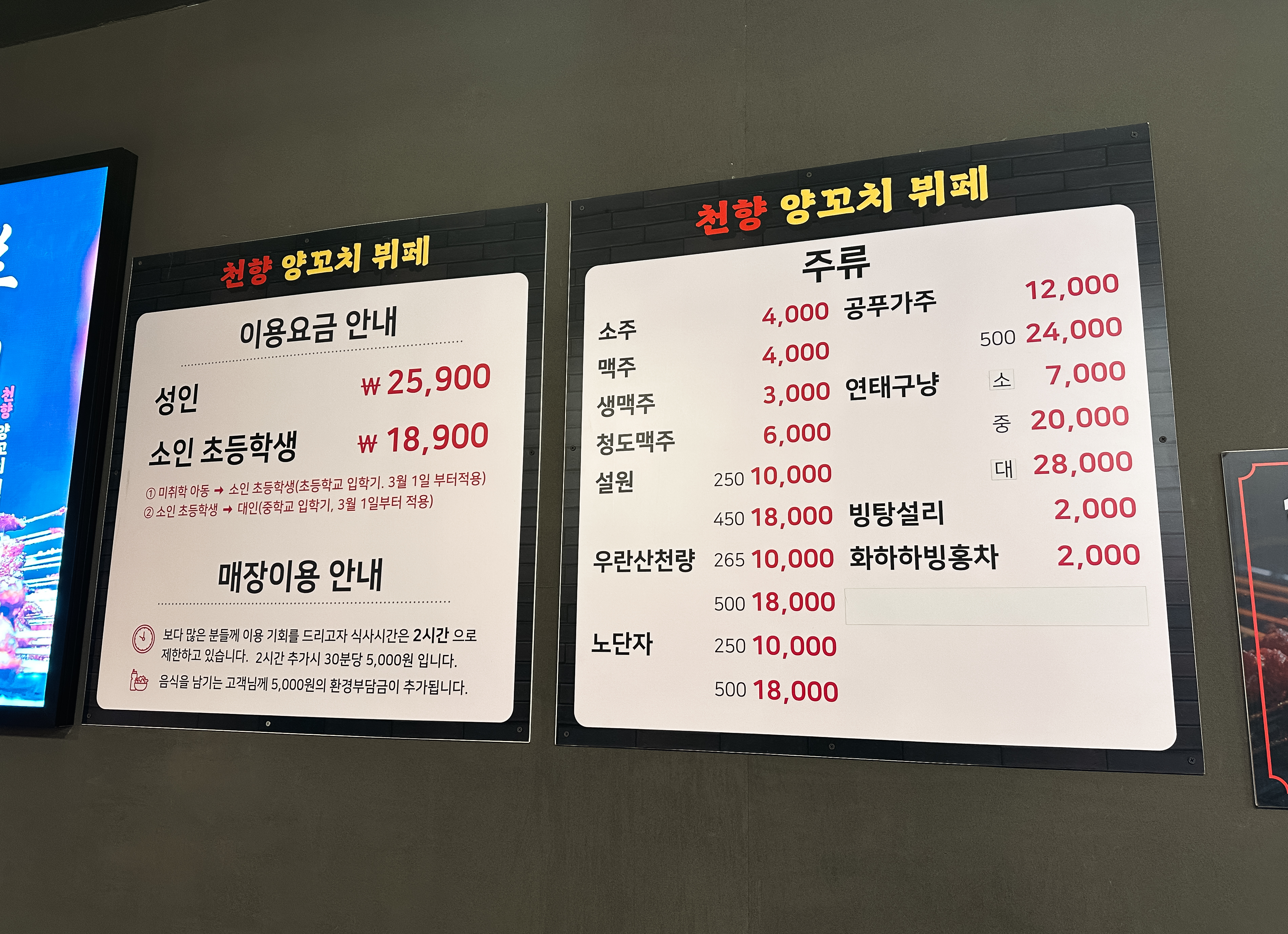 재료들을 구경하기 전에 천향 양꼬치 뷔페의 메뉴부터 살펴보시죠. 양꼬치 무한리필 이용금액은 성인 25,900원, 소인 18,900원 이었습니다. 이용시간은 2시간으로 제한되고 있다고 하며, 음식을 남기면 5,000원의 환경부담금이 추가된다고 합니다.