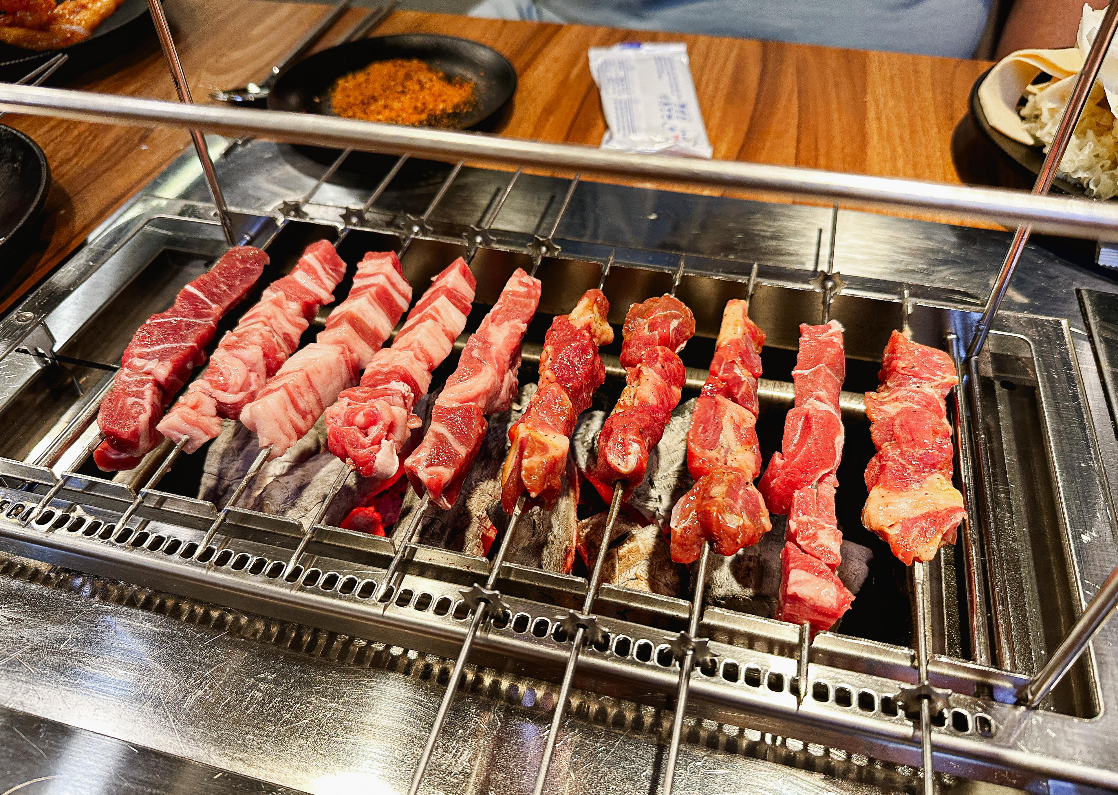 냉장고에서 닭염통부터 양갈비살, 양꼬치, 양념양꼬치, 오징어완자, 막창, 소시지, 소고기, 새우 등 입맛에 맞게 꺼내 먹으면 되었고, 양념도 굴소스, 초장, 식초, 칠리소스, 참깨소스, 막창소스, 마요네즈 등으로 취향껏 골라먹을 수 있도록 되어있었습니다.