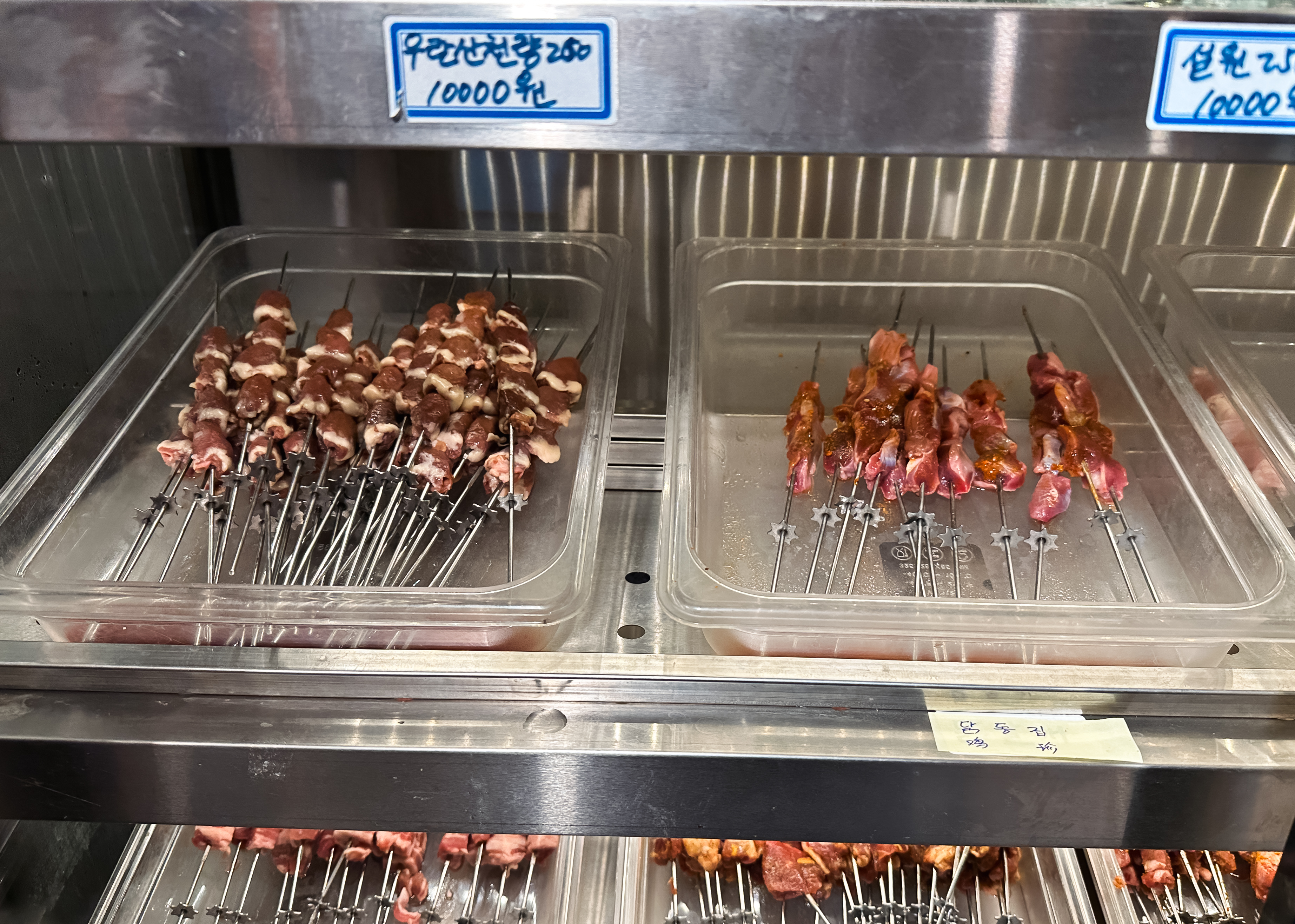 냉장고는 크게 양꼬치, 주류, 마라탕 재료로 구분되어 재료를 한눈에 보기 쉽게 진열되어 있었습니다. 양꼬치는 우리가 흔히 먹는 양꼬치 외에도 소고기나 양념을 한 양꼬치, 새우, 오징어, 막창 등 다양하게 구비되어 있었습니다. 마라탕 재료들도 마찬가지로 전문점만큼은 아니었지만, 다양한 재료들이 있었습니다.