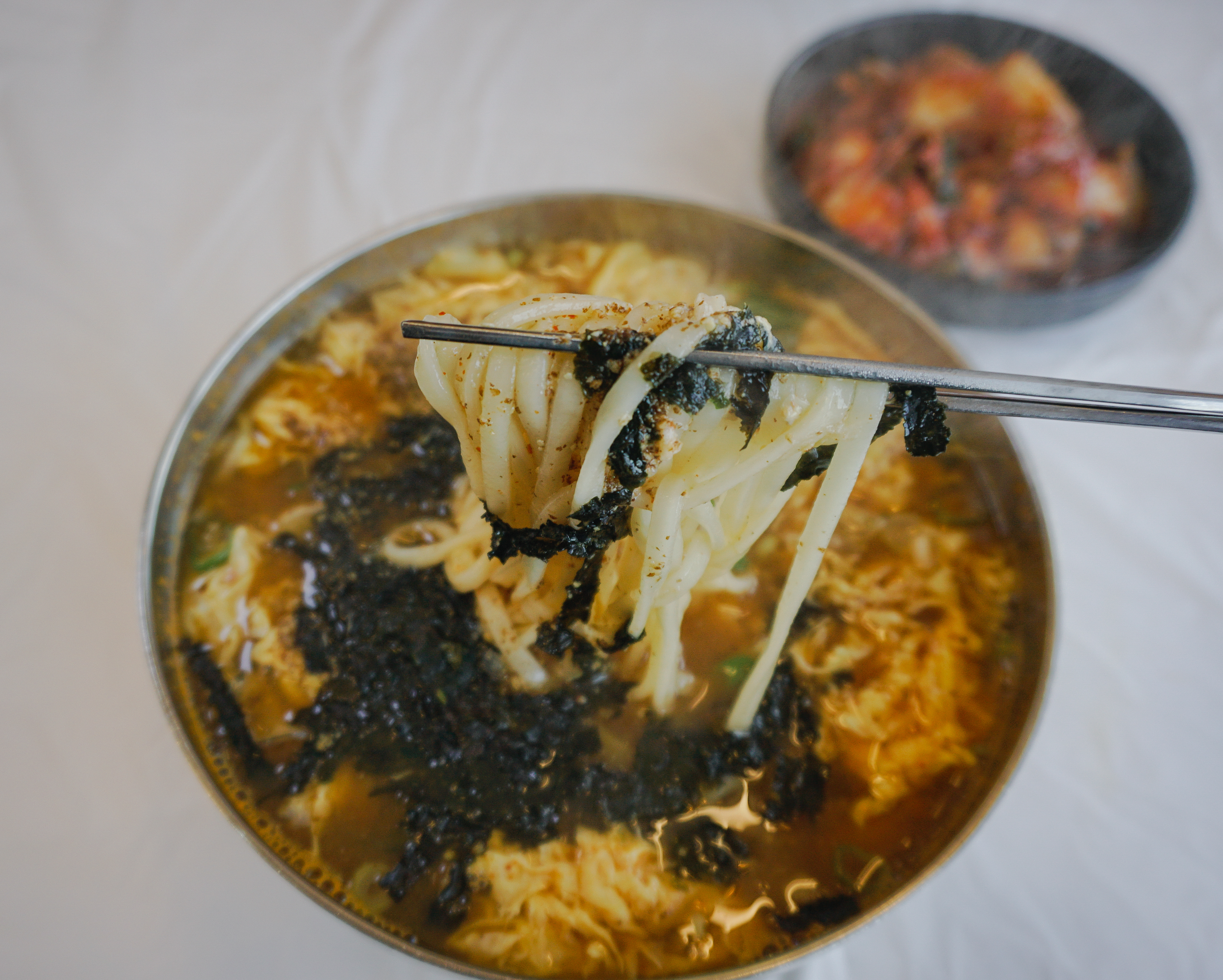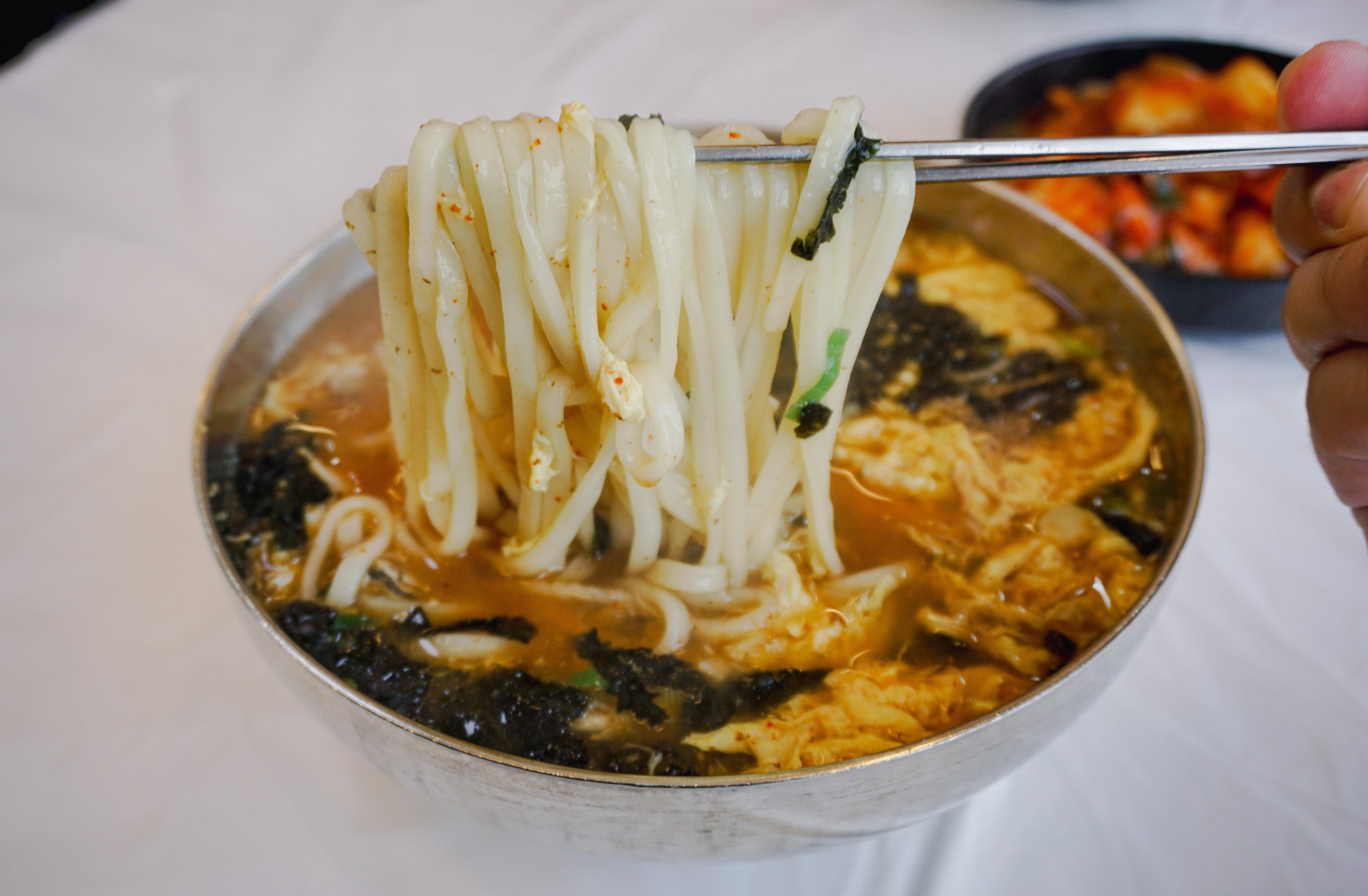 결성칼국수의 굴칼국수와 배추김치가 나왔습니다. 굴칼국수는 제가 생각했던 것보다는 맑고 빨간 국물을 하고 있었습니다. 참, 칼국수집답게 배추김치는 달달하고 입에 감기는 감칠맛이 있어 맛있었습니다.