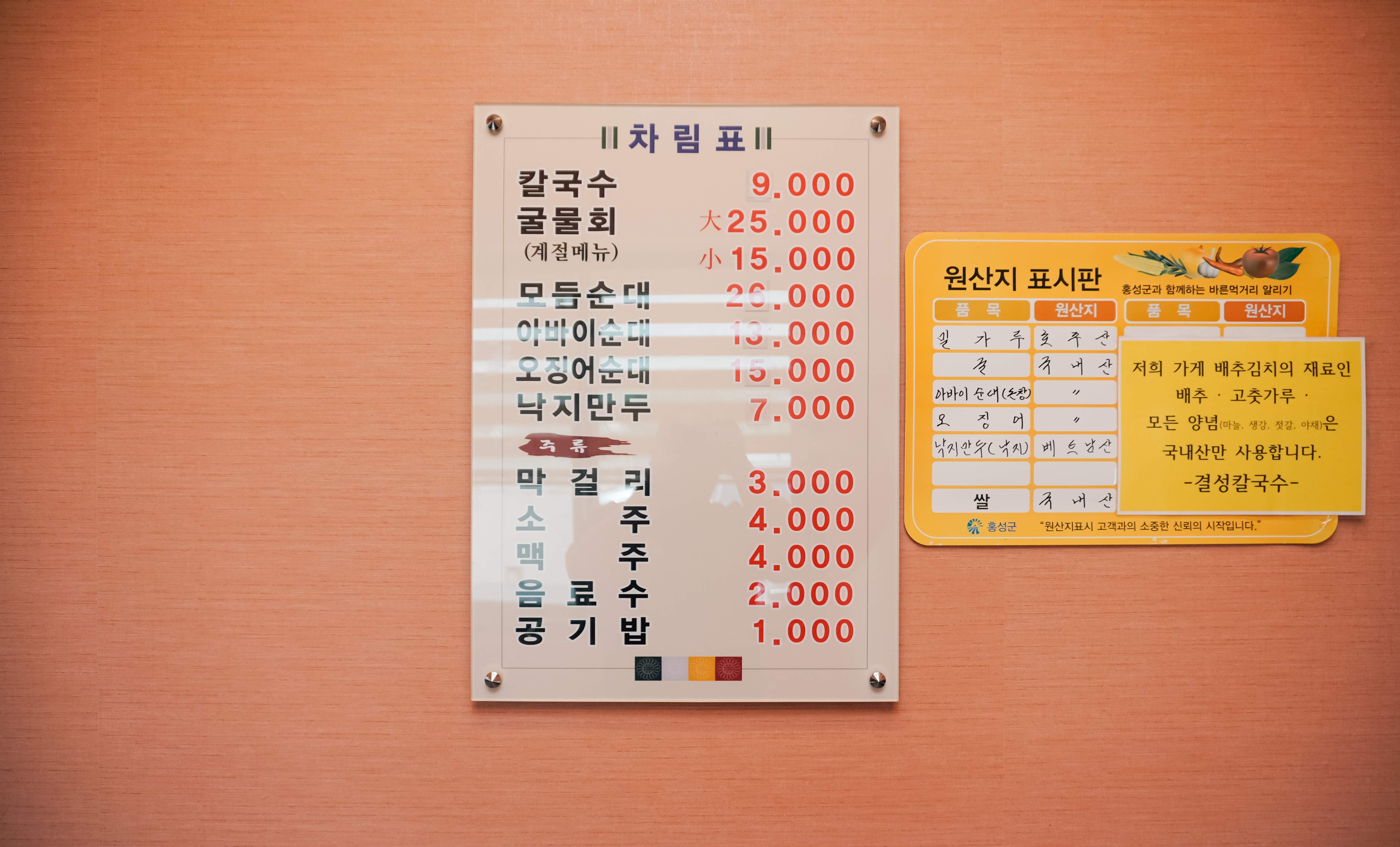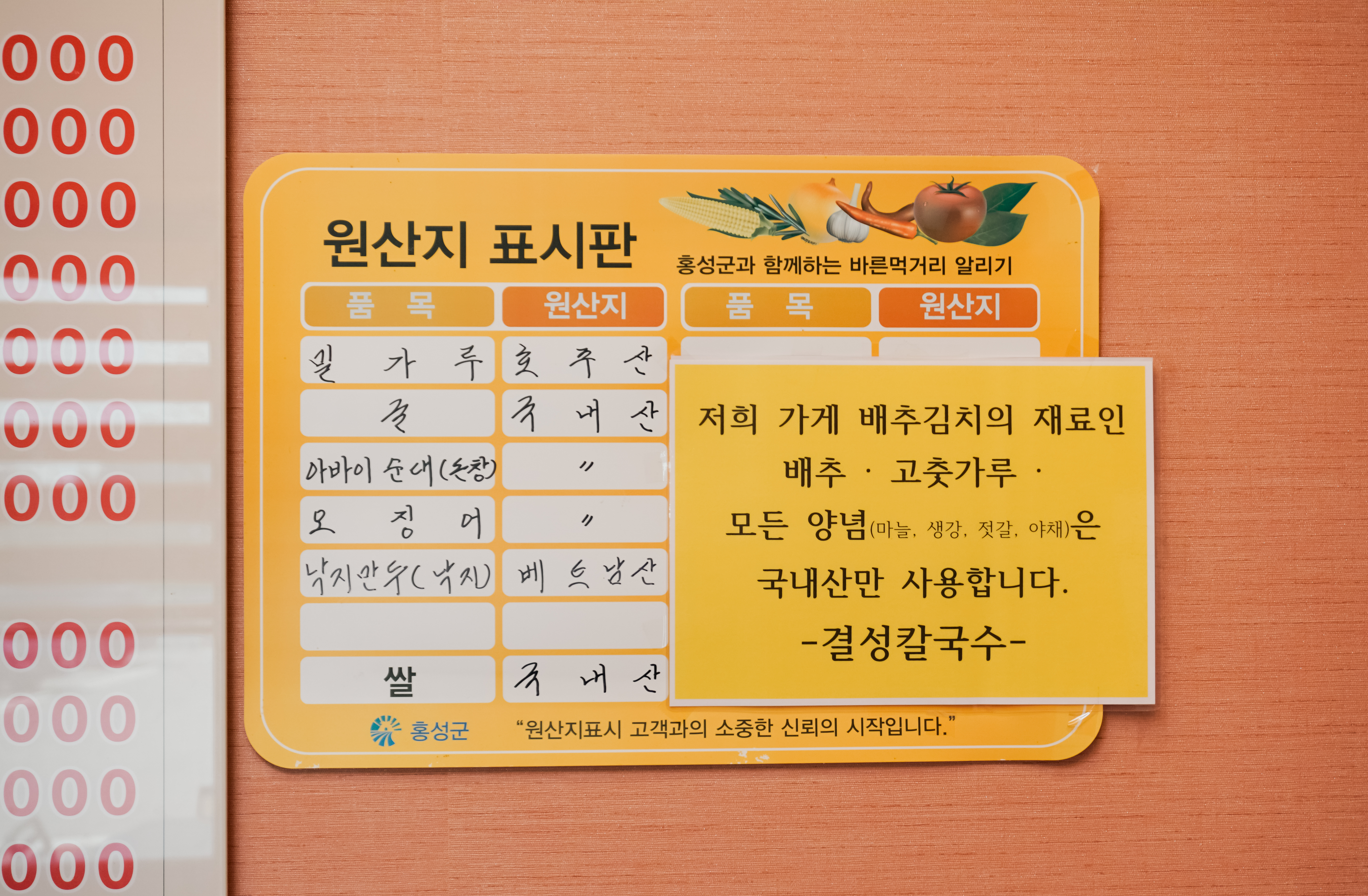 홍성 결성칼국수의 메뉴는 (굴)칼국수, 굴물회, 모듬순대, 아바이순대, 오징어순대, 낙지만두 등이 있었습니다. 메뉴판 옆에 있는 원산지 표시를 보니 결성칼국수 배추김치의 재료는 모두 국내산을 사용하고 있다고 하더라고요.