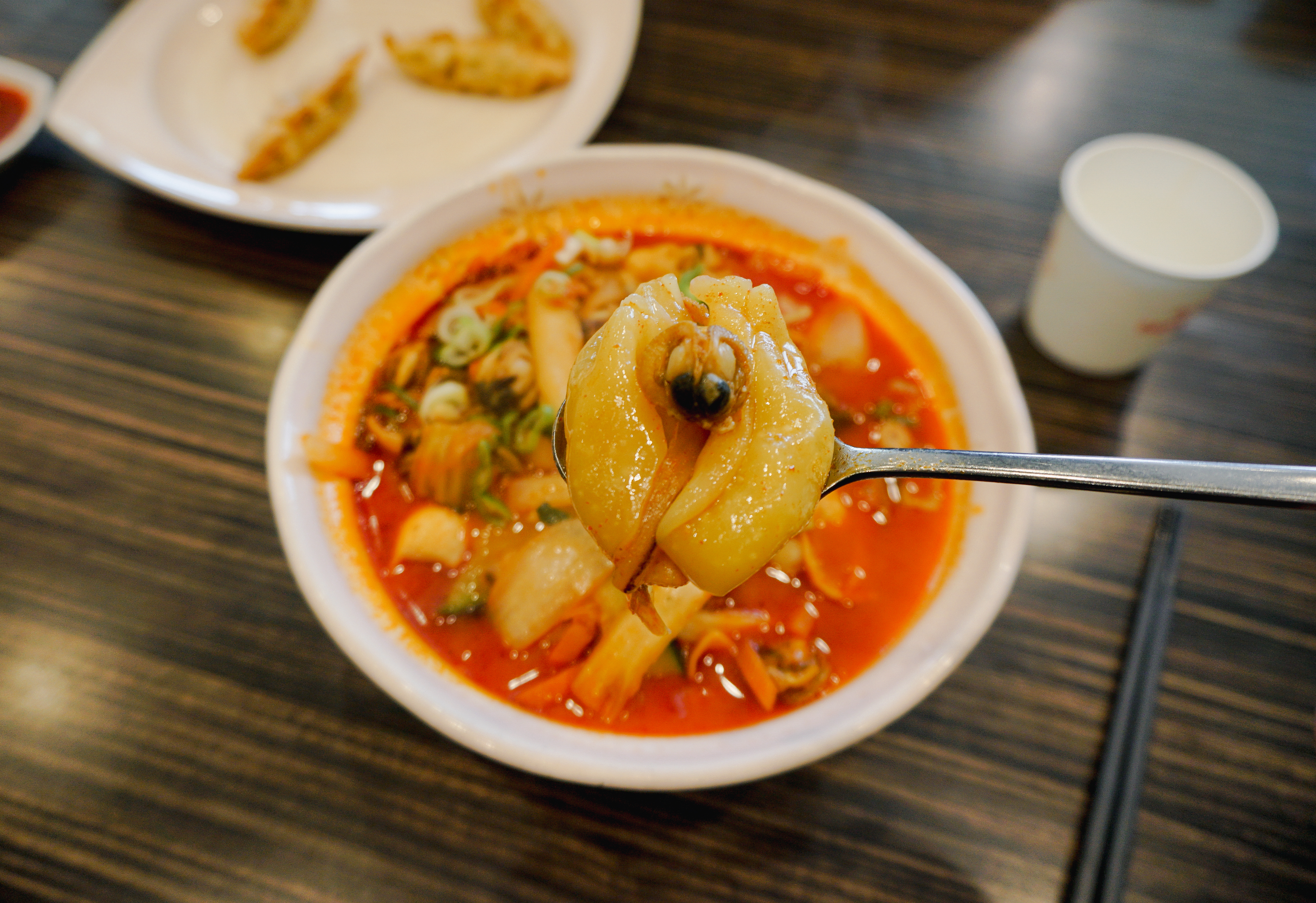 짬뽕지존의 수제비짬뽕과 군만두가 나왔습니다. 수제비짬뽕은 면대신 수제비를 짬뽕으로 만든 메뉴인데, 면은 국물이 잘 튀는 반면 수제비짬뽕은 먹기 좋은 크기의 수제비를 숟가락으로 떠서 먹으면 되니까 국물이 튀거나 하지 않아서 좋더라고요.