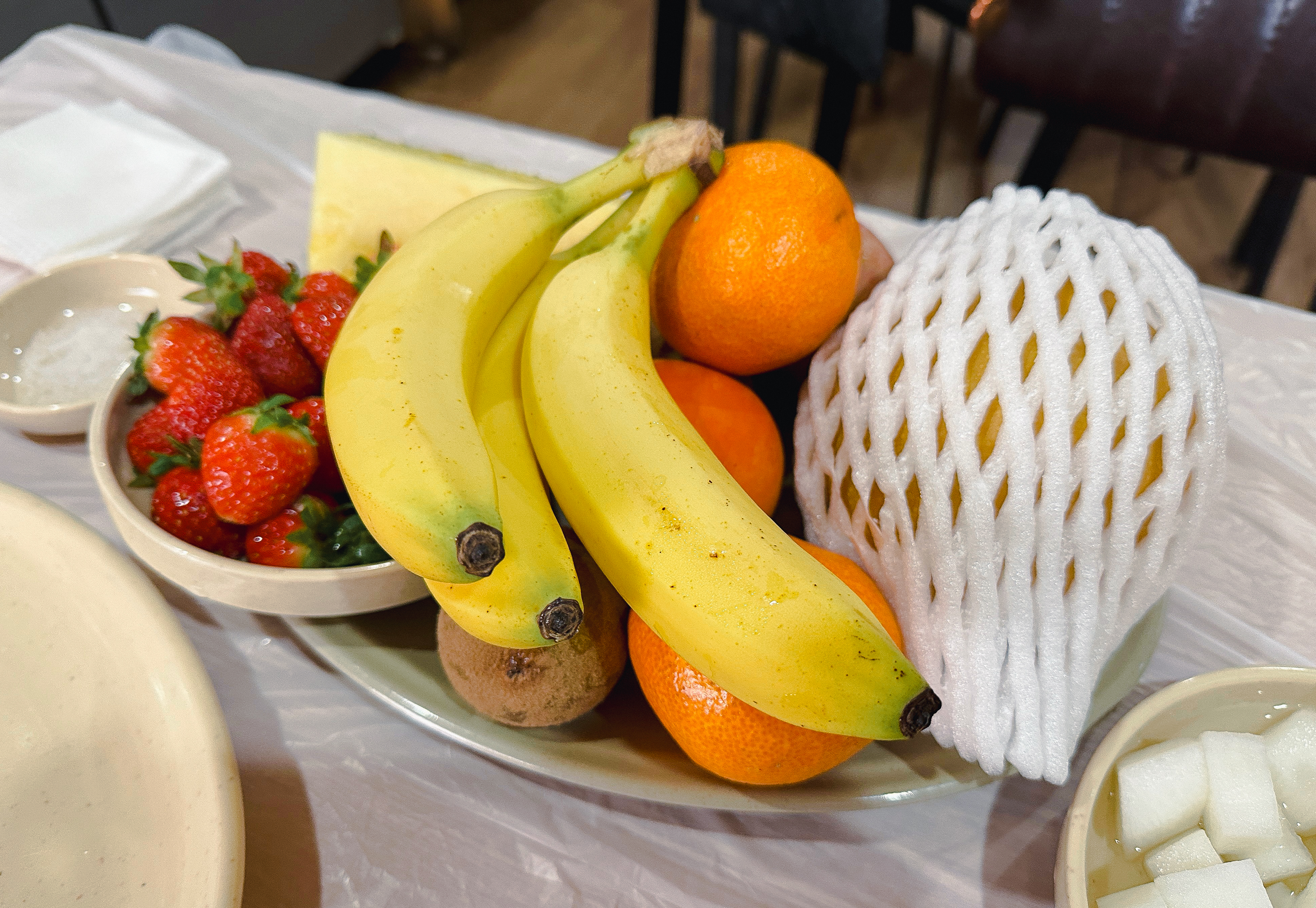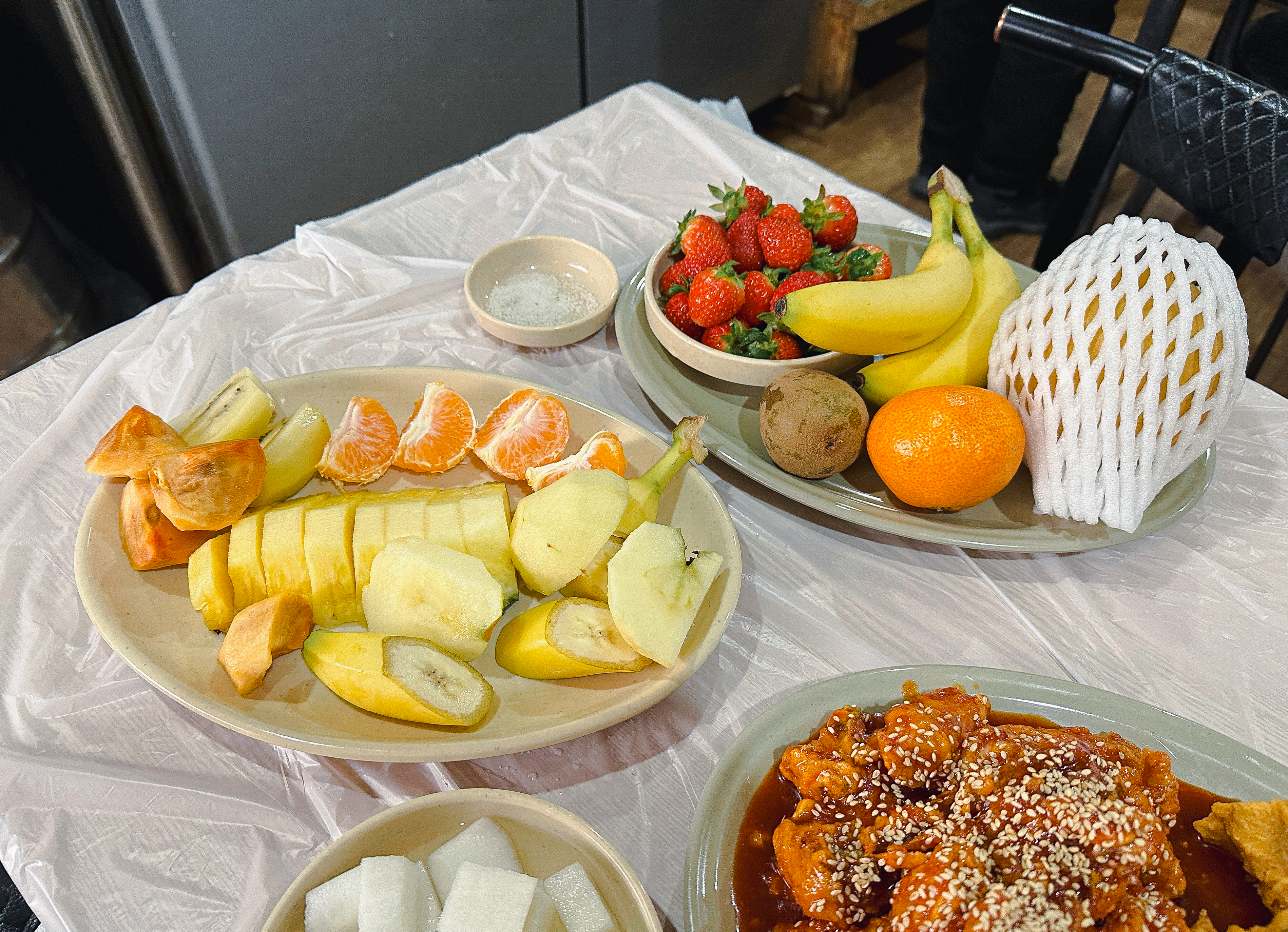 파인애플부터 귤, 키위, 감, 바나나 사과, 배, 딸기 등 계절과일들을 접시 한가득 담아주고 계셨고, 부족하면 더 주기도 하신다고 하더라고요. 과일안주를 서비스로 내어주시게 된 게 학생들이 술을 마실 때 속 버린다고 주머니 사정이 어려운 학생들을 위해 서비스로 제공하시다가 이제는 청주 멕시칸 양념치킨 우암점만의 공식 서비스 안주가 되어버렸더라고요.