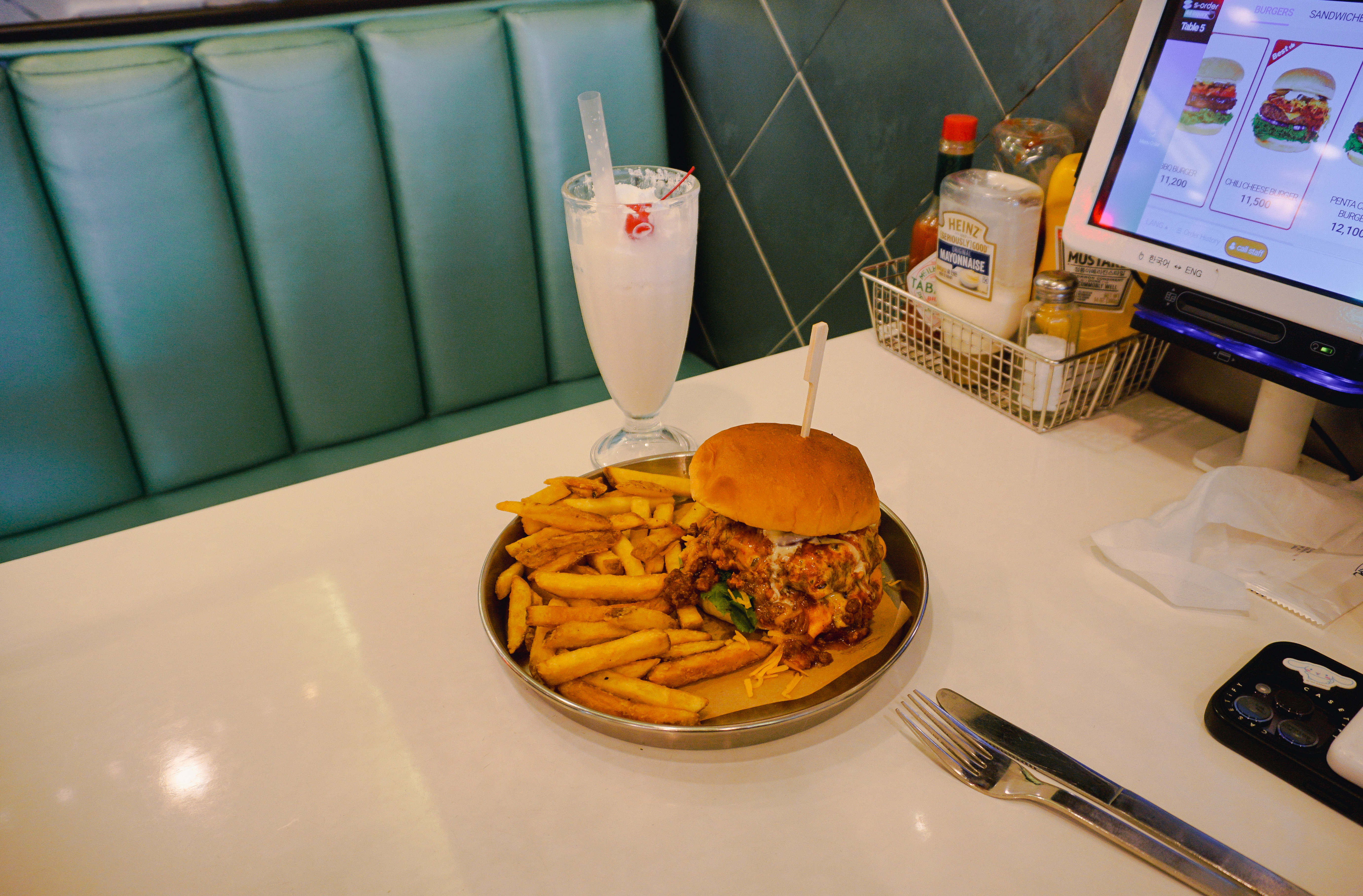 패드를 통해 결제를 하면 직접 메뉴를 자리까지 가져다주더라고요. 패드사용이 익숙하지 않아서 손에 익지는 않았지만, 직관적으로 주문한 내역 등을 볼 수 있어서 좋더라고요. 제가 주문한 메뉴는 감자튀김을 추가한 칠리치즈버거에 바닐라쉐이크입니다.