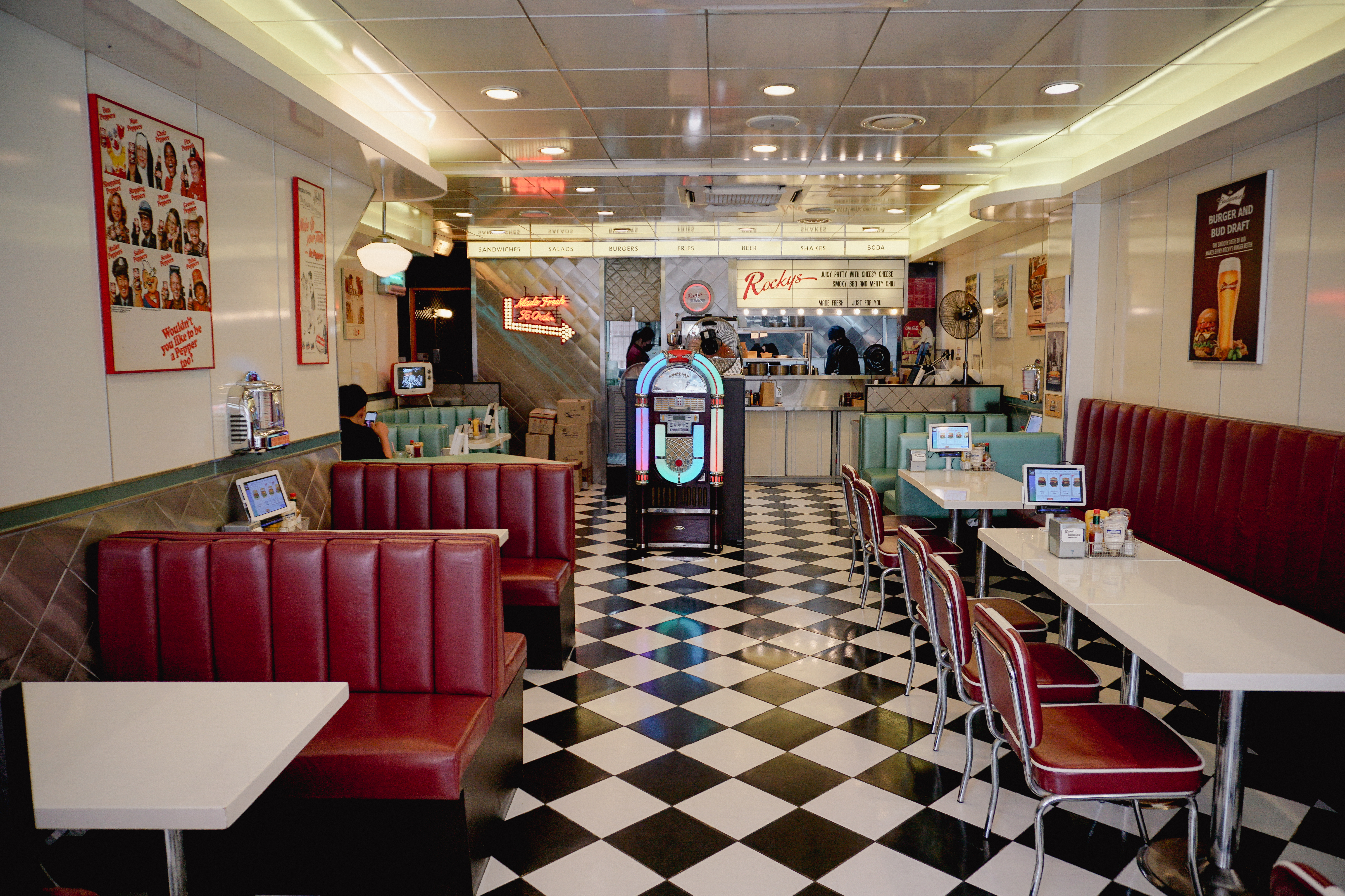 가게 내부의 모습은 이렇습니다. 가운데 주크박스가 있고 테이블에도 이국적인 소품이 놓여있었습니다. 노래는 따로 주크박스로 재생하는 것 같지는 않았지만, 미국의 식당을 재현하려는 노력이 보이더라고요.