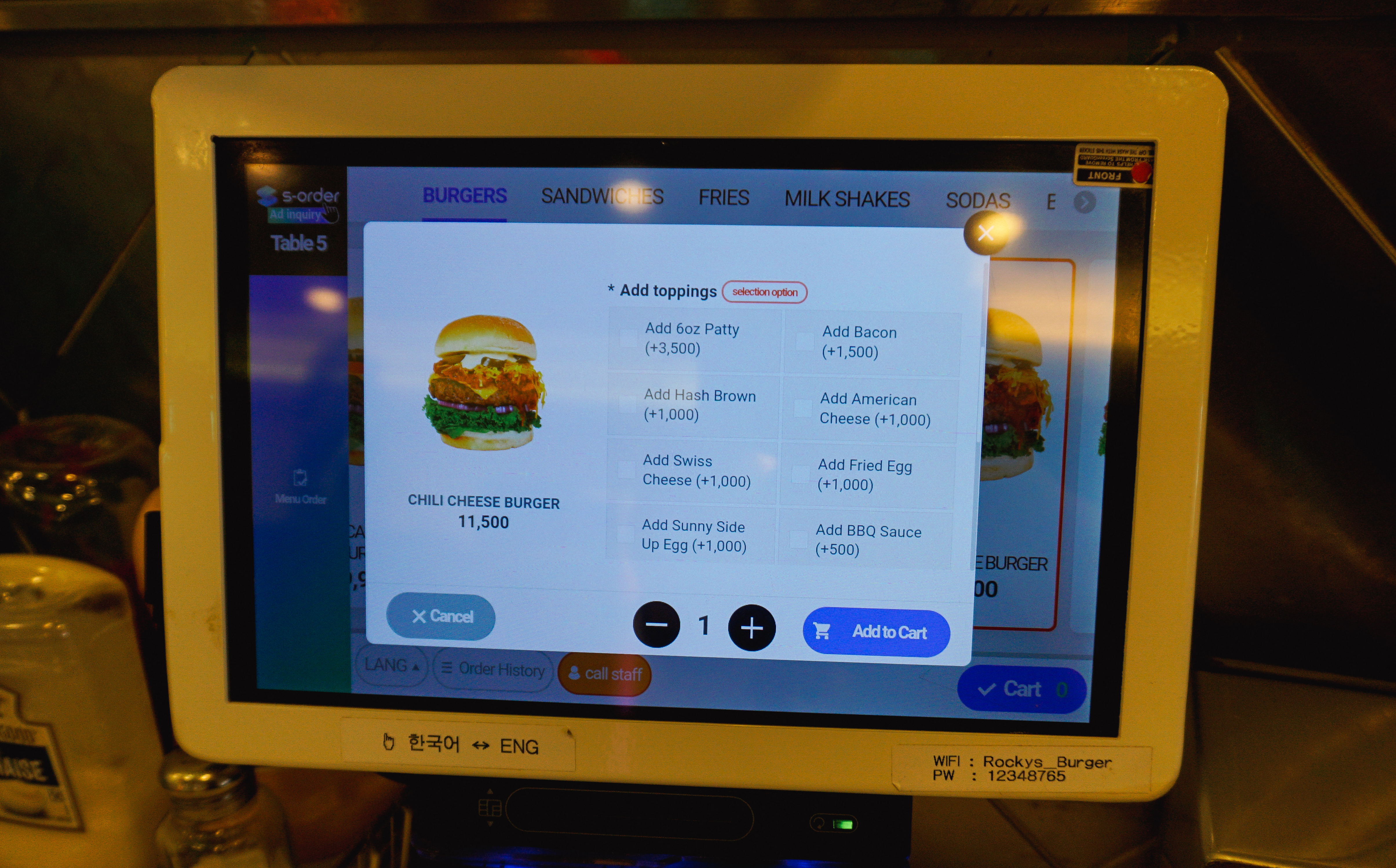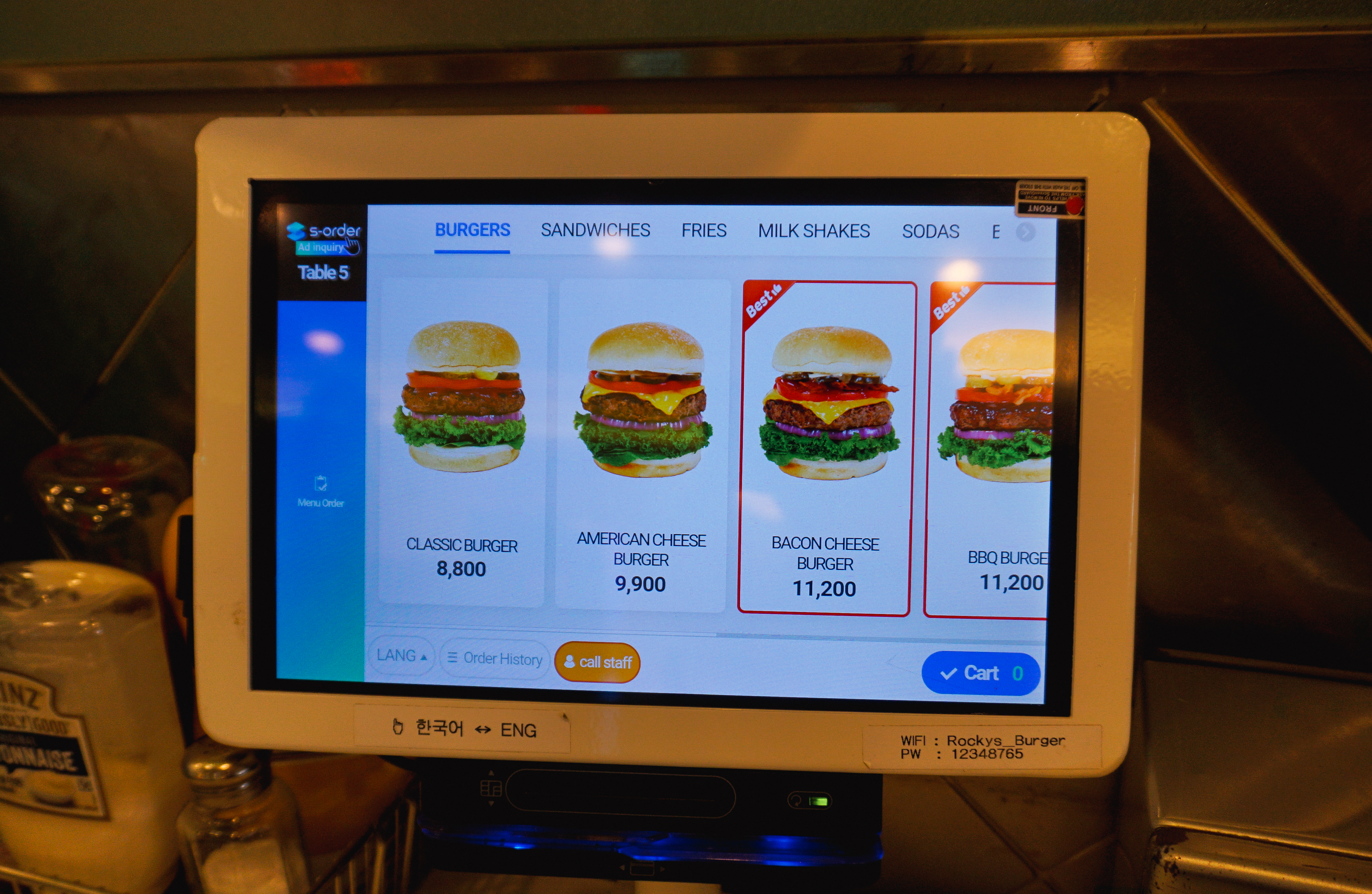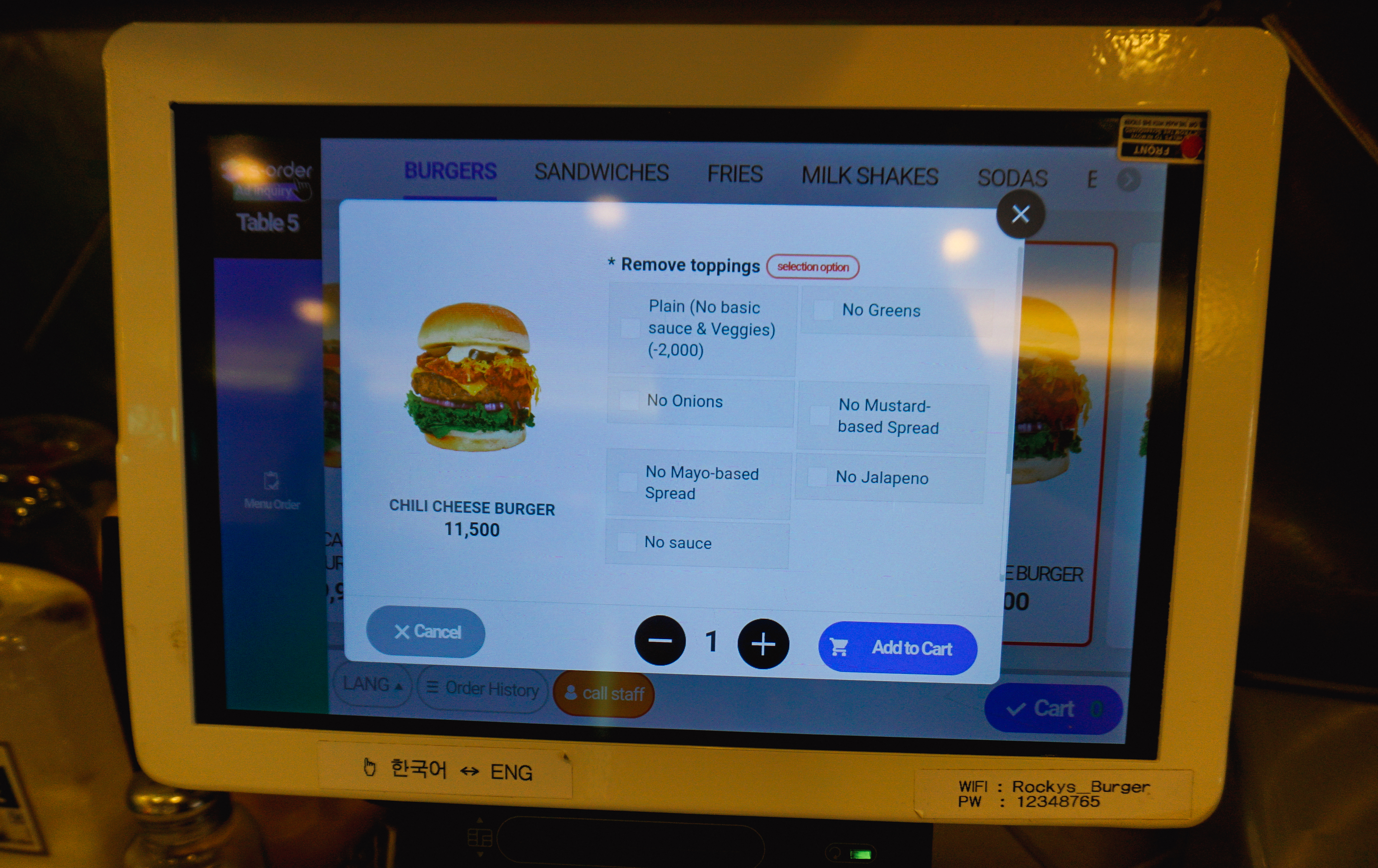록키즈버거의 메뉴는 테이블 위에 놓여있는 패드를 통해 주문할 수 있었습니다. 메뉴는 클래식버거, 아메리칸치즈버거, 베이컨치즈버거, BBQ 버거, 칠리치즈버거, 펜타치즈버거, 그릴드치킨버거, 필리치즈스테이크, 클럽샌드위치, 감자튀김, 테터톳즈, 베이컨치즈감자튀김, 칠리치즈감자튀김, (바닐라, 딸기, 초코, 카라멜, 오레오, 누텔라)쉐이크 등이 있었고, 햄버거의 토핑을 디테일하게 빼거나 추가할 수 있어서 좋았습니다.