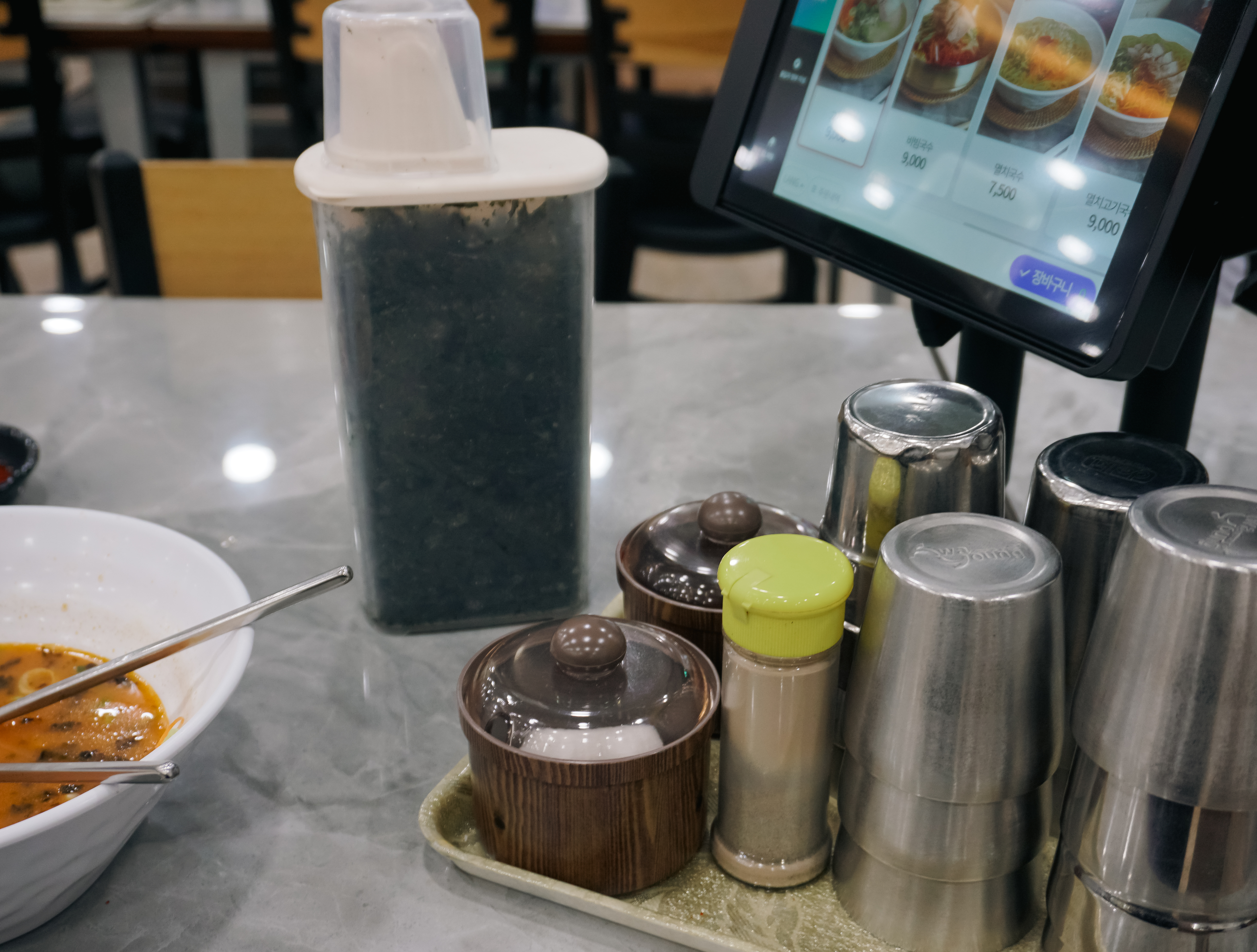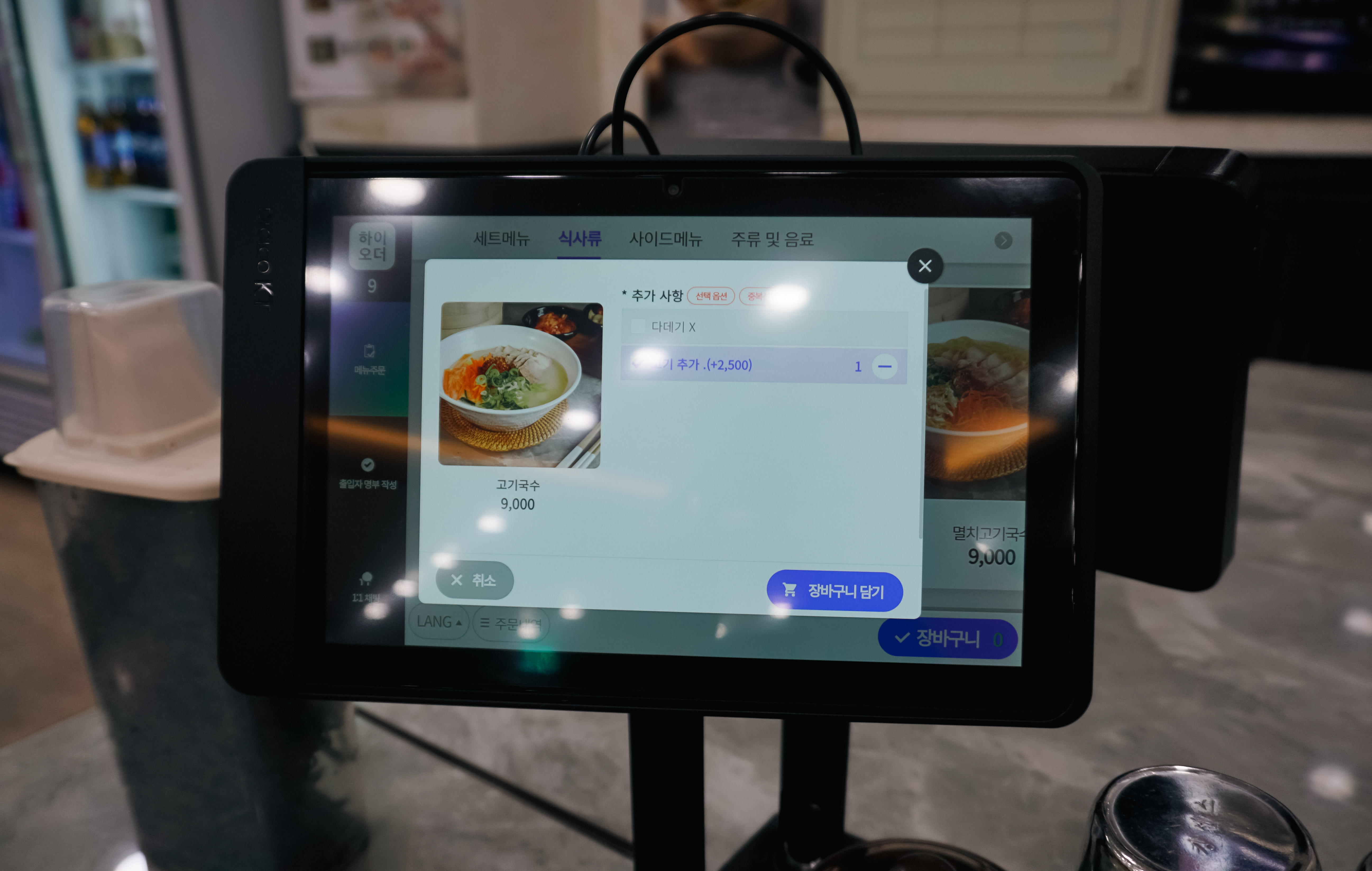 일도이동 제주 삼대국수회관의 메뉴는 이렇습니다. 고기국수, 멸치국수, 비빔국수, 멸고기국수, 돼지국밥, 도가니스지국수, 열무국수, 콩국수, 도가니스지수육, 아강발, 돔베고기, 물만두, 세트메뉴 등이 있었습니다. 메뉴는 자리에 놓인 패드를 통해 직접 할 수 있었고, 저는 고기국수에 고기추가(2,500원) 해서 11,500원에 식사를 했습니다.