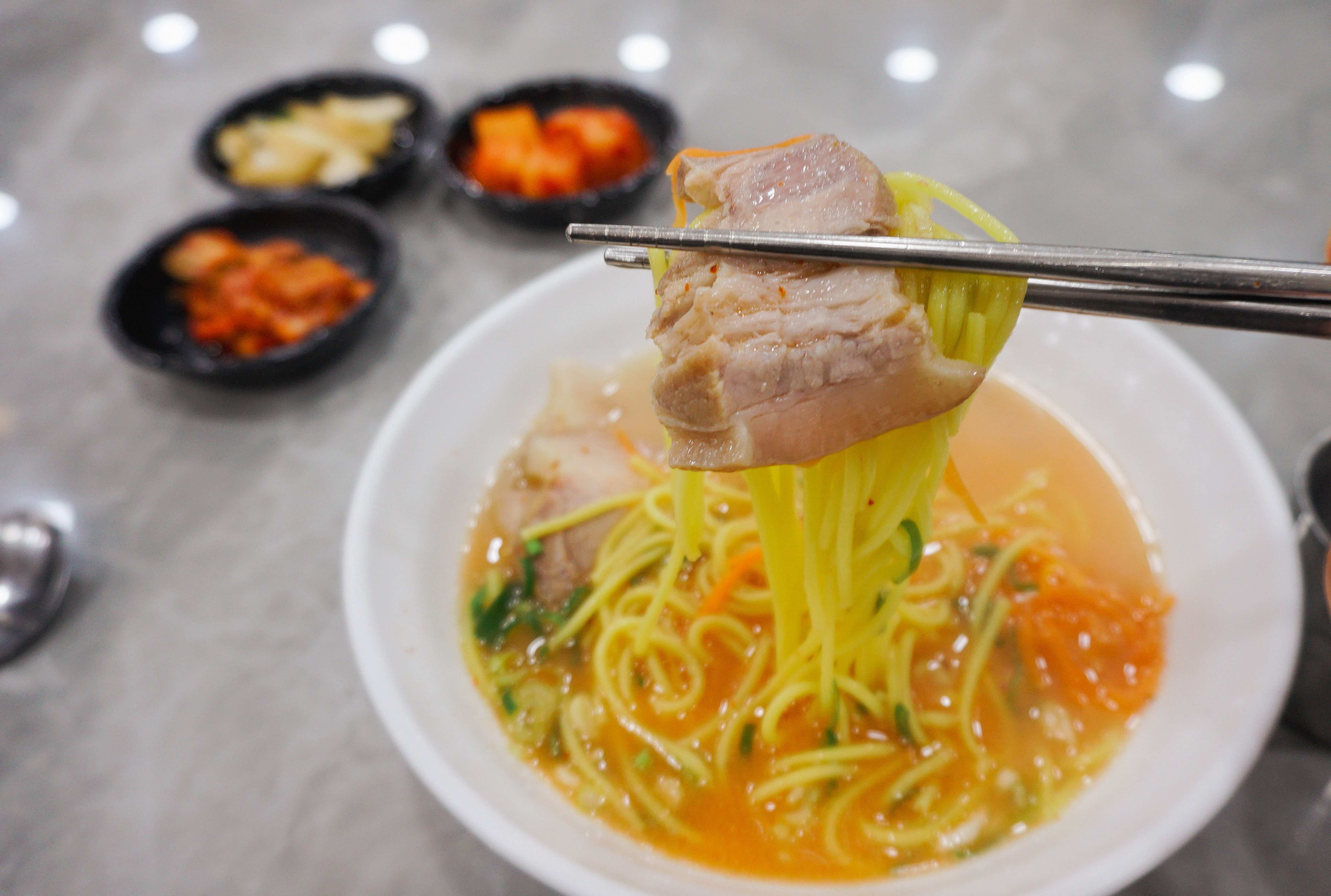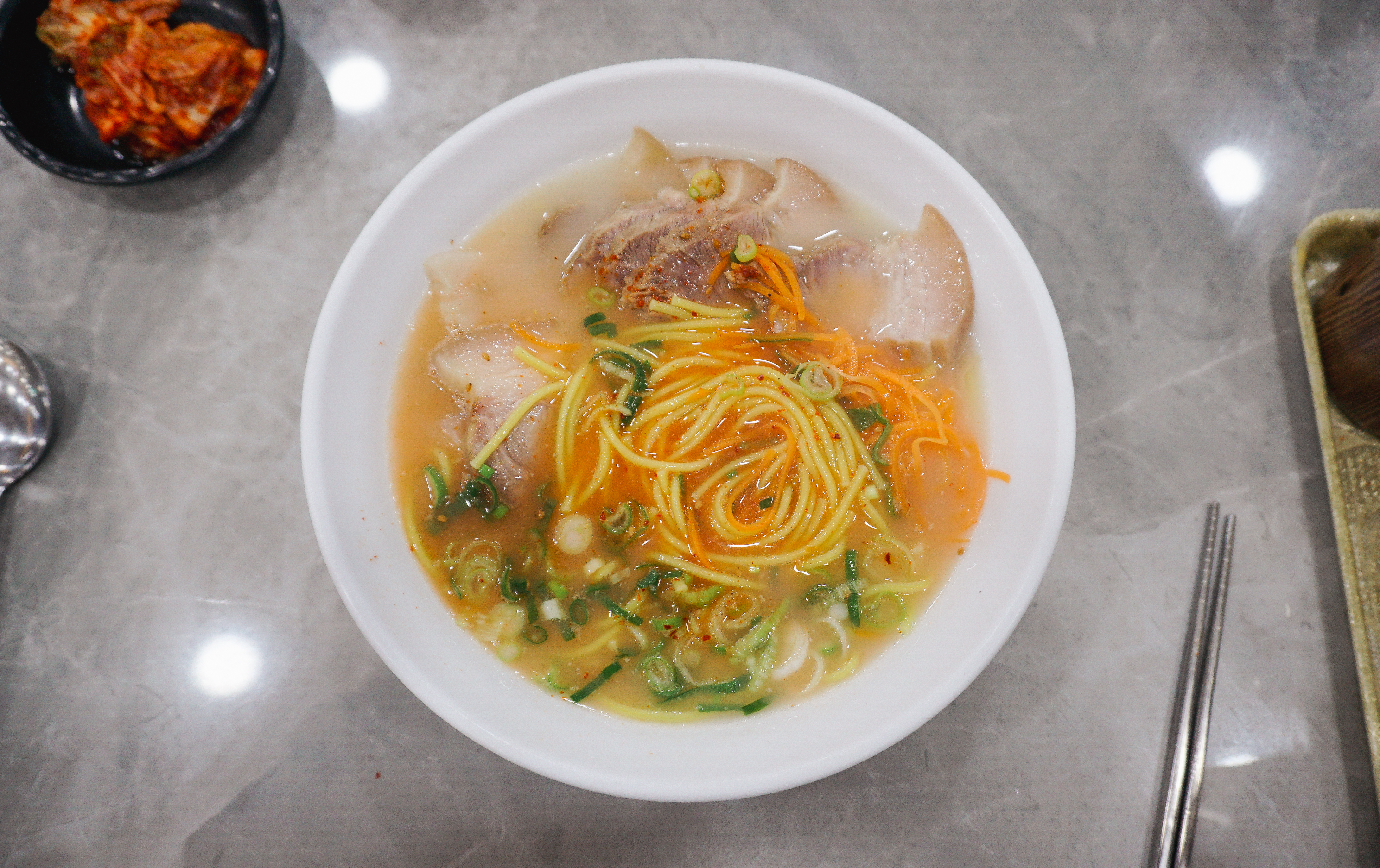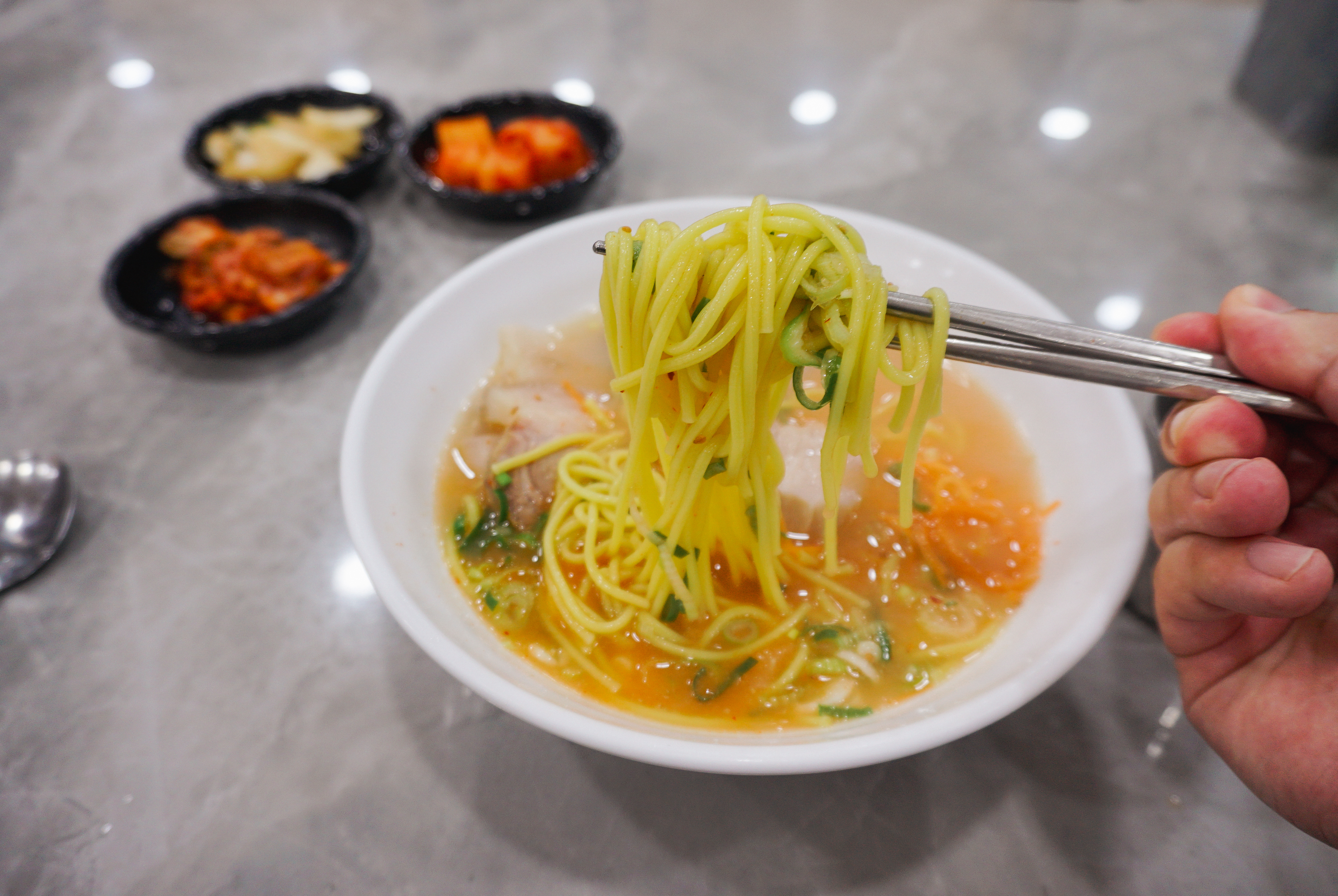 3대 국수회관의 고기국수의 모습은 위와 같습니다. 반찬으로 양파장아찌와 배추김치, 무김치가 나왔고, 고기국수의 국물은 돈사골국물이었는데, 맑은 느낌의 국물이었습니다. 저는 개인적으로 고기국수의 국물이 걸쭉한 것을 좋아하다 보니, 제 입맛에는 좀 안 맞는다고 해야 할까요?