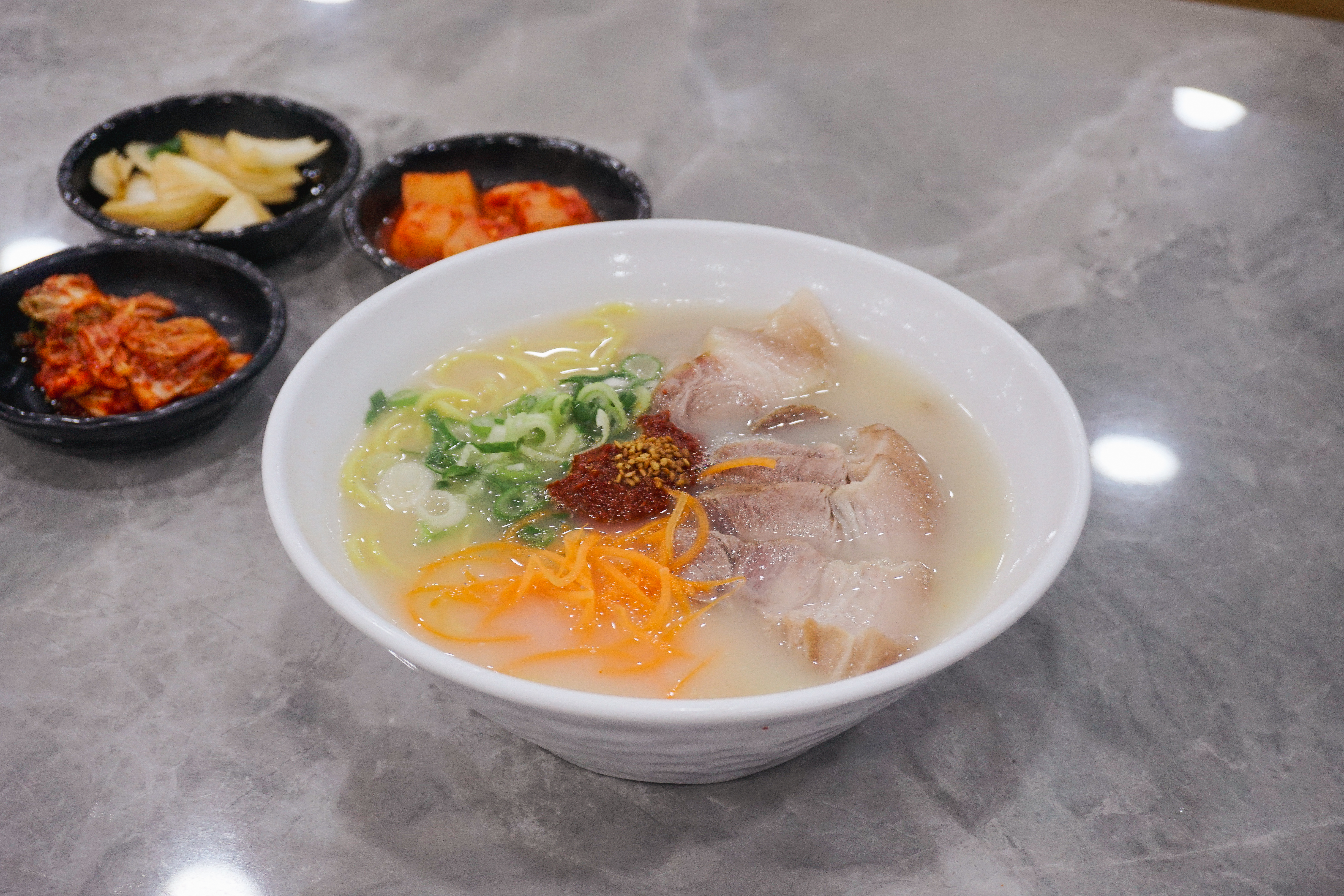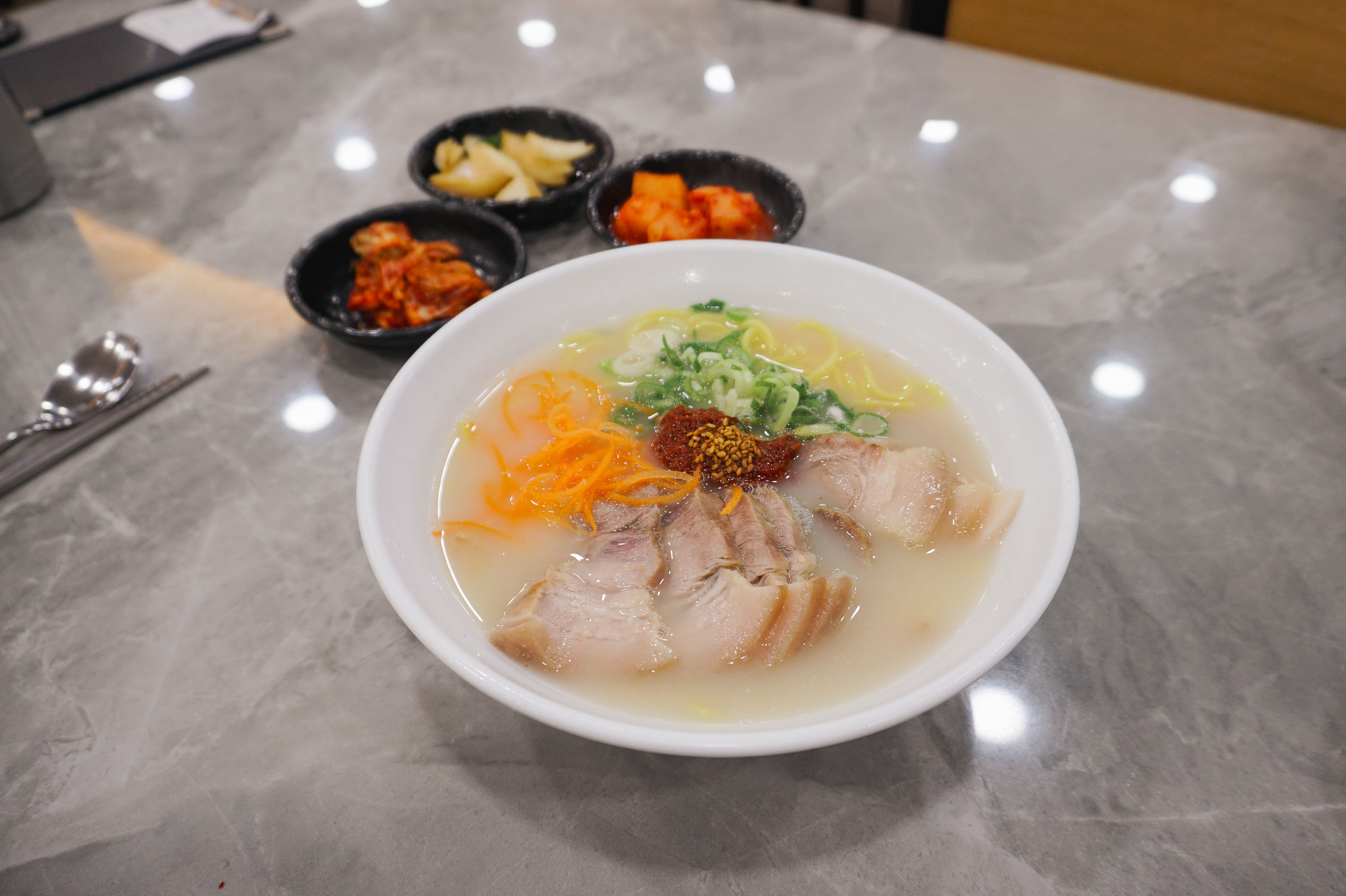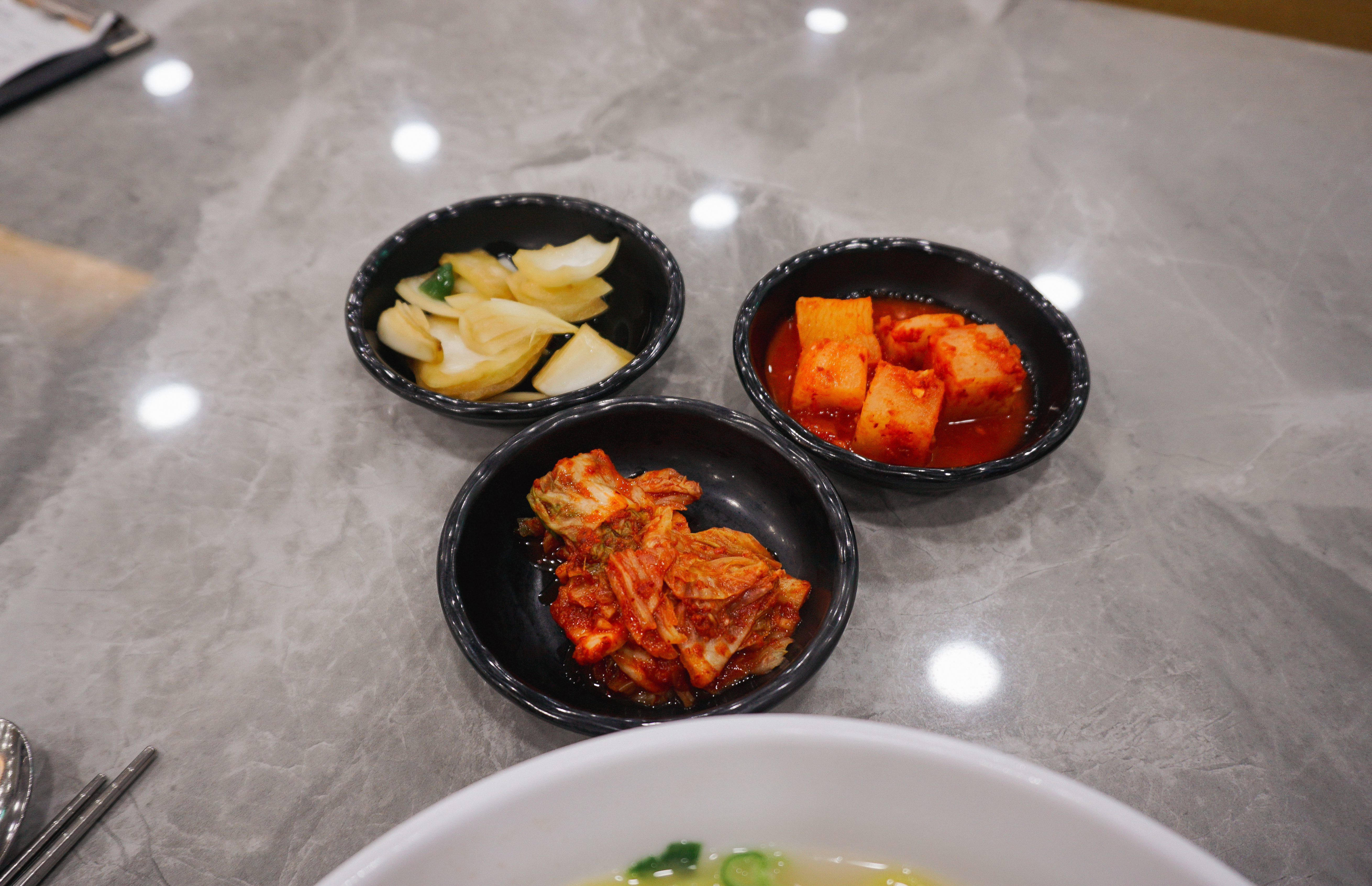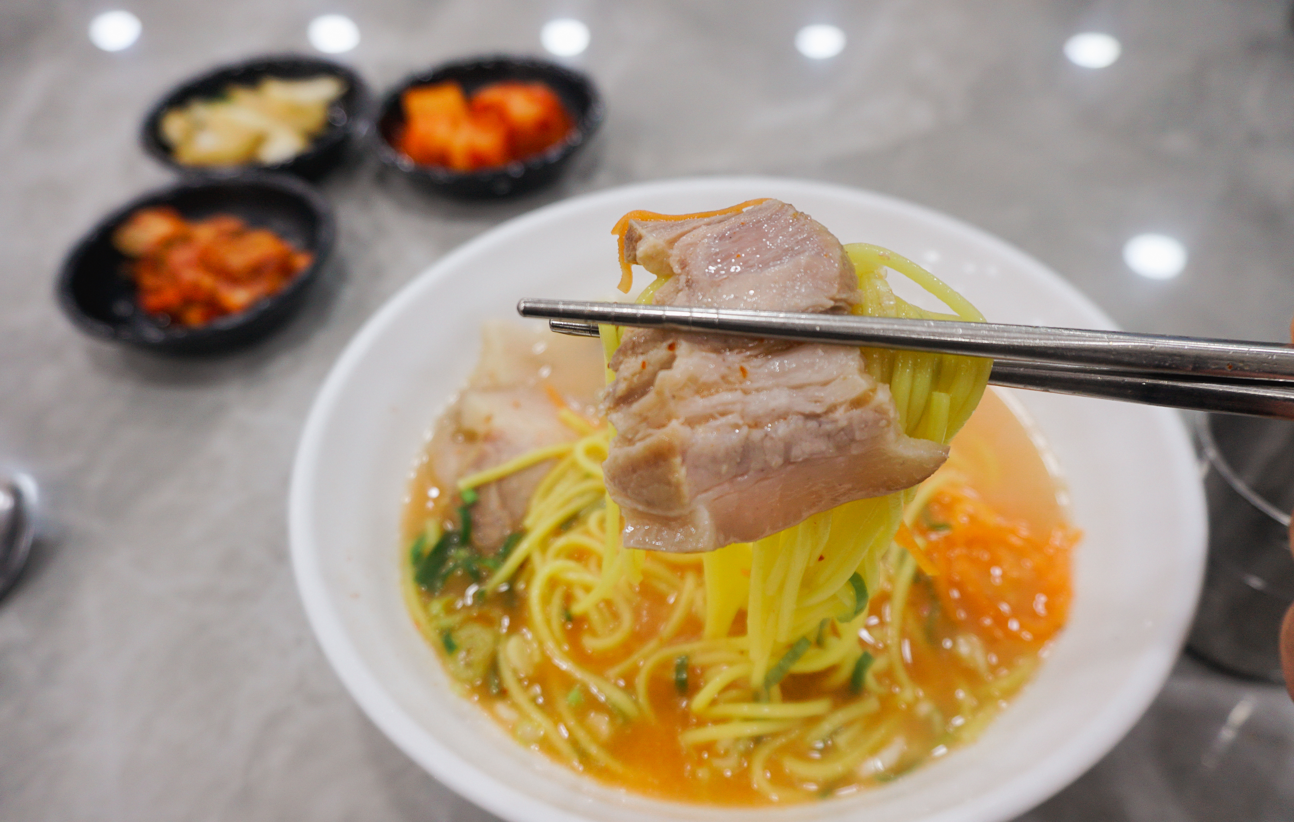 3대 국수회관의 고기국수의 모습은 위와 같습니다. 반찬으로 양파장아찌와 배추김치, 무김치가 나왔고, 고기국수의 국물은 돈사골국물이었는데, 맑은 느낌의 국물이었습니다. 저는 개인적으로 고기국수의 국물이 걸쭉한 것을 좋아하다 보니, 제 입맛에는 좀 안 맞는다고 해야 할까요?