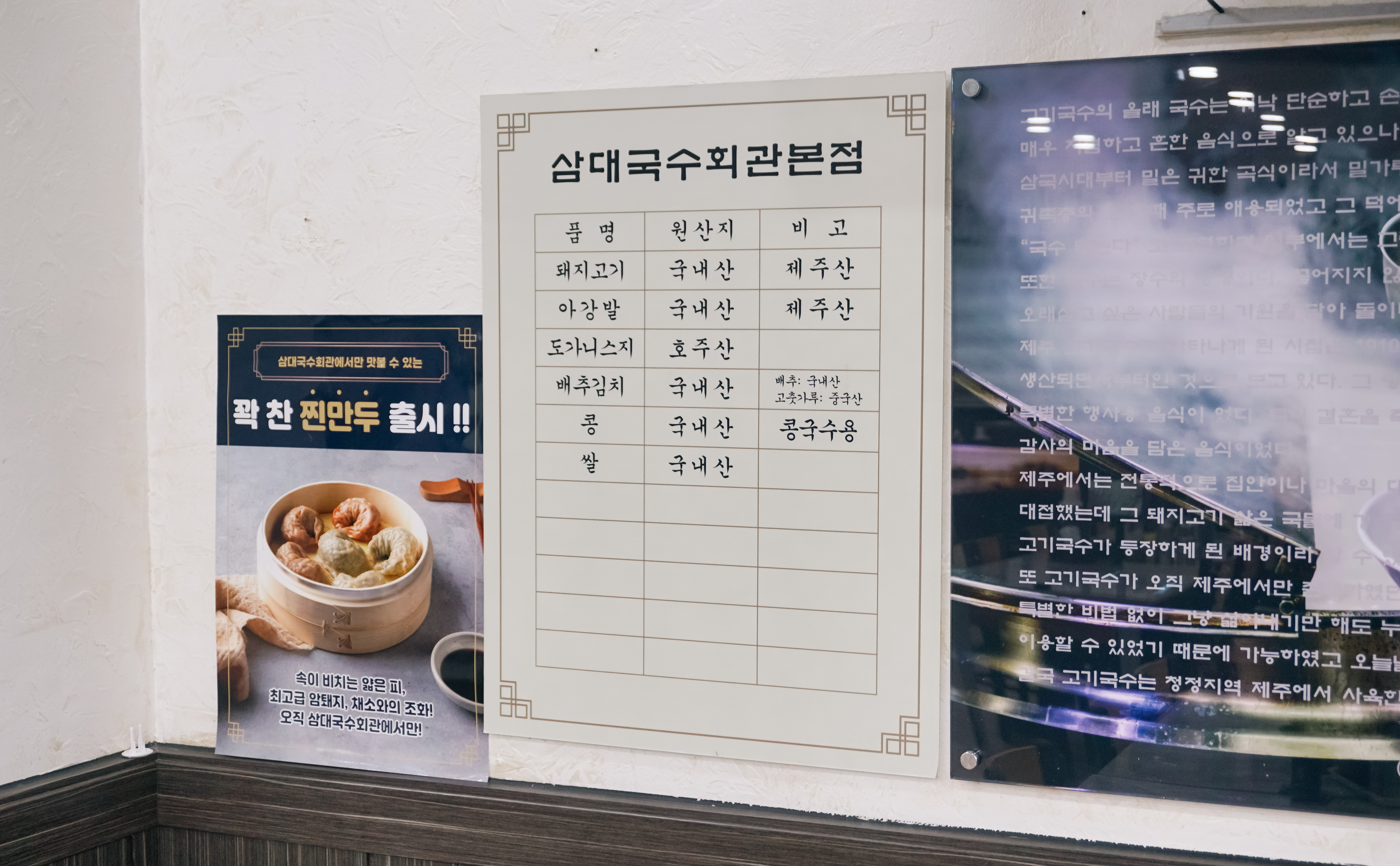 삼대국수회관은 제주특별자치도 제주시 일도이동 1045-12 에 위치한 가게였습니다. 가게 건물에는 지하주차장이 마련되어 있어서 주차를 편하게 할 수 있었고, 매장도 넓어서 가족식사를 하러 방문하시는 분들도 많이 보였습니다. 가게에는 유명인들이 다녀갔다는 사인이 벽면을 장식하고 있었습니다.