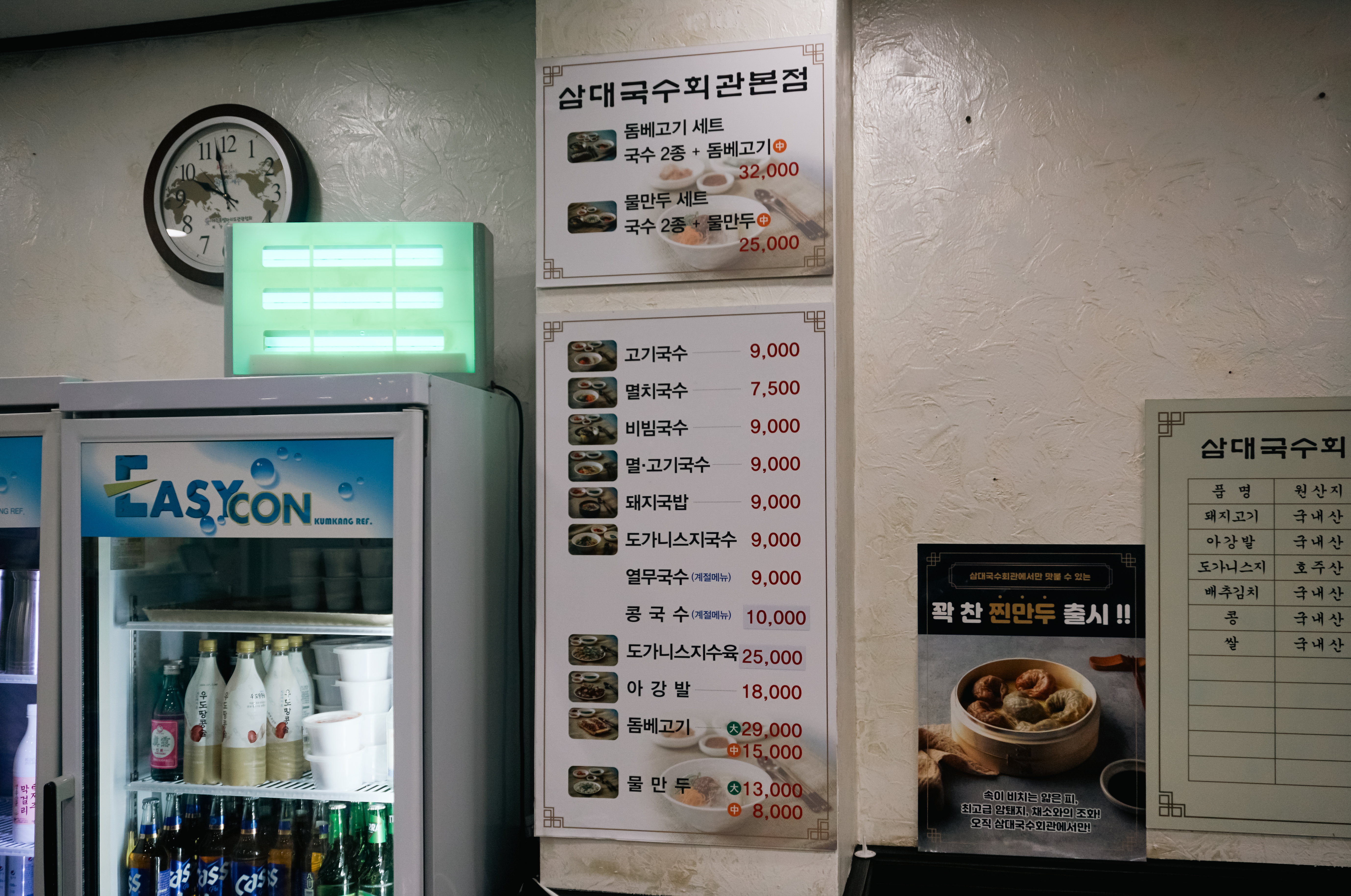 국물은 조금 더 묵직했으면 좋았겠지만, 고기는 꽤 두툼한 것이 먹기 좋더라고요. 국수도 적당히 면발이 굵은 편이었고요. 맑은 국물에 양념장까지 풀어서 그런가 뭔가 깊은 맛은 없었고, 전체적으로 맛이 가벼운 느낌이 들었습니다. 고기와 면 빼고는 제가 선호하는 맛은 아니었던 삼대국수회관.