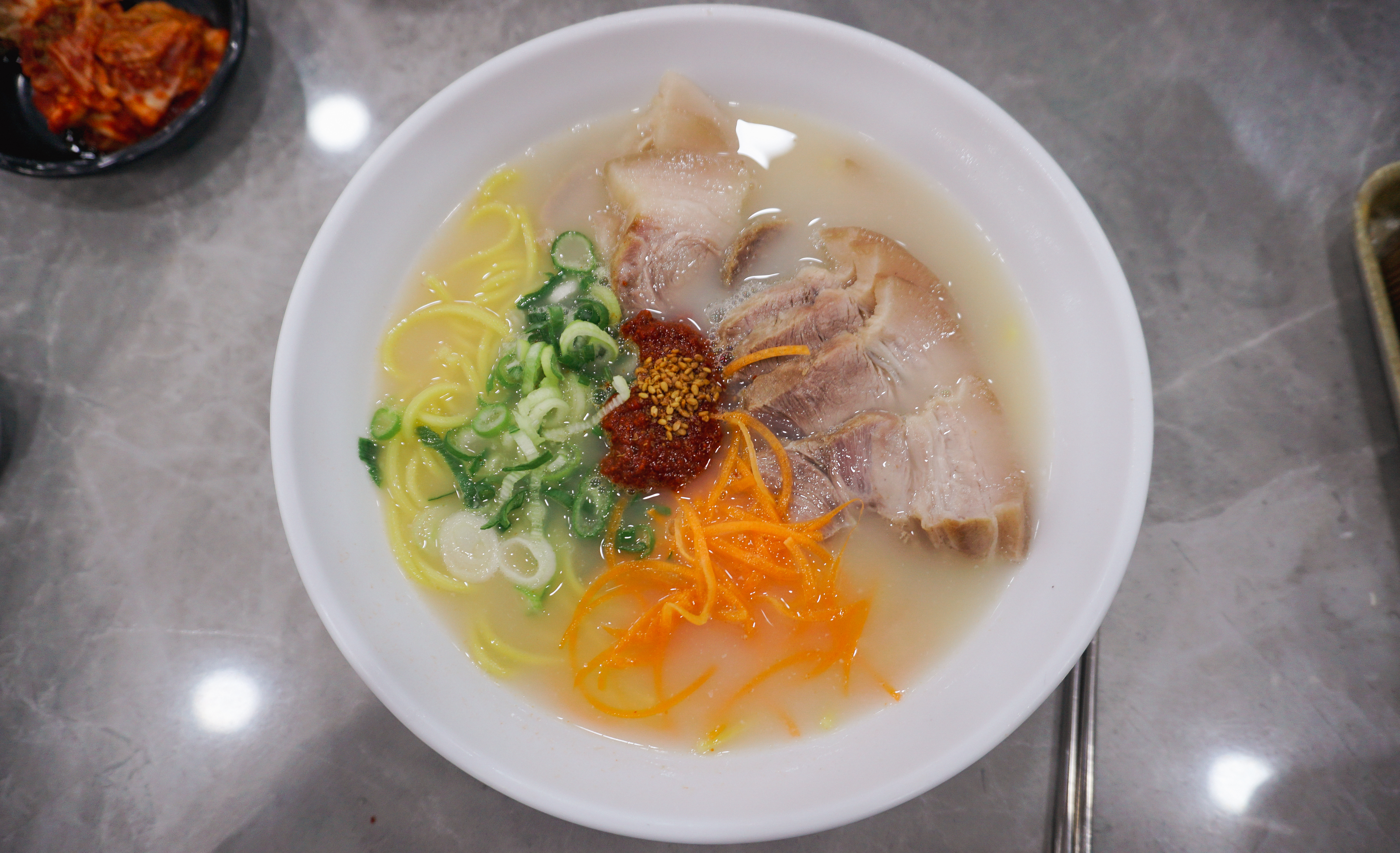 3대 국수회관의 고기국수의 모습은 위와 같습니다. 반찬으로 양파장아찌와 배추김치, 무김치가 나왔고, 고기국수의 국물은 돈사골국물이었는데, 맑은 느낌의 국물이었습니다. 저는 개인적으로 고기국수의 국물이 걸쭉한 것을 좋아하다 보니, 제 입맛에는 좀 안 맞는다고 해야 할까요?