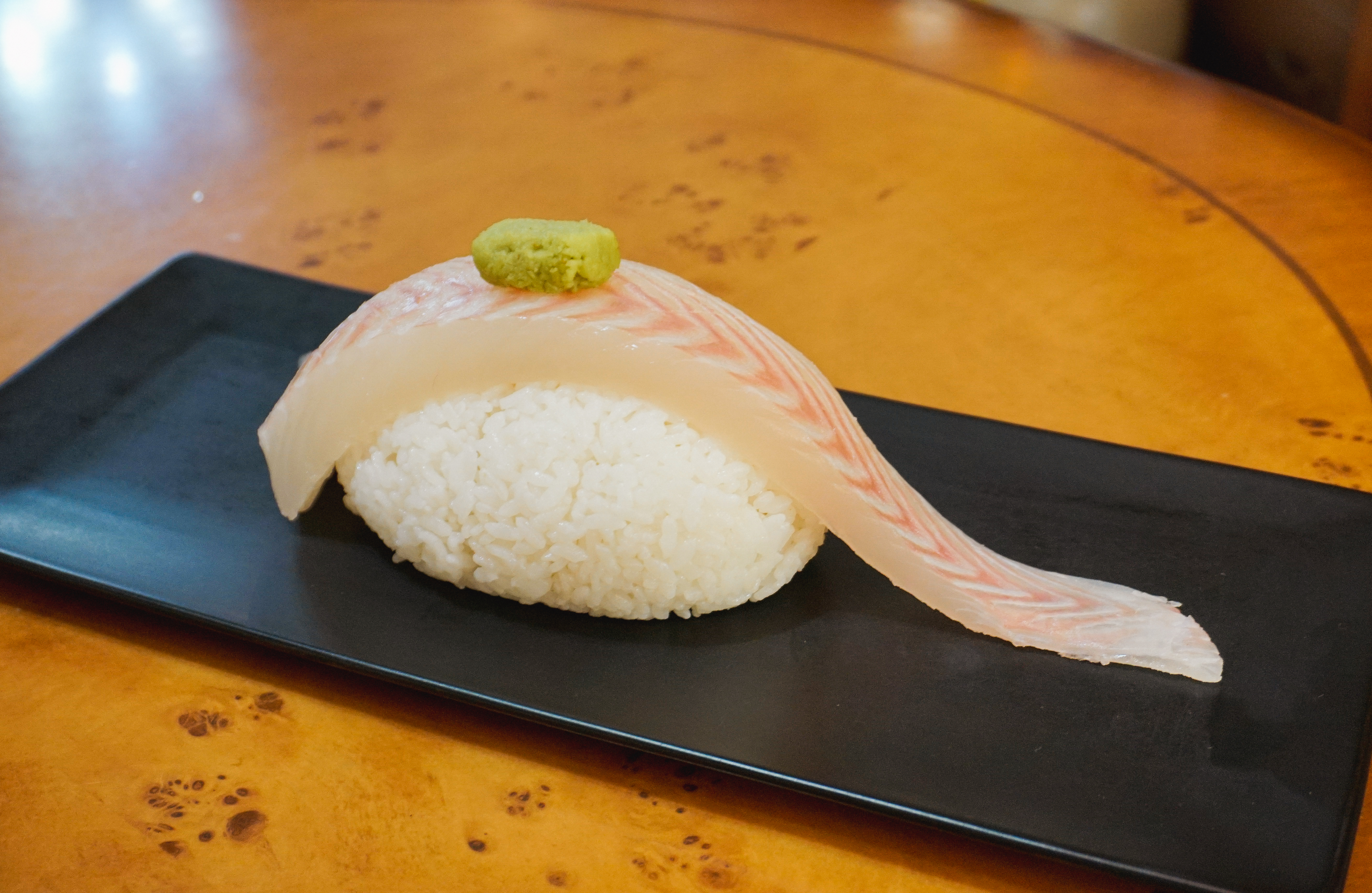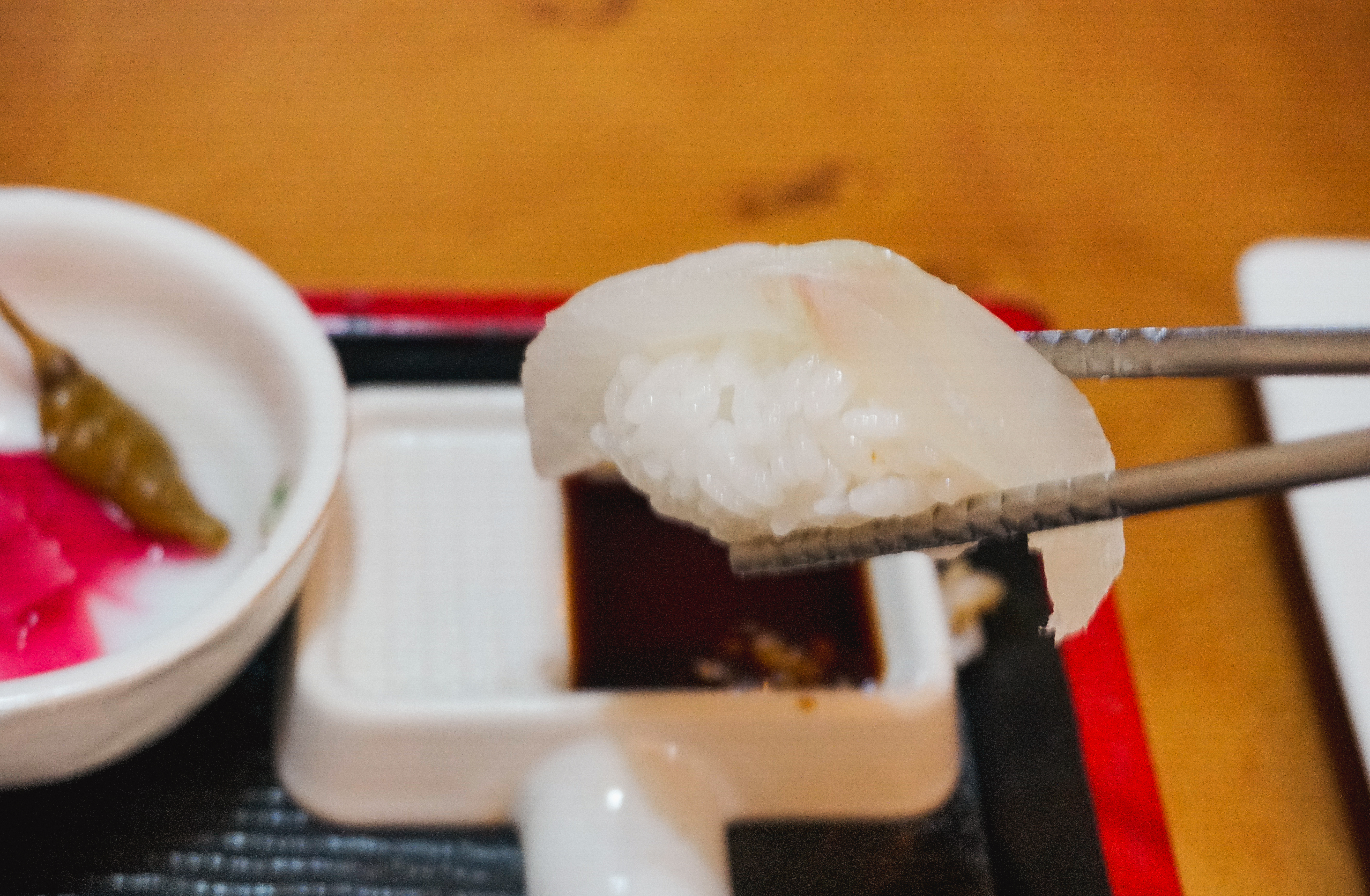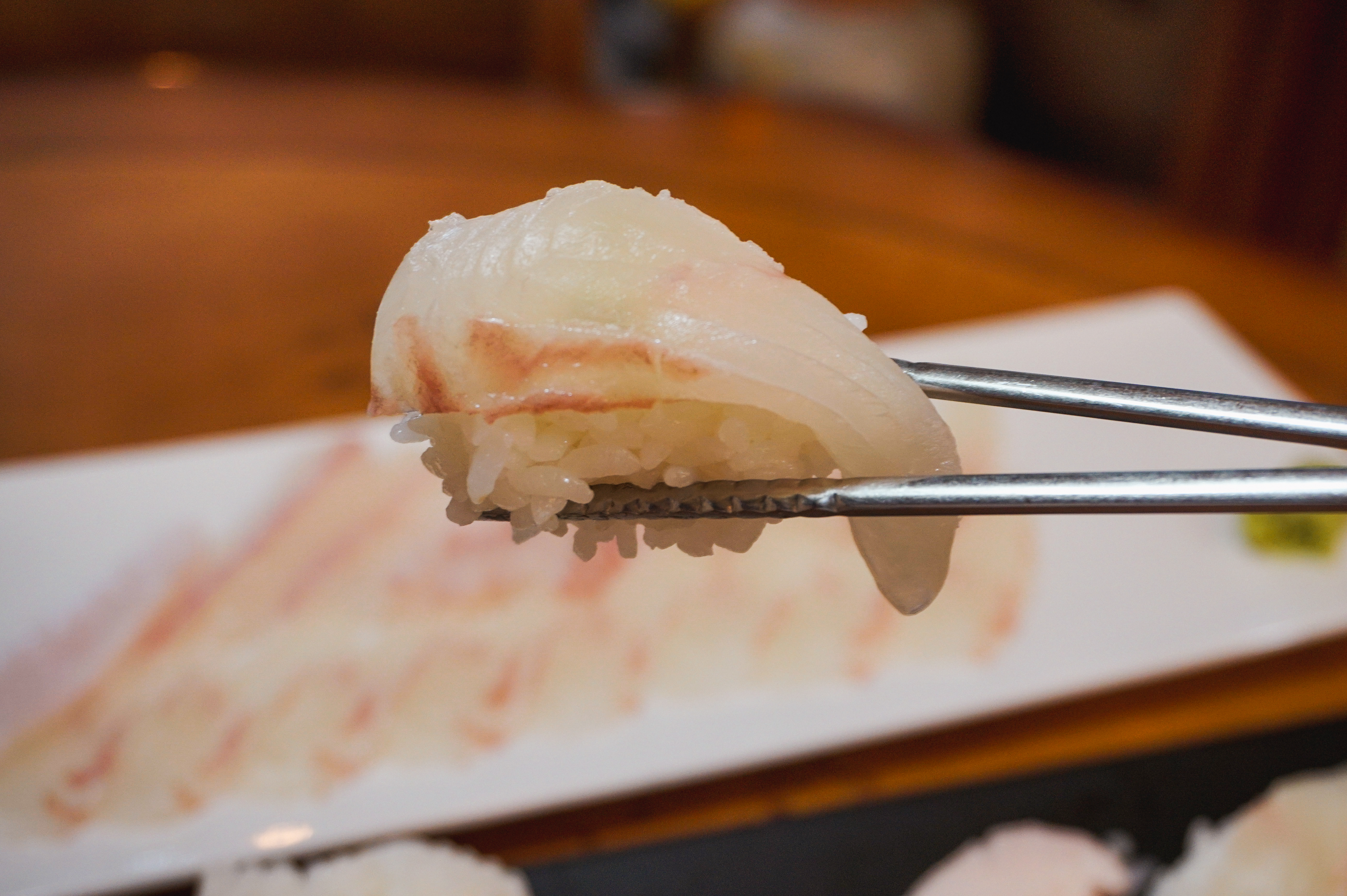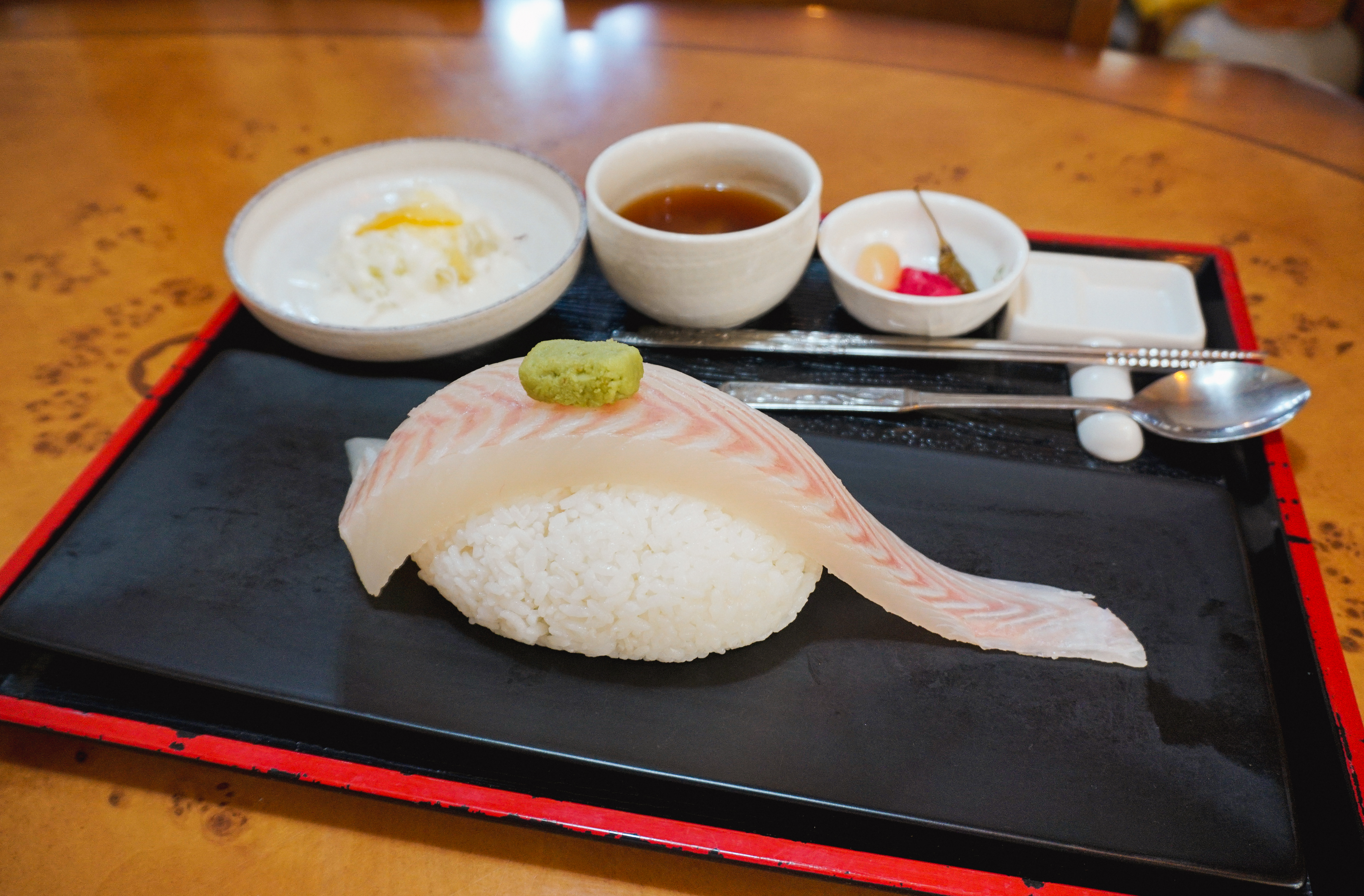 곧이어 인증사진을 찍을 대왕초밥이 나왔습니다. 사실 사전조사를 할 때는 대부분의 인증샷들이 초밥을 더 거대해 보이게 찍어서 그런지 원래 크기가 짐작이 안되었는데, 실제로 보니 무턱대고 크다기보다는 2명이서 충분히 먹을 정도로 큼직한 크기였습니다.