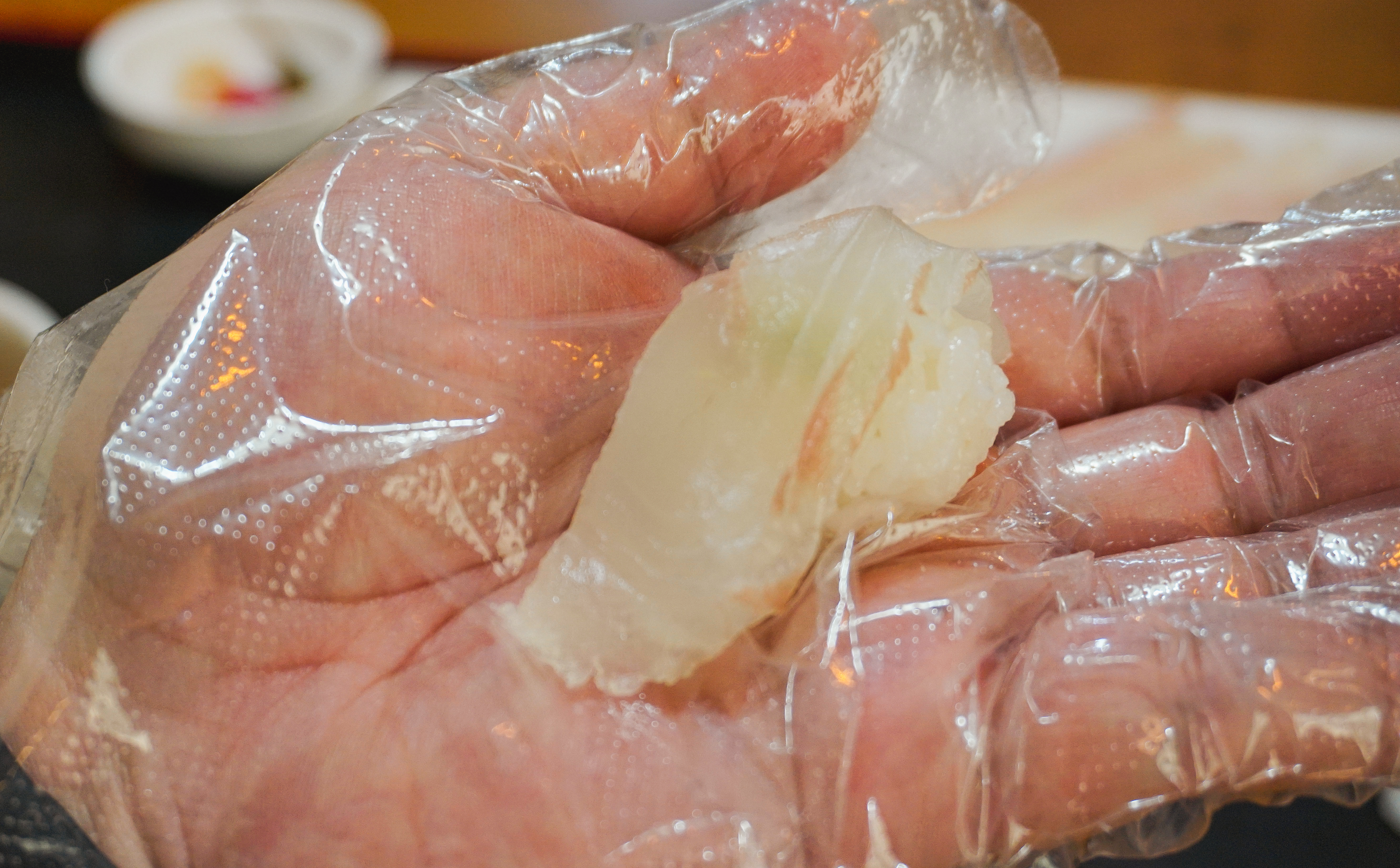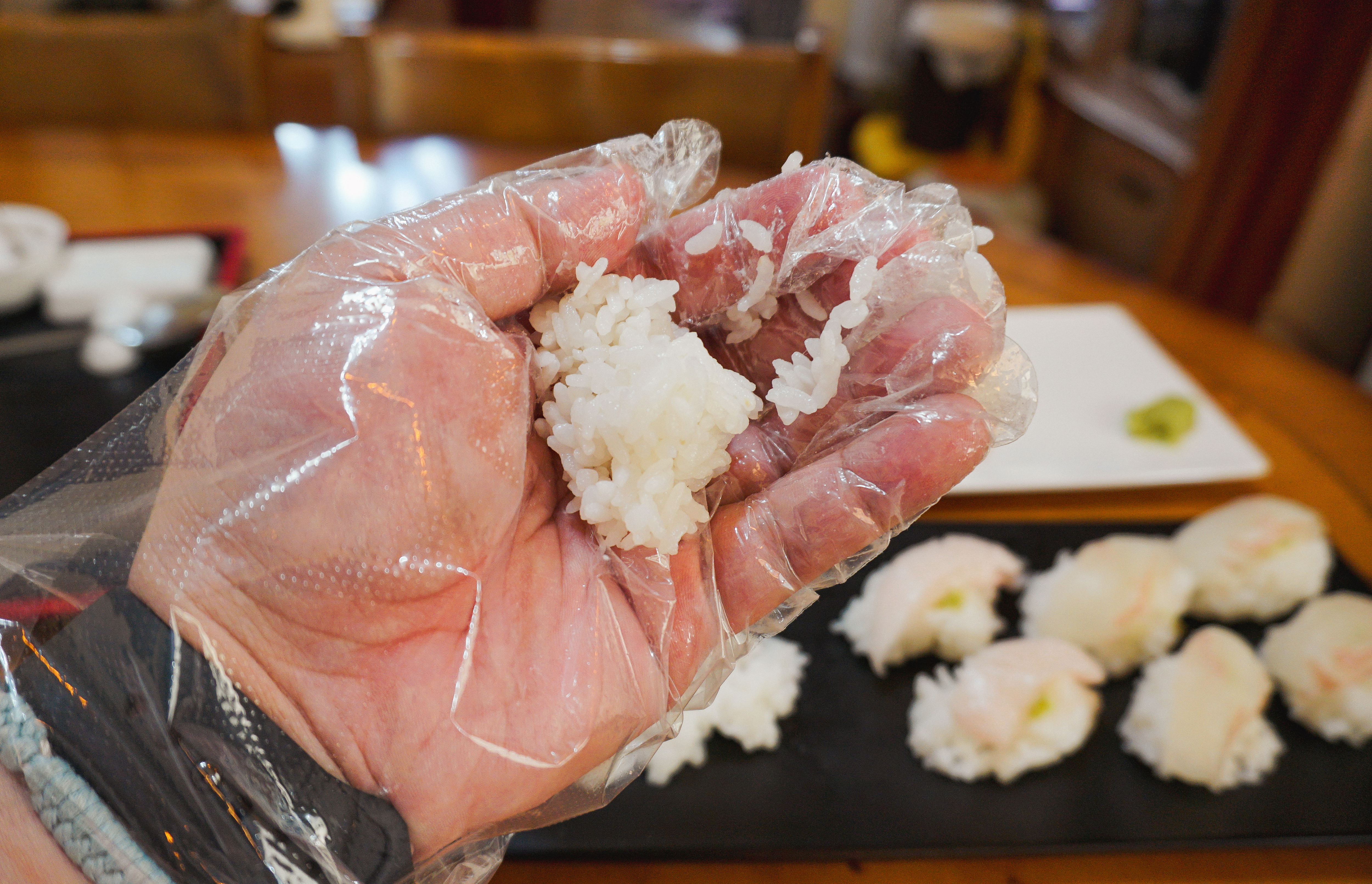 용초밥의 메뉴는 광어, 방어, 부시리, 광어초밥, 방어초밥, 부시리초밥 등이 있었습니다. 여기서 용초밥이라는 메뉴가 대왕초밥을 의미하며, 먹는 방법은 먼저 ➊ 대왕초밥의 기념촬영(인증샷)을 찍은 다음, ➋ 초밥접시를 사장님께 가져가면 횟감을 먹기 좋은 크기로 썰어주셨습니다. 그 사이 ❸ 초밥을 약 25피스 정도 만들어주면 되었고, ➍ 비닐장갑을 이용해 먹거나, 젓가락으로 먹으면 되었습니다.