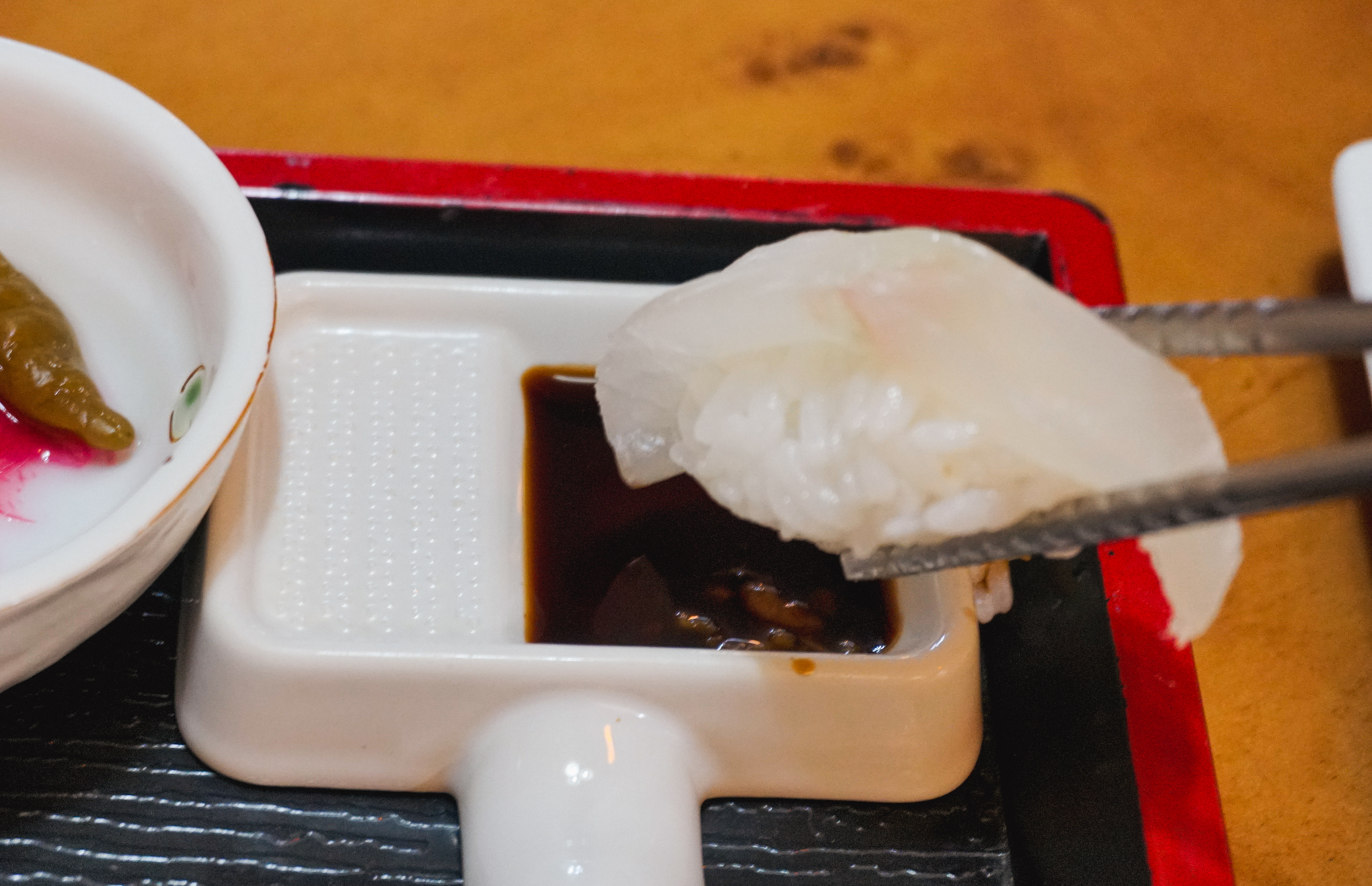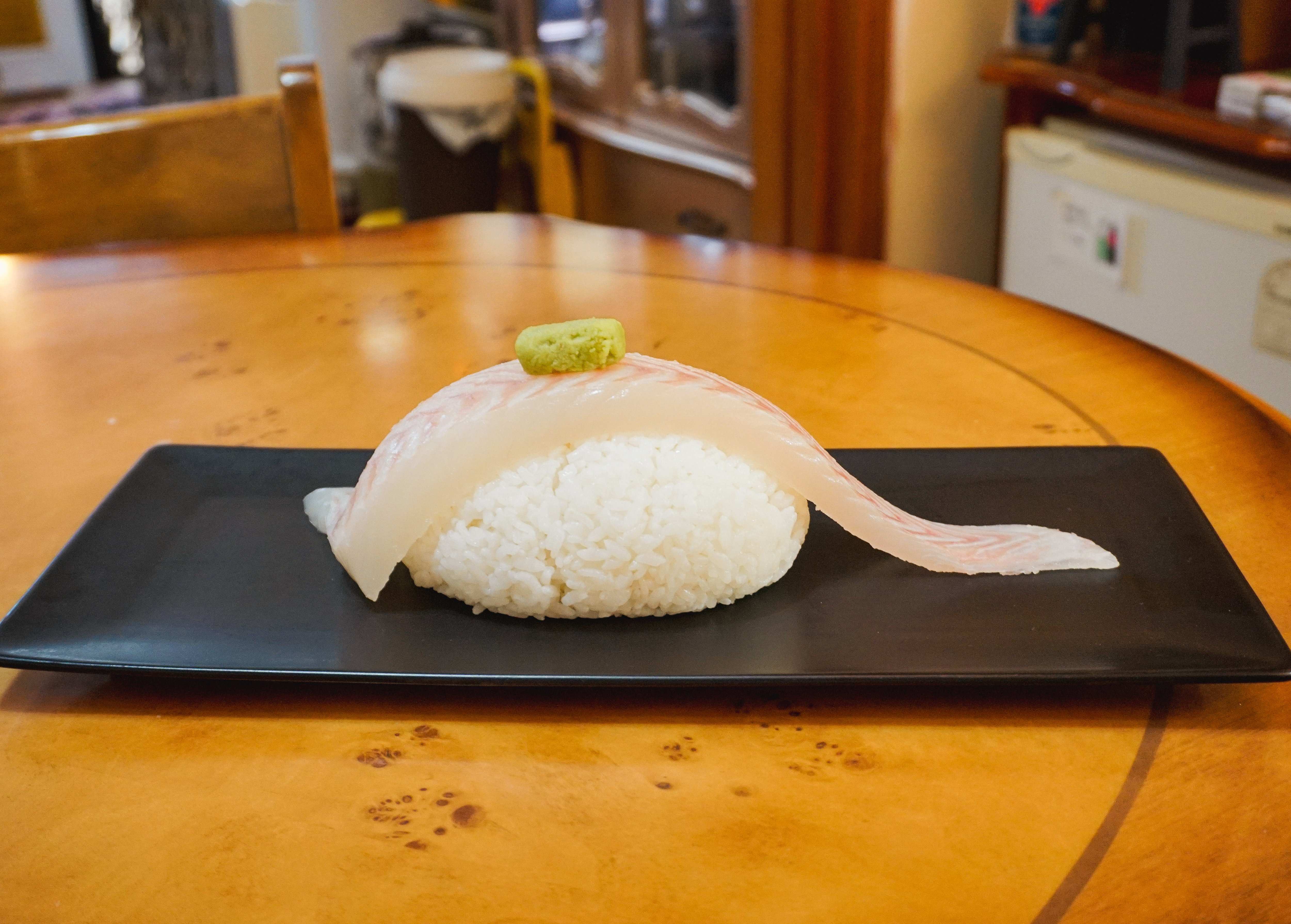 곧이어 인증사진을 찍을 대왕초밥이 나왔습니다. 사실 사전조사를 할 때는 대부분의 인증샷들이 초밥을 더 거대해 보이게 찍어서 그런지 원래 크기가 짐작이 안되었는데, 실제로 보니 무턱대고 크다기보다는 2명이서 충분히 먹을 정도로 큼직한 크기였습니다.