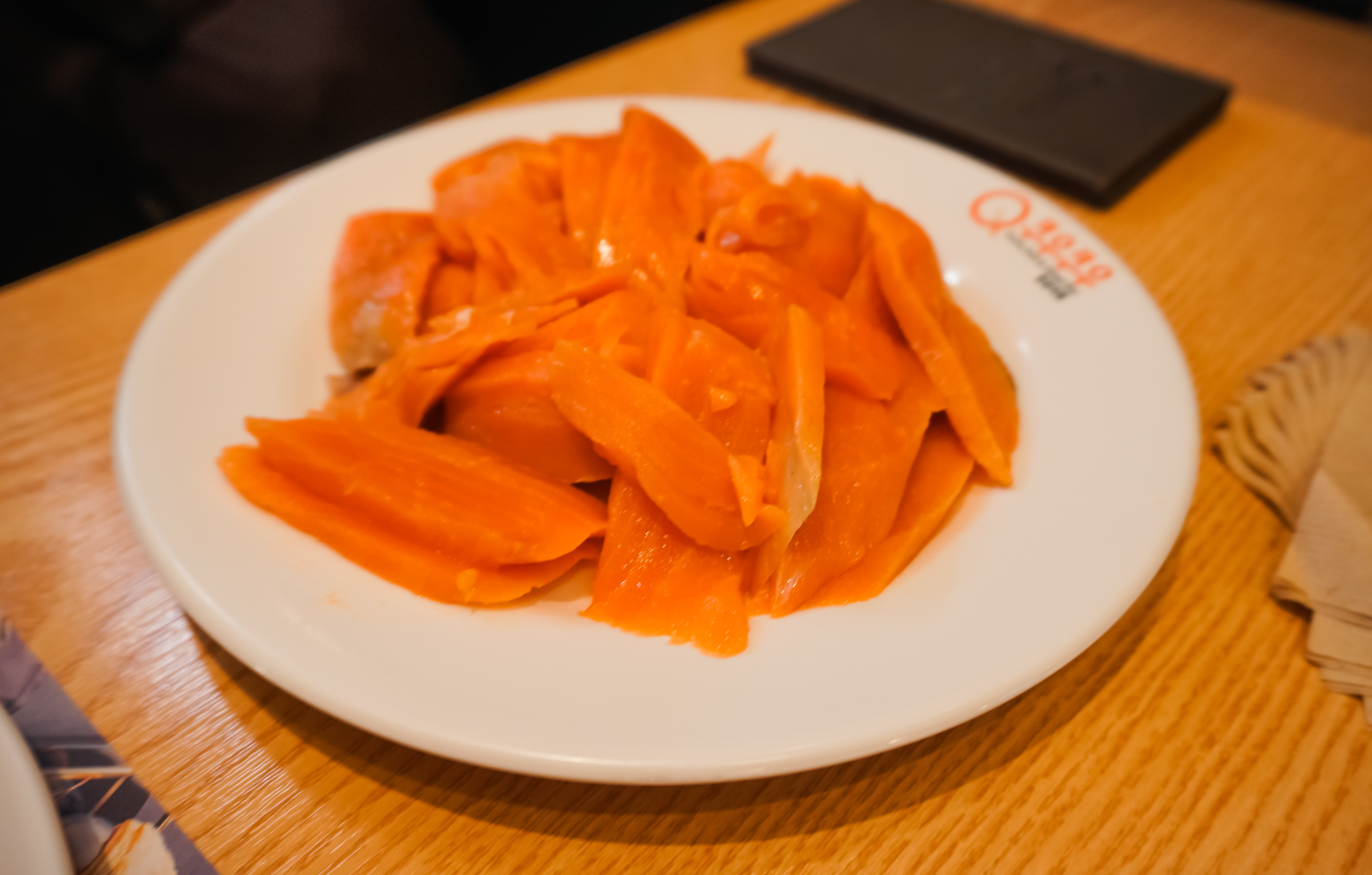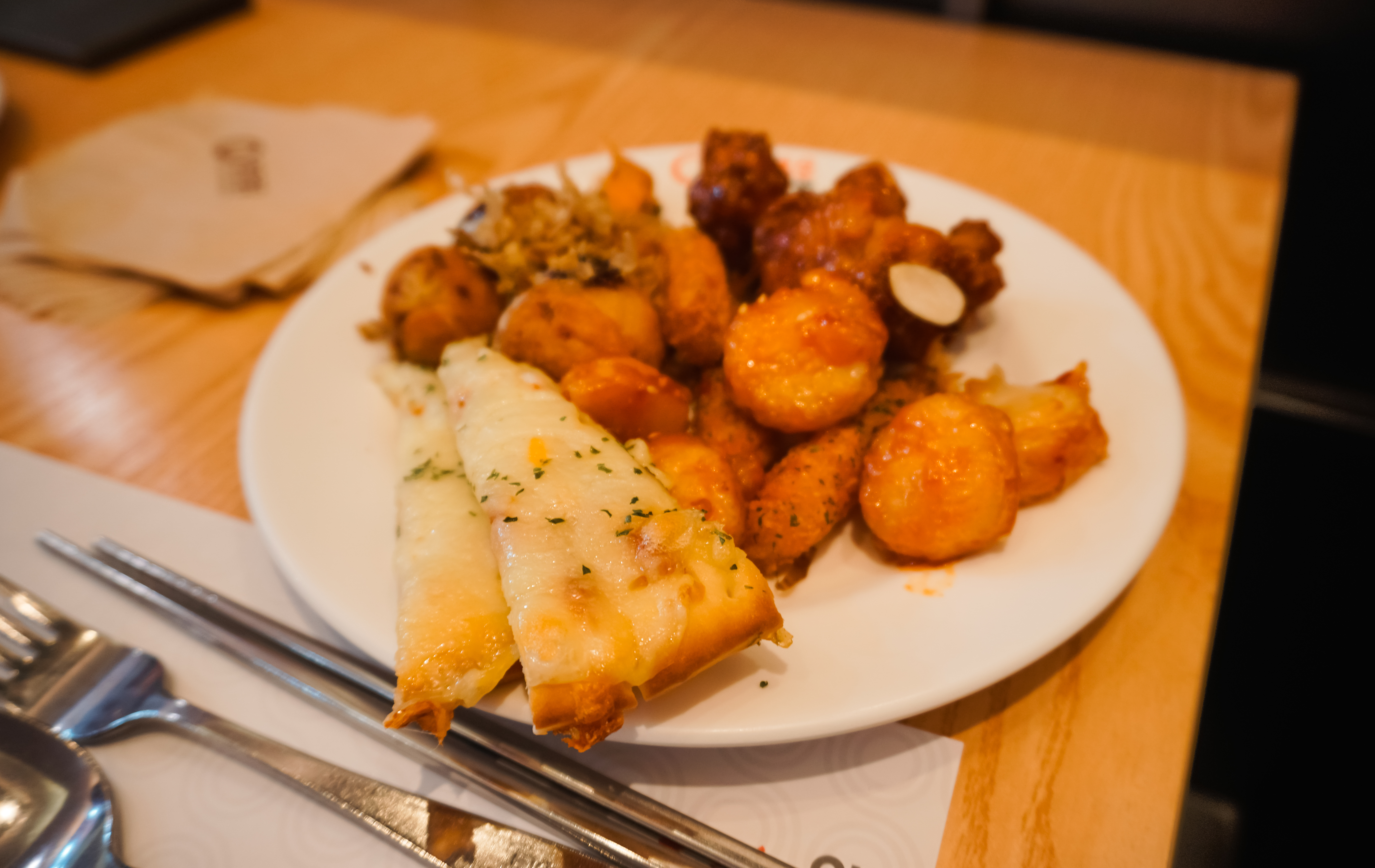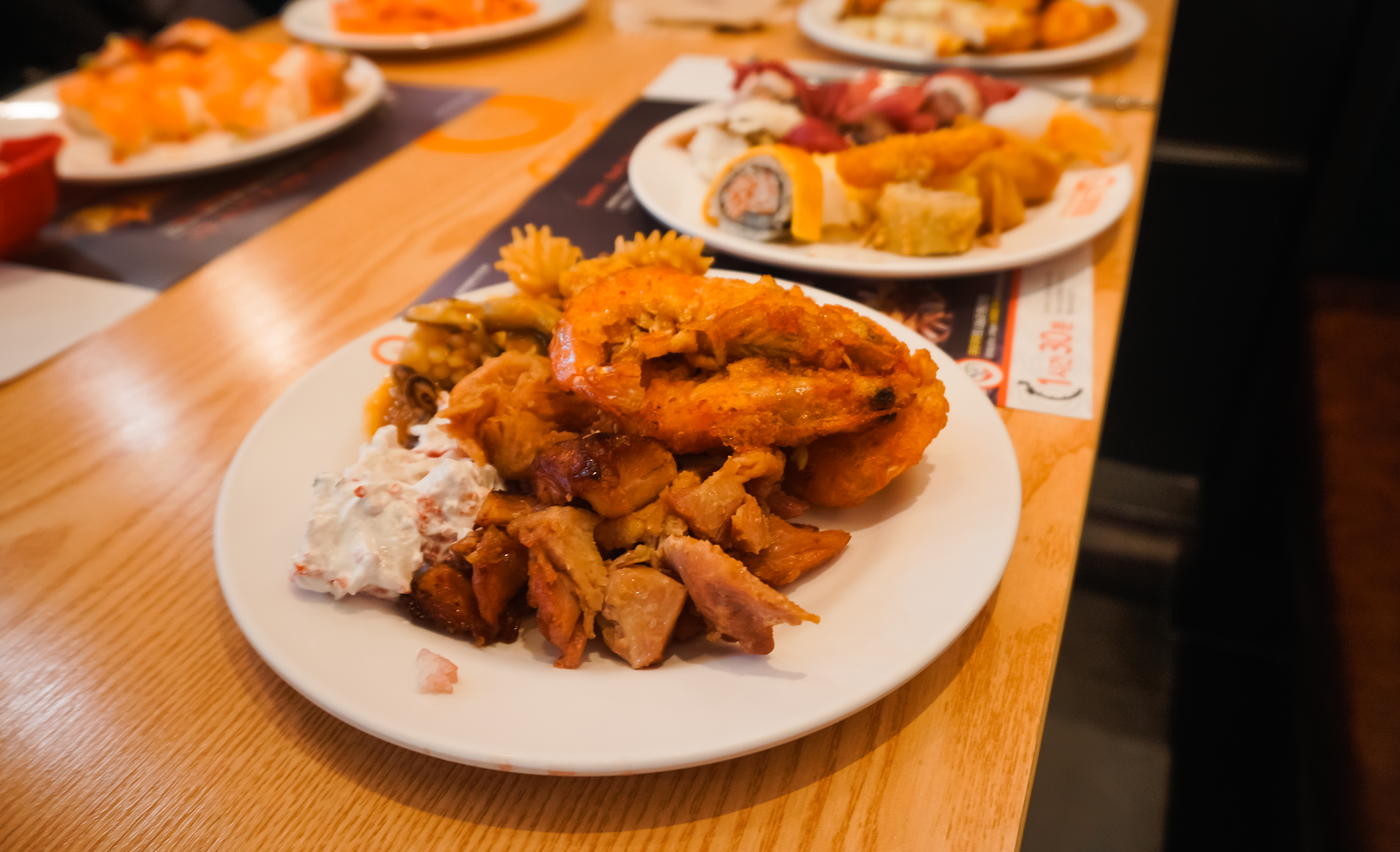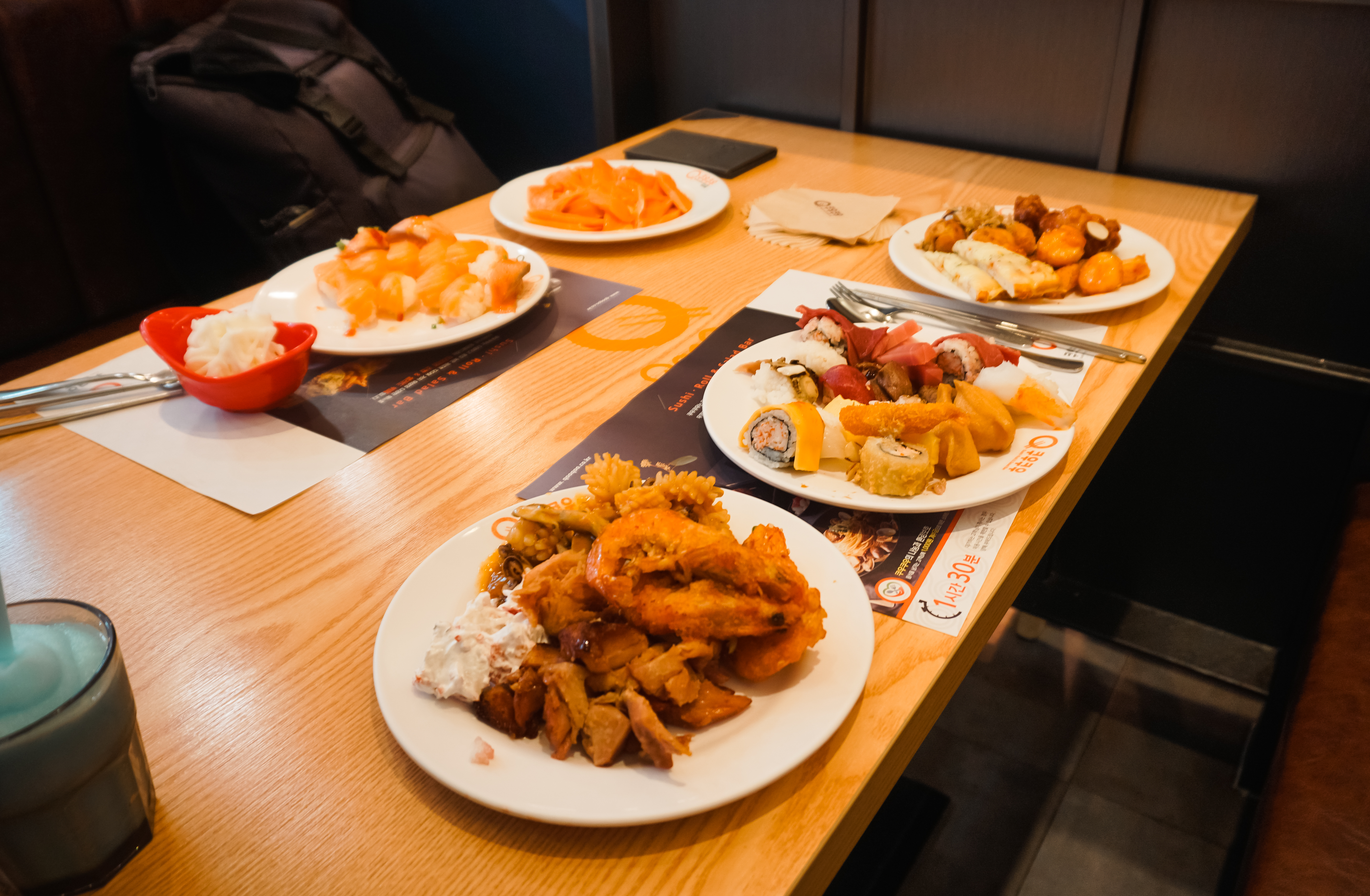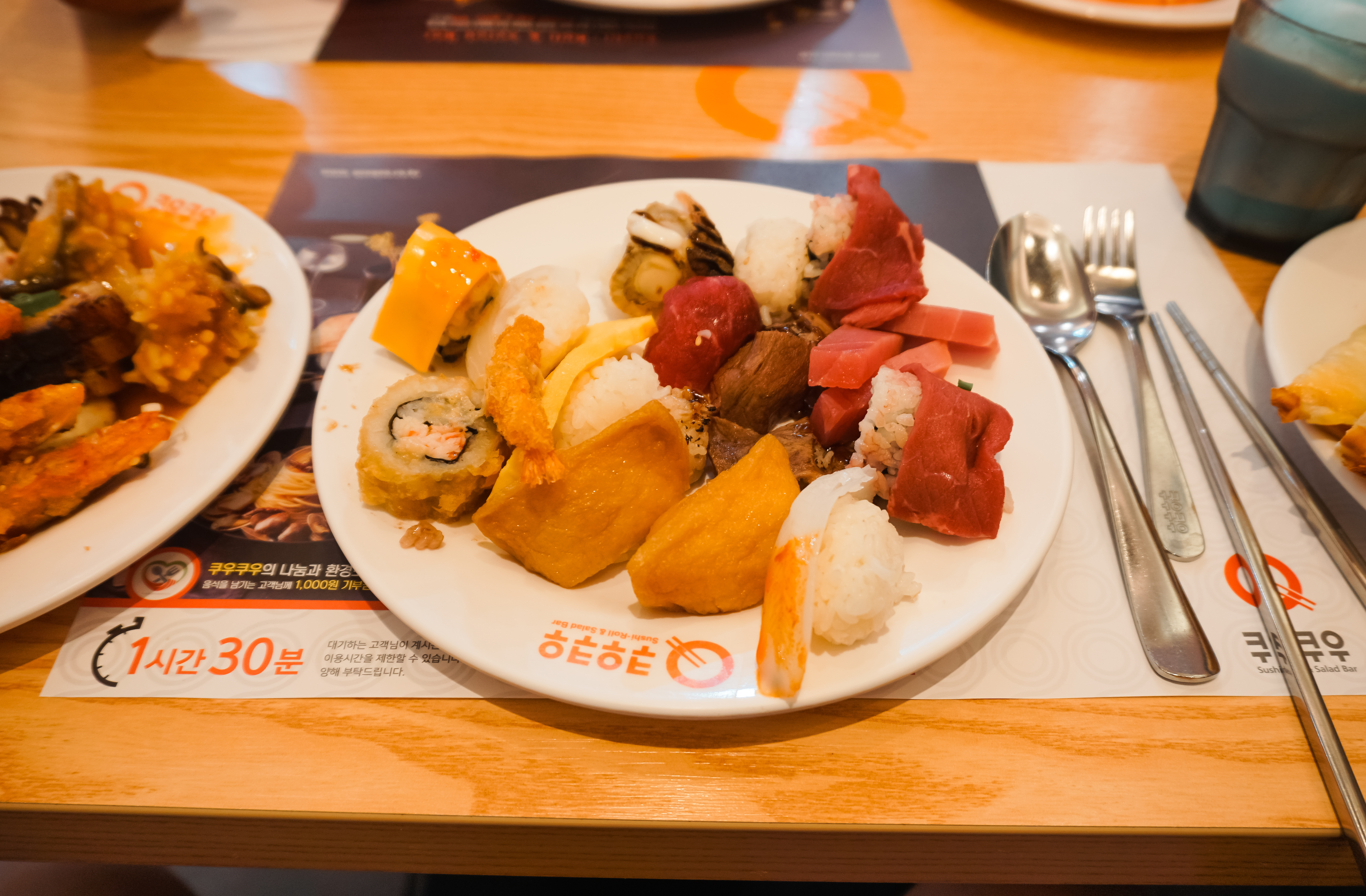 쿠우쿠우의 초밥, 튀김, 고기, 회 등 입맛에 맞는 메뉴들을 담아 오다 보니 상이 한가득입니다. 맛과 퀄리티는 20,900원이라는 가격에 적당하게 메뉴의 질이 너무 나쁘다거나 엄청 고급스럽다는 느낌은 없는 적당한 느낌이었습니다. 솔직히 초밥뷔페로 유명한 가게라 초밥에 기대를 많이 했는데, 밥이 너무 되서 잘 부서진다는 게 조금 아쉬웠습니다. 그래도 재료들은 본점에 걸맞게 잘 관리되는 것 같았습니다.