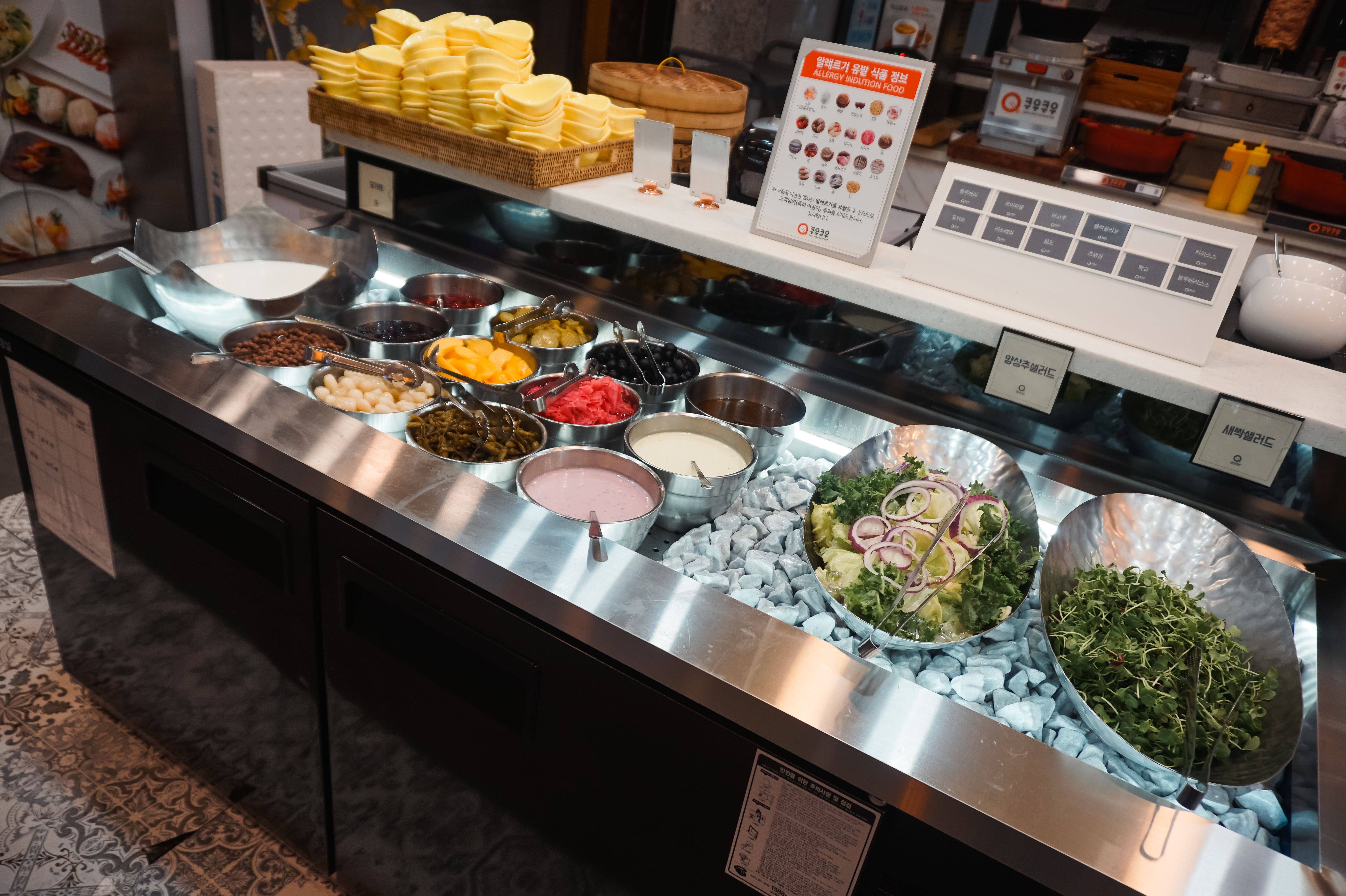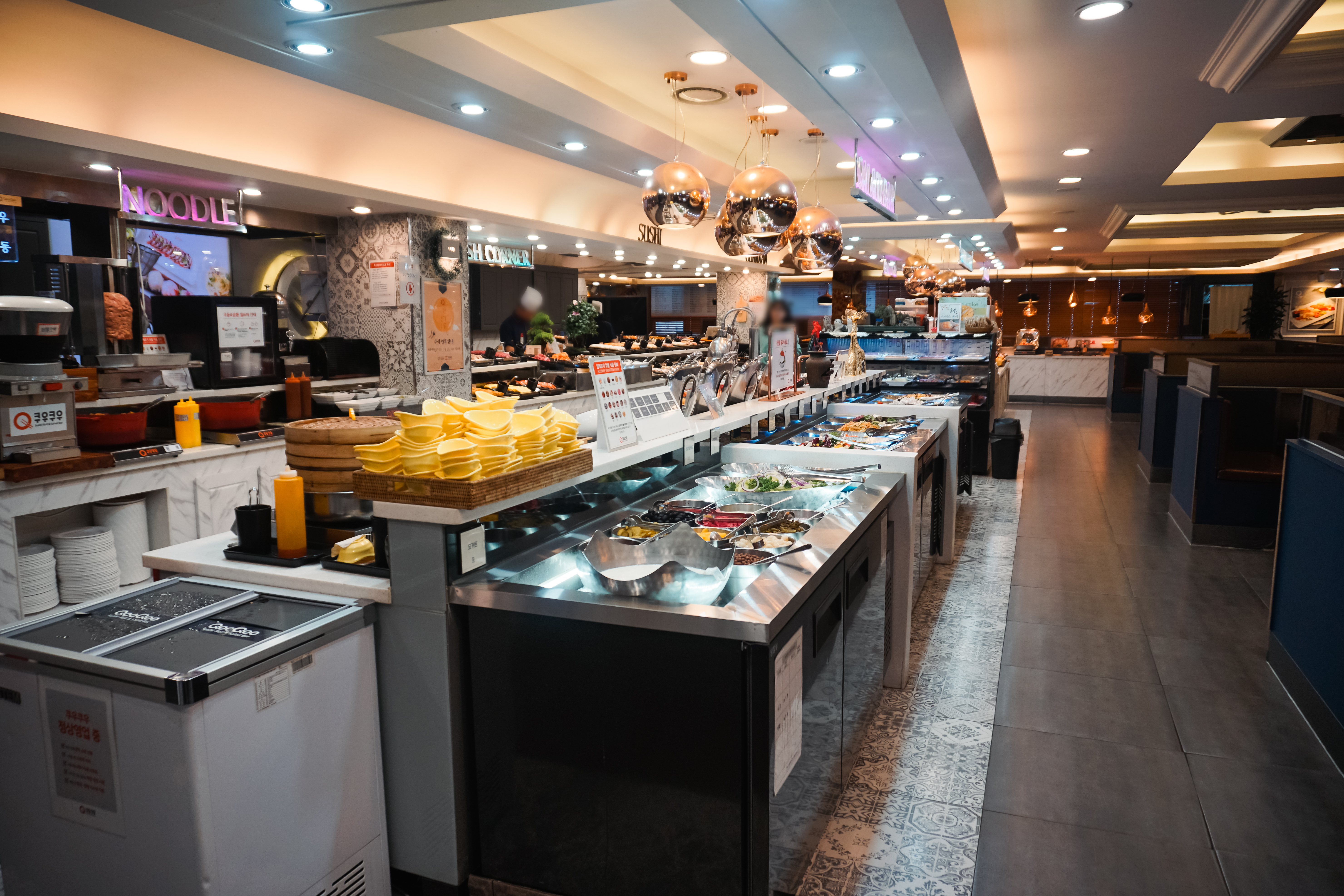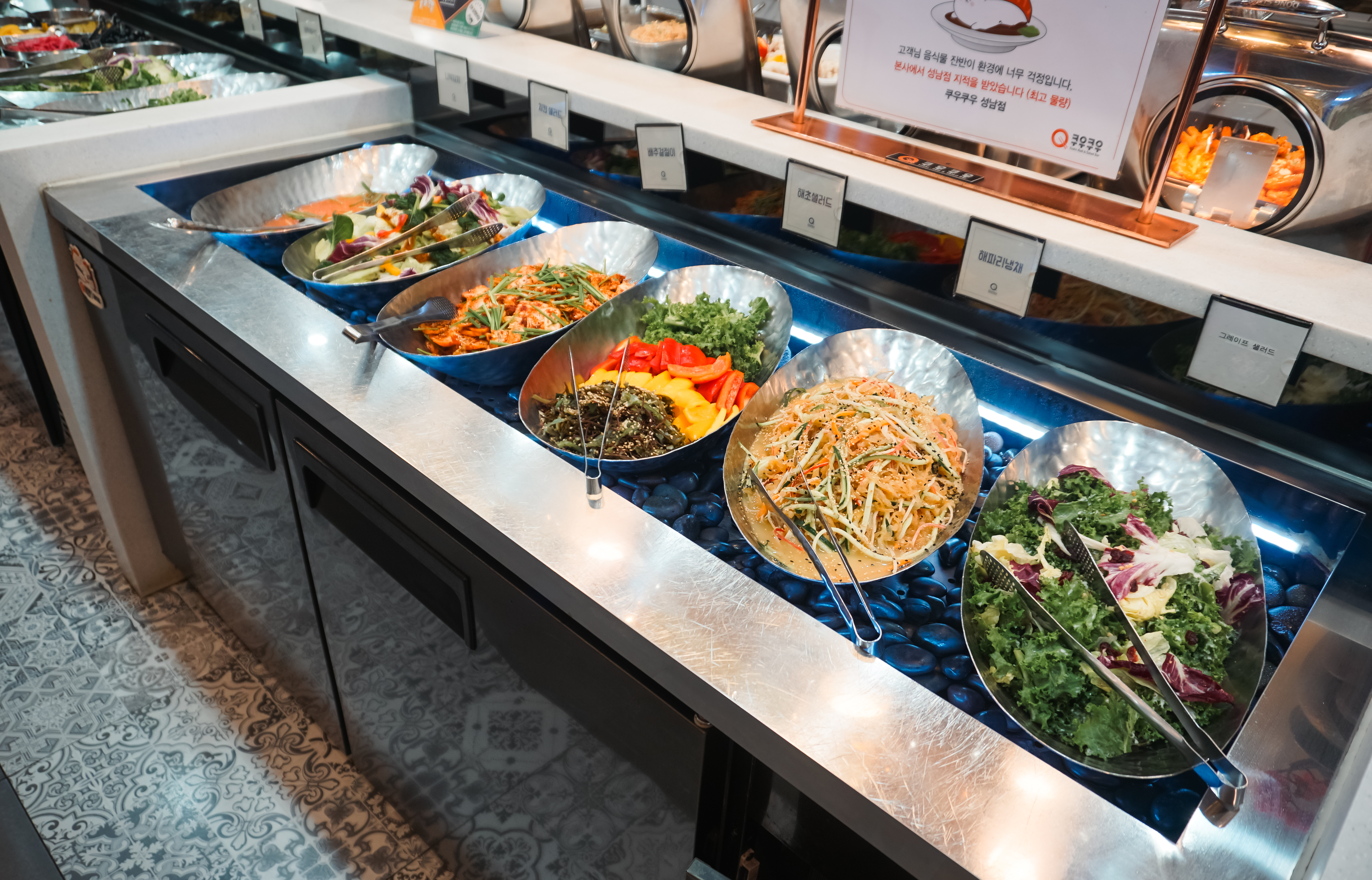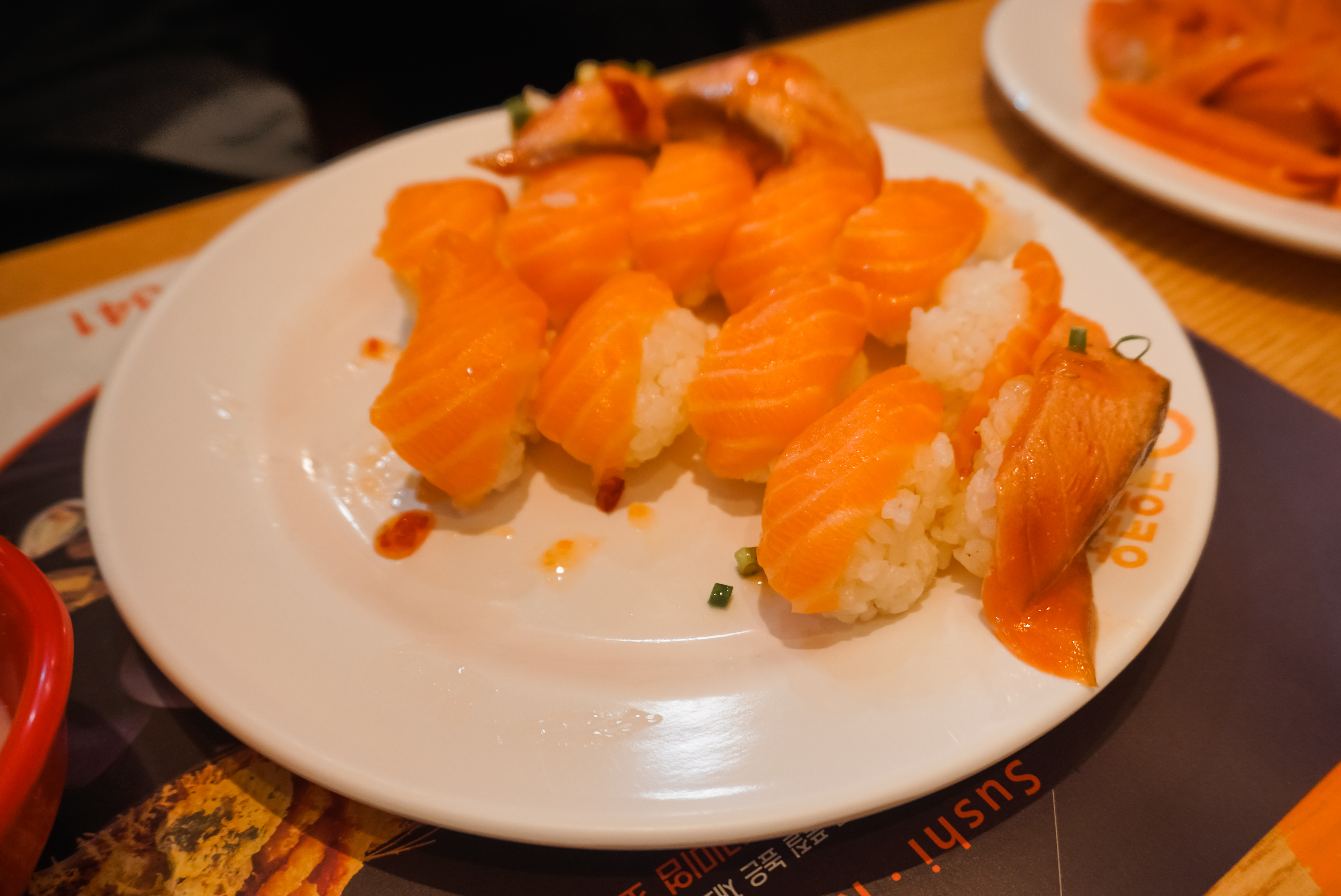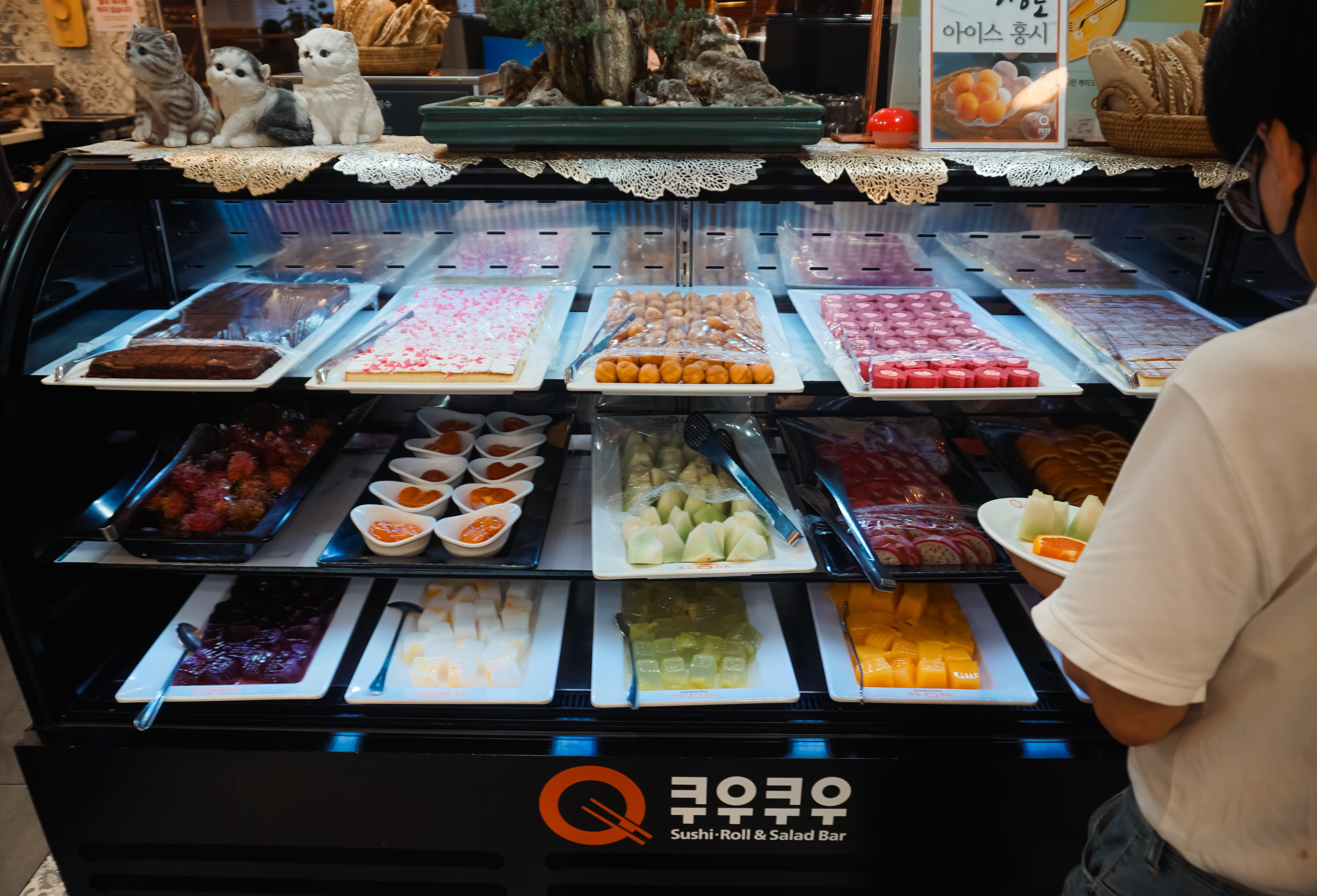 메인 메뉴인 초밥과 샐러드의 모습입니다. 다른 쿠우쿠우에는 육회 같은 메뉴도 있었던 것 같은데, 본점에는 안보이더라고요. 초밥은 솔직히 밥이 좀 잘 부서져서 담아 오기가 쉽지 않더라고요. 그래도 밥 위에 올라가는 횟감이나 다른 재료들은 신선한 듯 보였습니다.