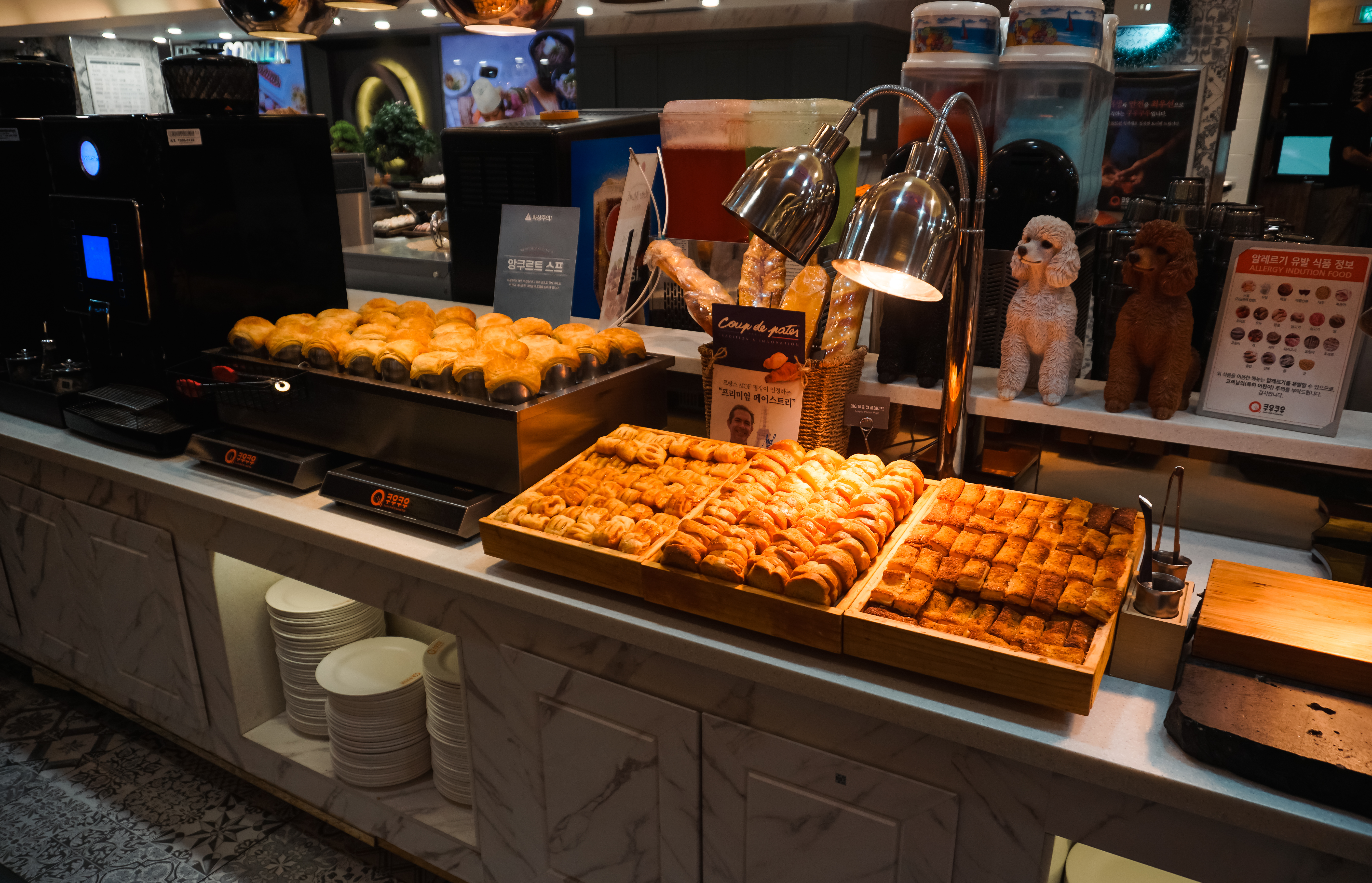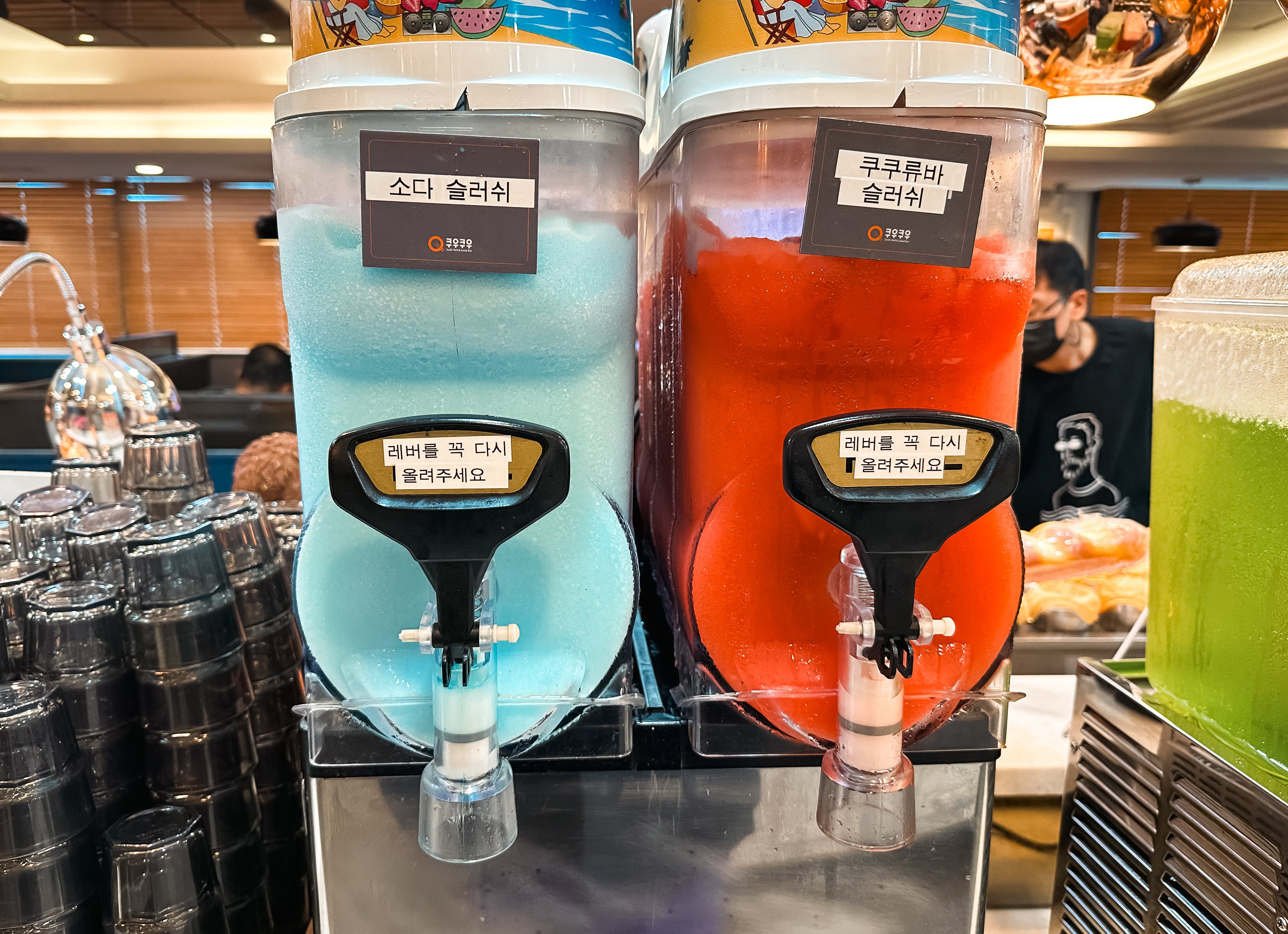 다음 코너인 디저트와 빵 등의 코너입니다. 다른 메뉴들에 집중하다 보면 손이 잘 안 가는 코너인데 사진은 찍어보았습니다. 음료는 다른 뷔페들처럼 음료 디스펜서와 슬러시, 아이스크림, 차, 커피 등 다양하게 구비되어 있었습니다.