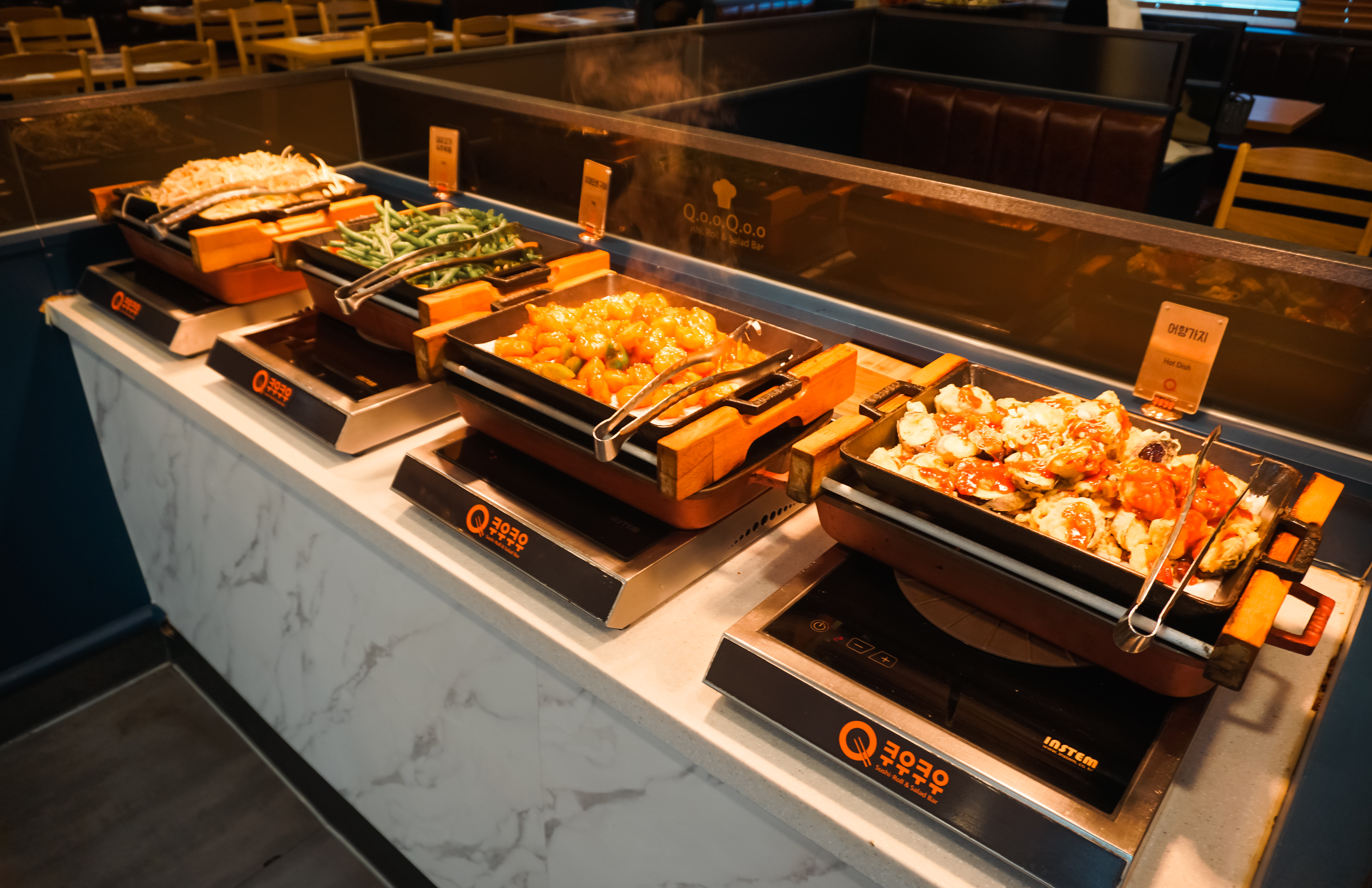 11시 쿠우쿠우 오픈시간에 맞춰서 가게에 입장할 수 있었습니다. 메뉴는 피자, 치킨, 볶음, 구이, 튀김요리, 샐러드 등 다양하게 있었습니다. 저는 뷔페에 가면 처음에는 조금씩 이것저것 담아 오다가 입맛에 맞는 메뉴가 있으면, 많이 담아 오거나 여러 번에 걸쳐서 담아 오는 편인데, 본점이라고 해서 특별히 메뉴의 가짓수가 많지는 않았지만, 괜찮은 메뉴들이 많이 보였습니다.