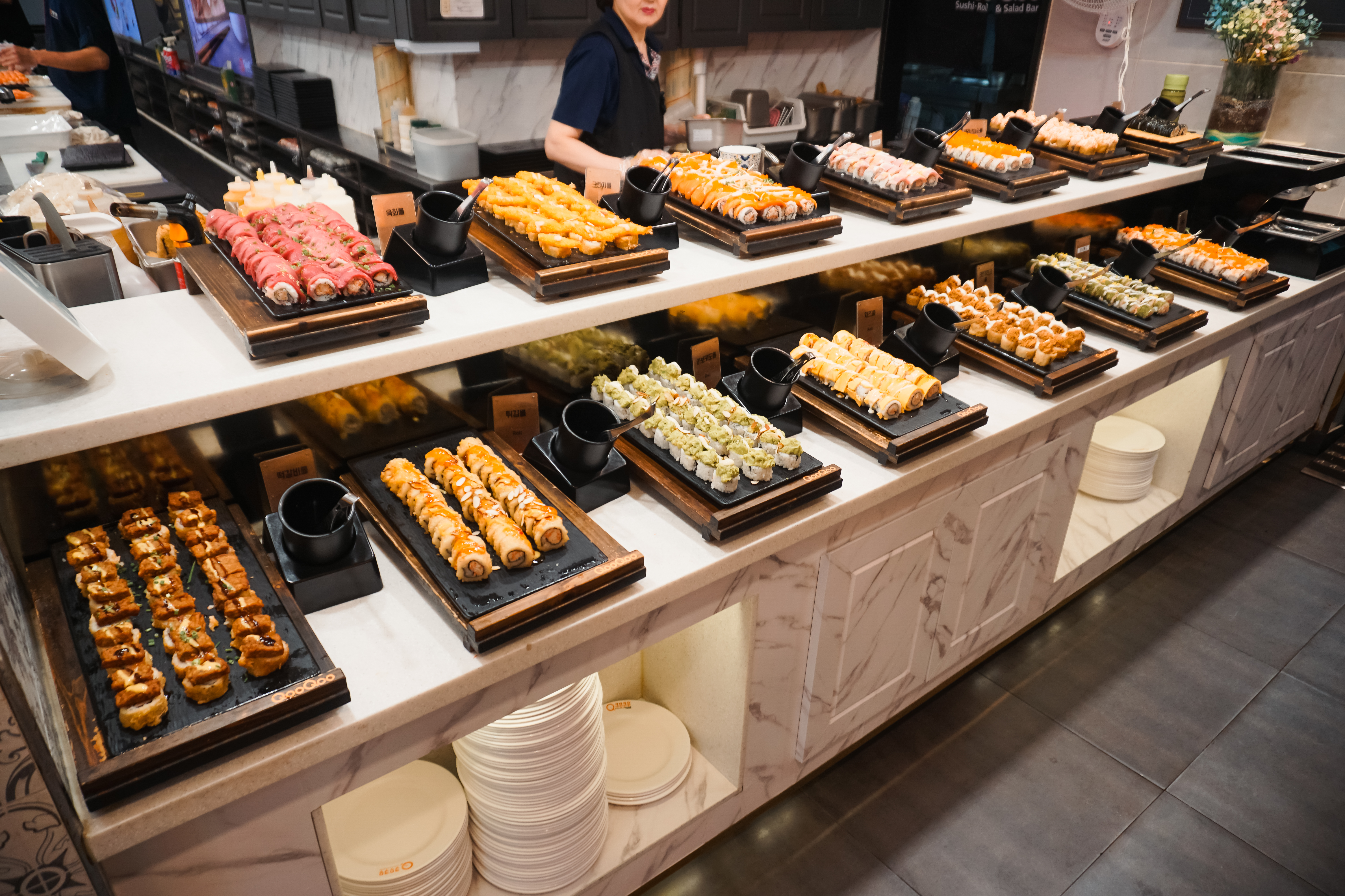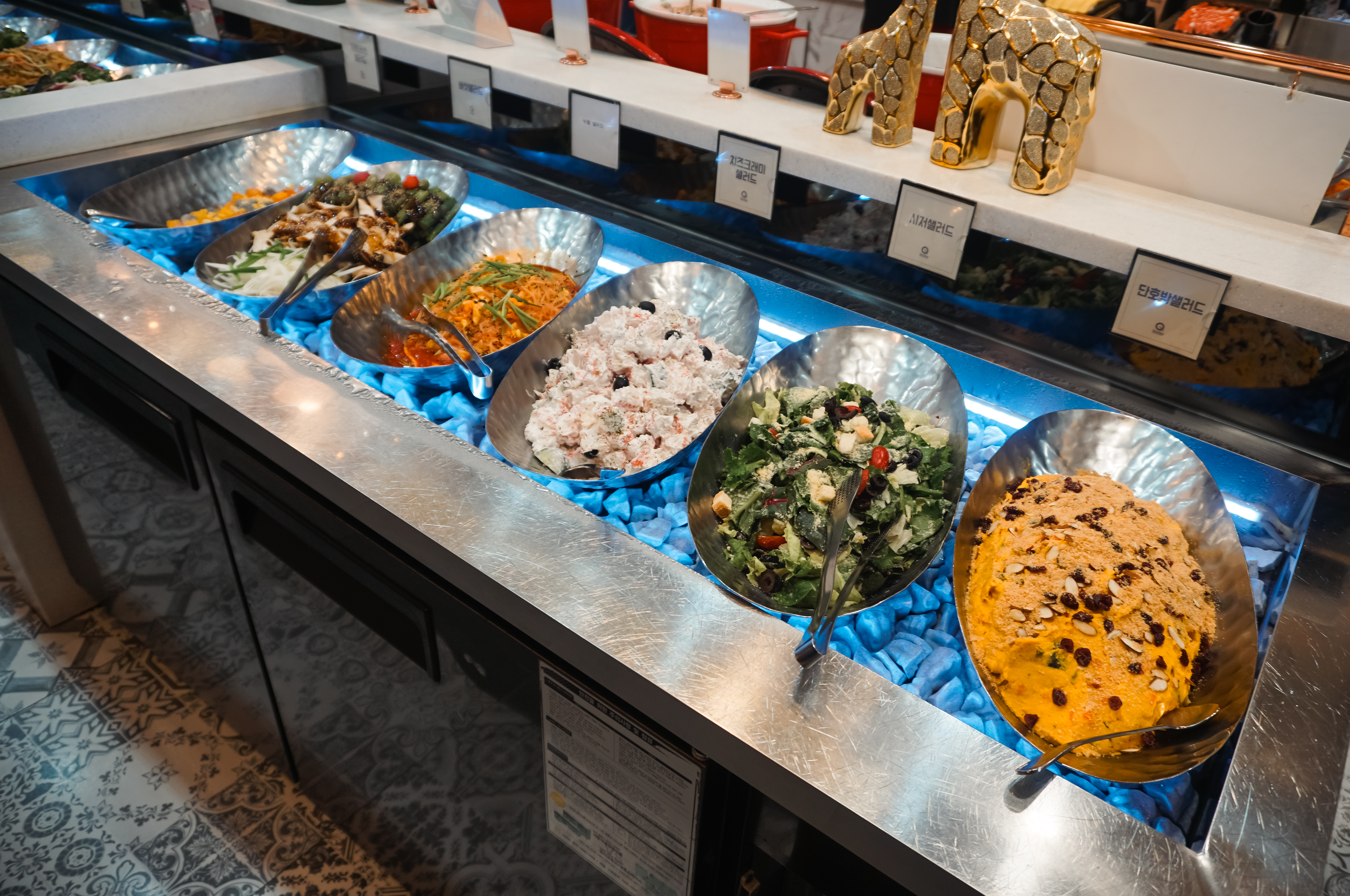 메인 메뉴인 초밥과 샐러드의 모습입니다. 다른 쿠우쿠우에는 육회 같은 메뉴도 있었던 것 같은데, 본점에는 안보이더라고요. 초밥은 솔직히 밥이 좀 잘 부서져서 담아 오기가 쉽지 않더라고요. 그래도 밥 위에 올라가는 횟감이나 다른 재료들은 신선한 듯 보였습니다.