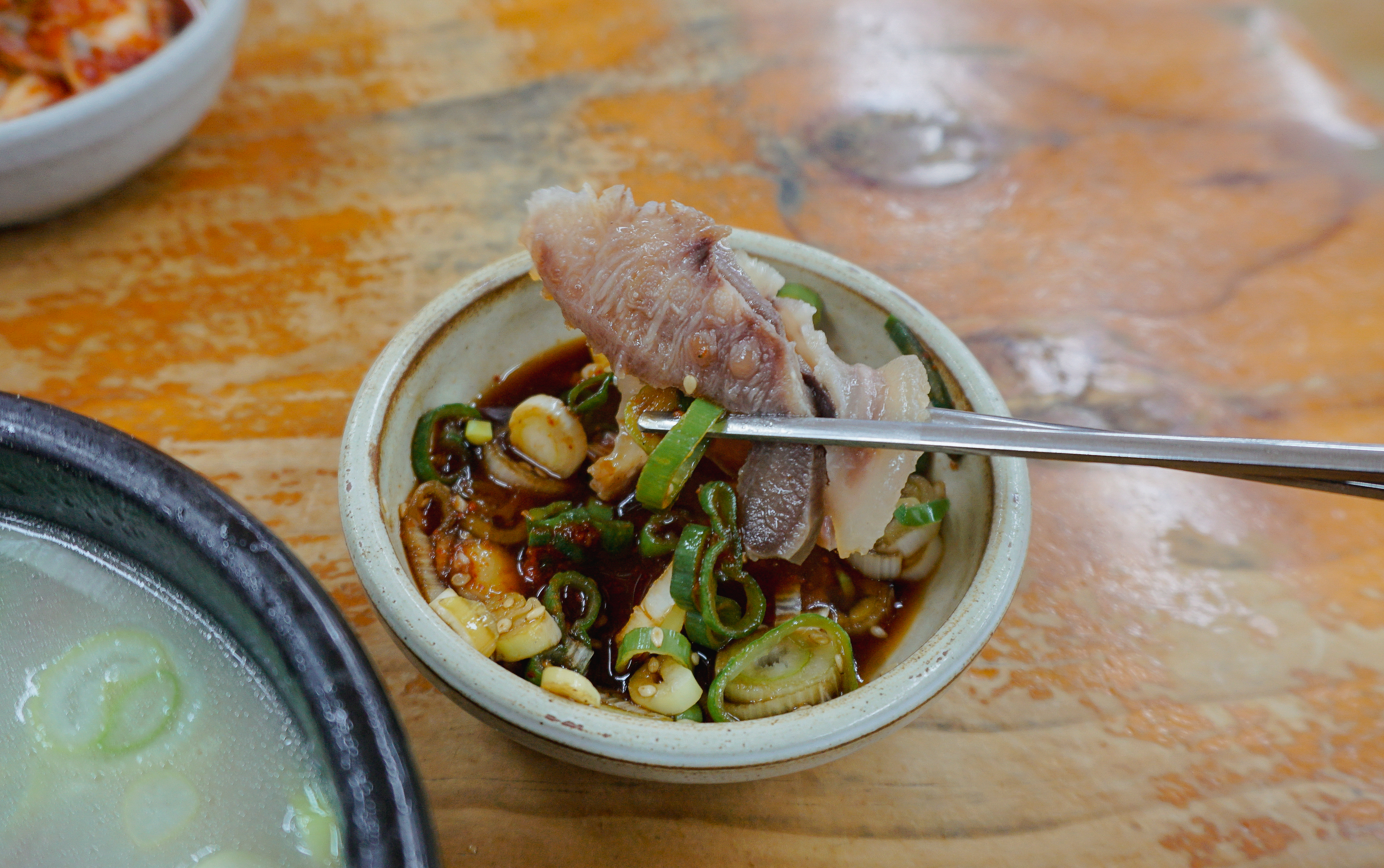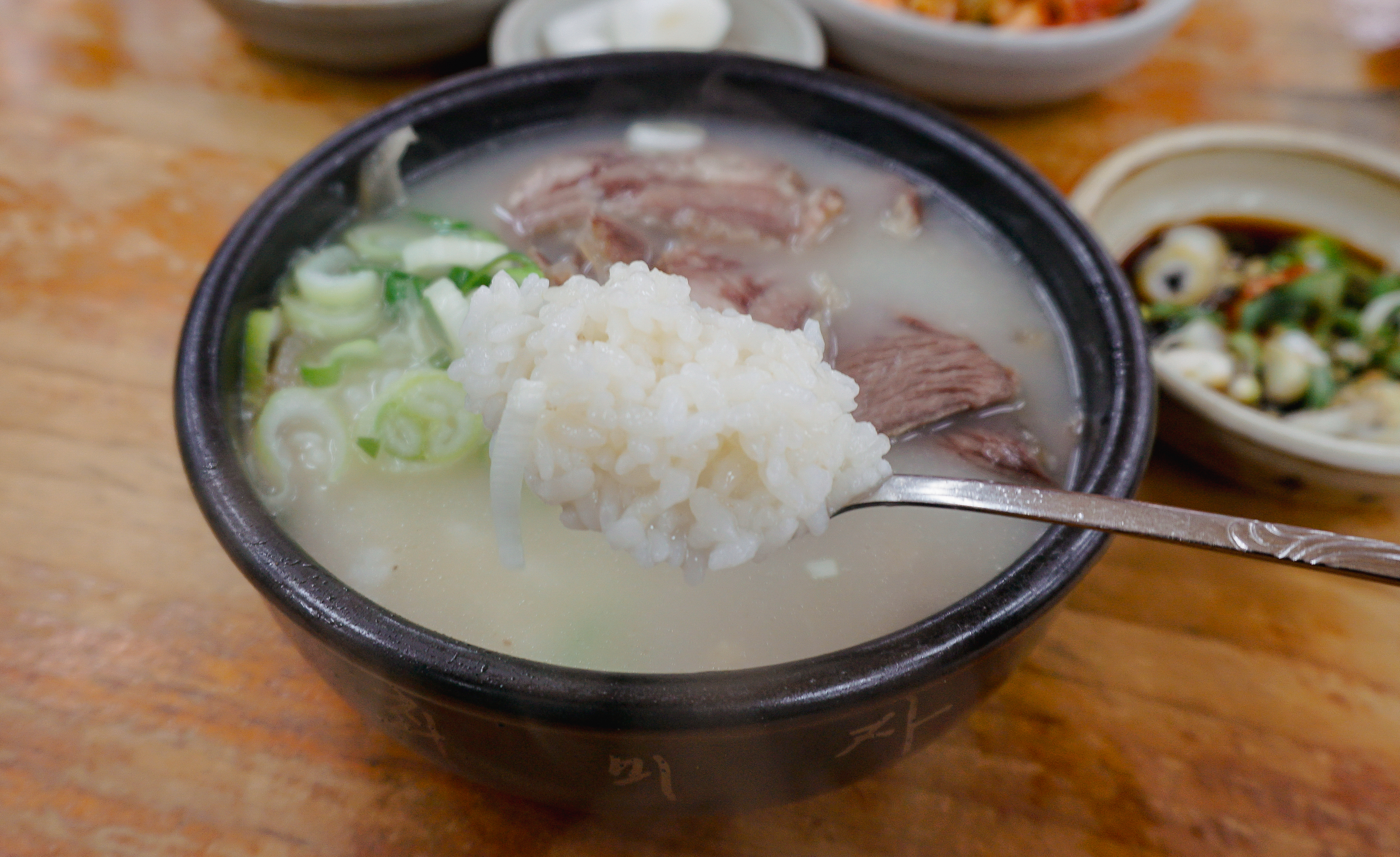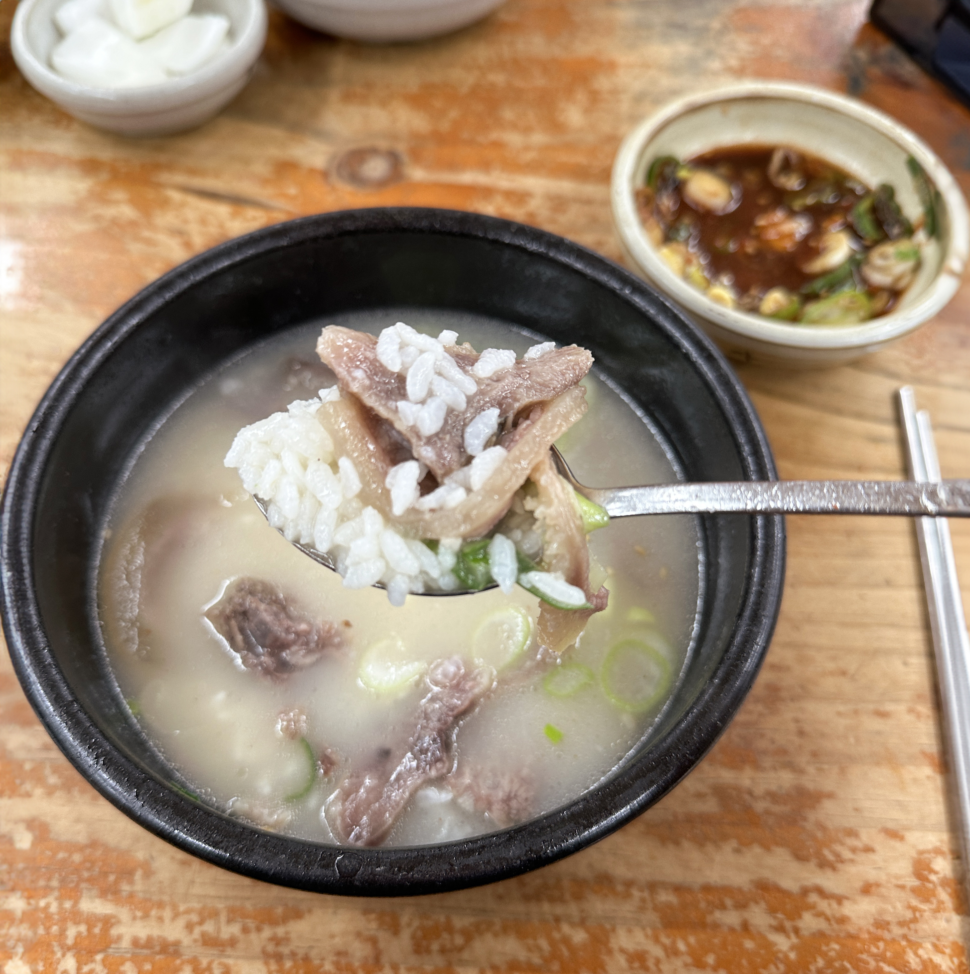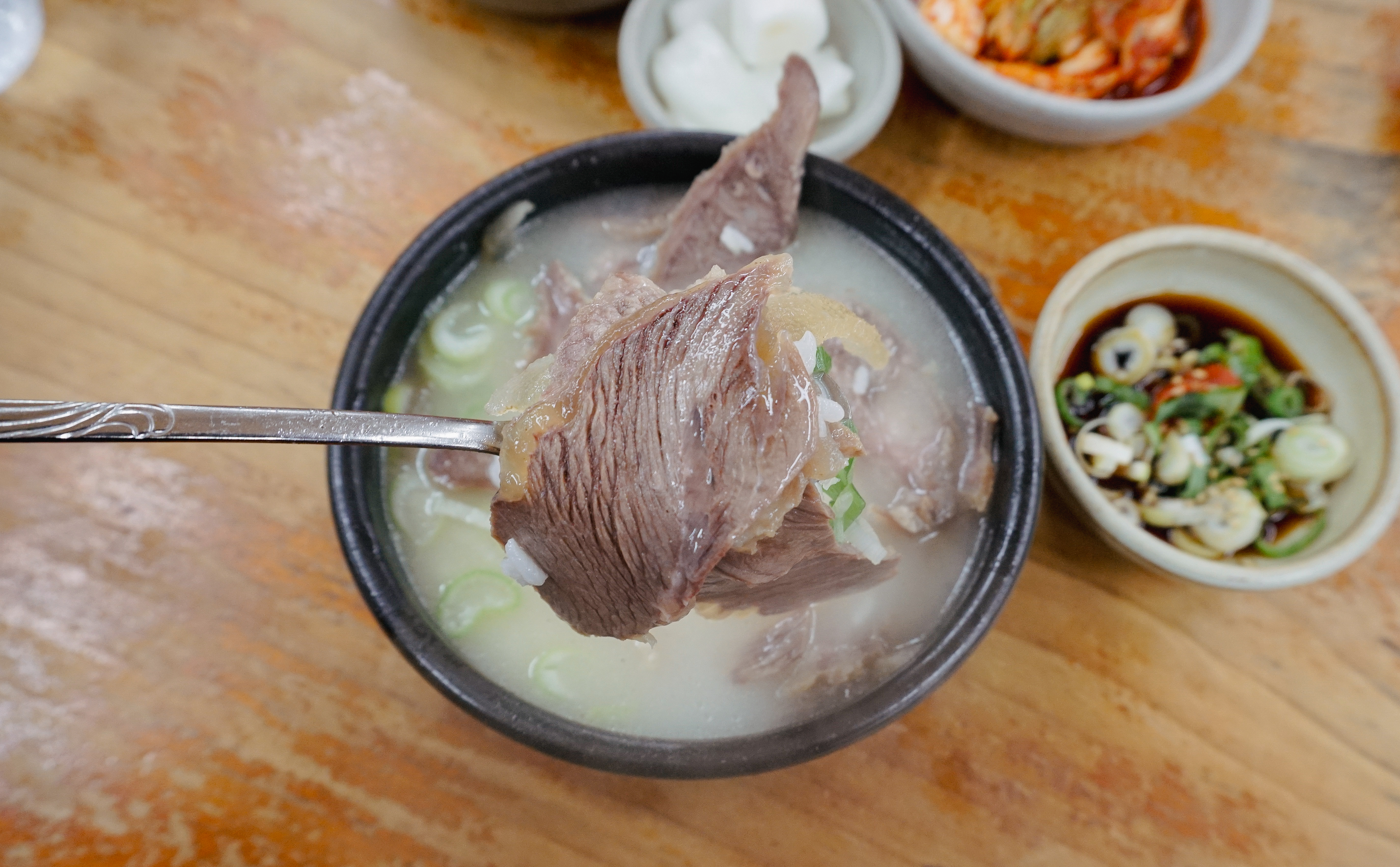 소머리국밥은 위와 같이 배추김치, 깍두기, 양파, 간장소스와 함께 제공되고 있었습니다. 소머리곰탕은 국물 속 고기가 많이 들어있었고, 같이 나오는 새콤한 간장소스와 같이 곁들여 먹으면 더 맛있더라고요.