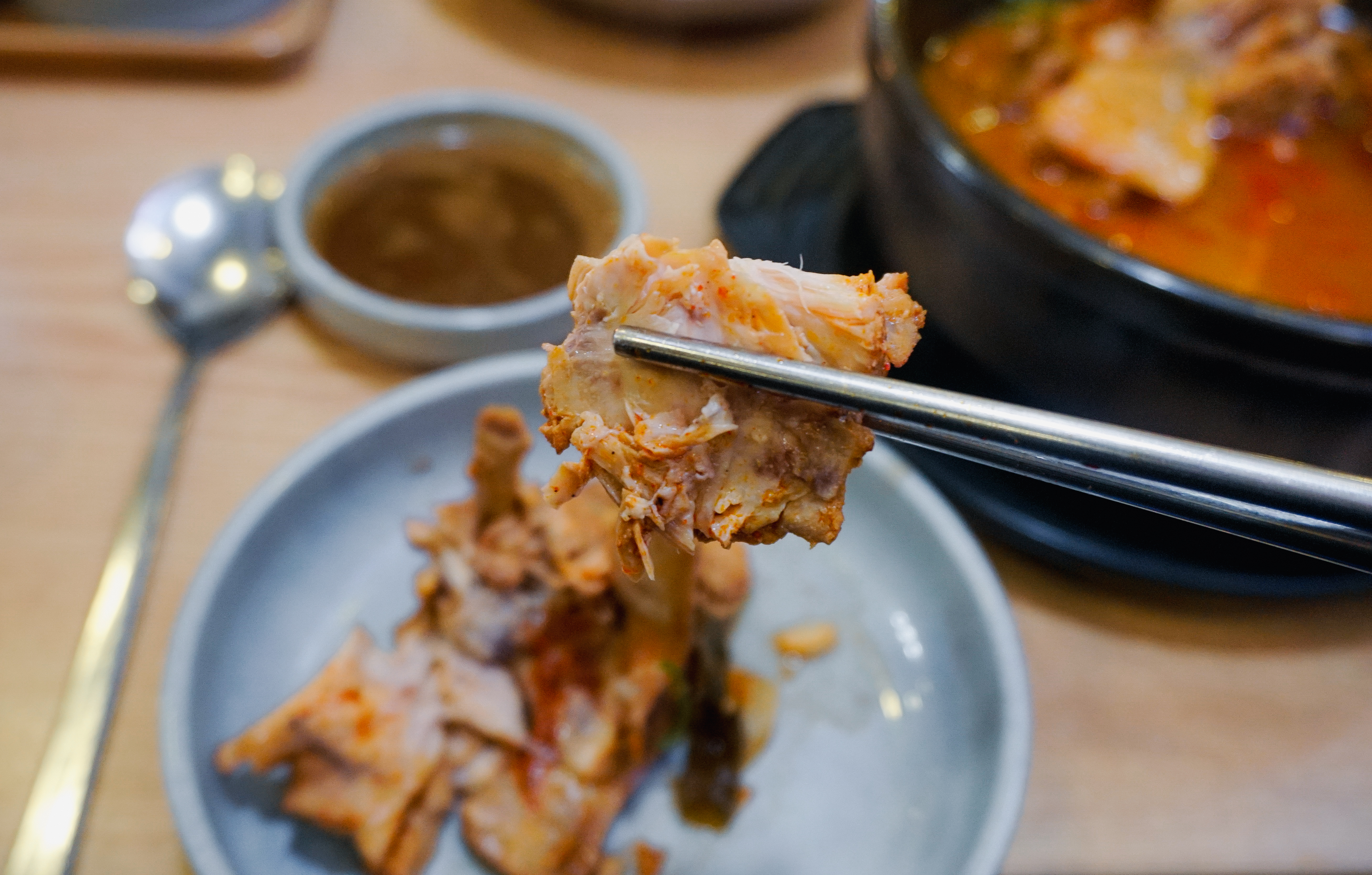 뼈해장국과 섞박지, 배추김치, 마늘장아찌 등이 나왔습니다. 이천 대한민국 1등감자탕의 뼈해장국은 고기가 좀 퍽퍽한 느낌이 있었는데, 솔직히 이천 대한민국1등감자탕의 뼈해장국은 제 입맛에 잘 맞지는 않더라고요.