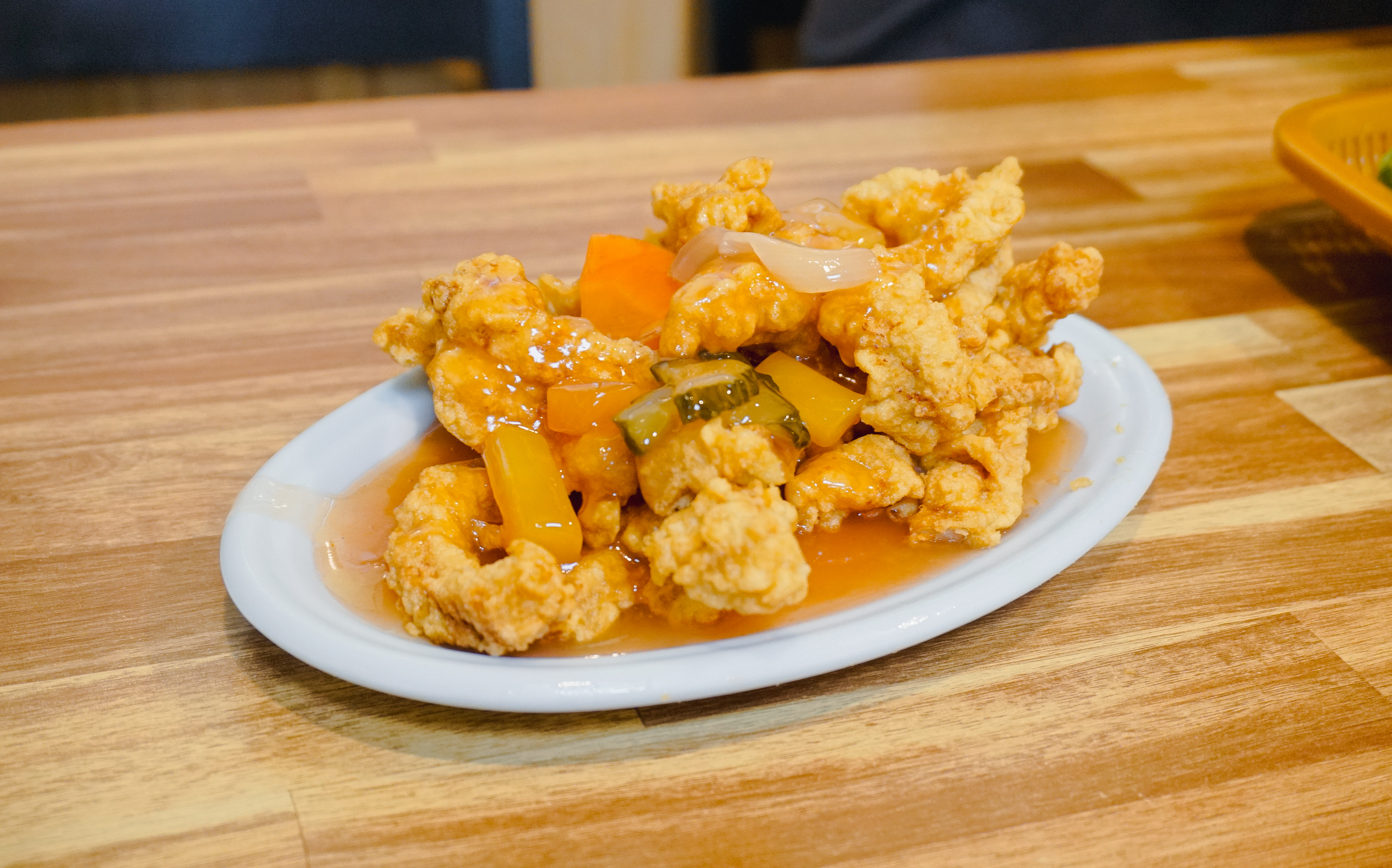 주문한 상추튀김과 탕수육이 나왔습니다. 상추튀김의 구성은 한 입 크기로 동그랗게 튀겨낸 오징어튀김과 고추 송송 썰어 넣은 양파장이 나왔습니다. 아주머니께 상추튀김에 대해 물어보니 "튀김이 느끼하니 고기에 싸 먹듯이, 상추에 튀김을 싸 먹는다" 라고 하시더라고요. 저는 살면서 한 번도 그런 생각을 가져본 적이 없었는데, 듣고 보니 어느 정도 이해가 되더라고요.