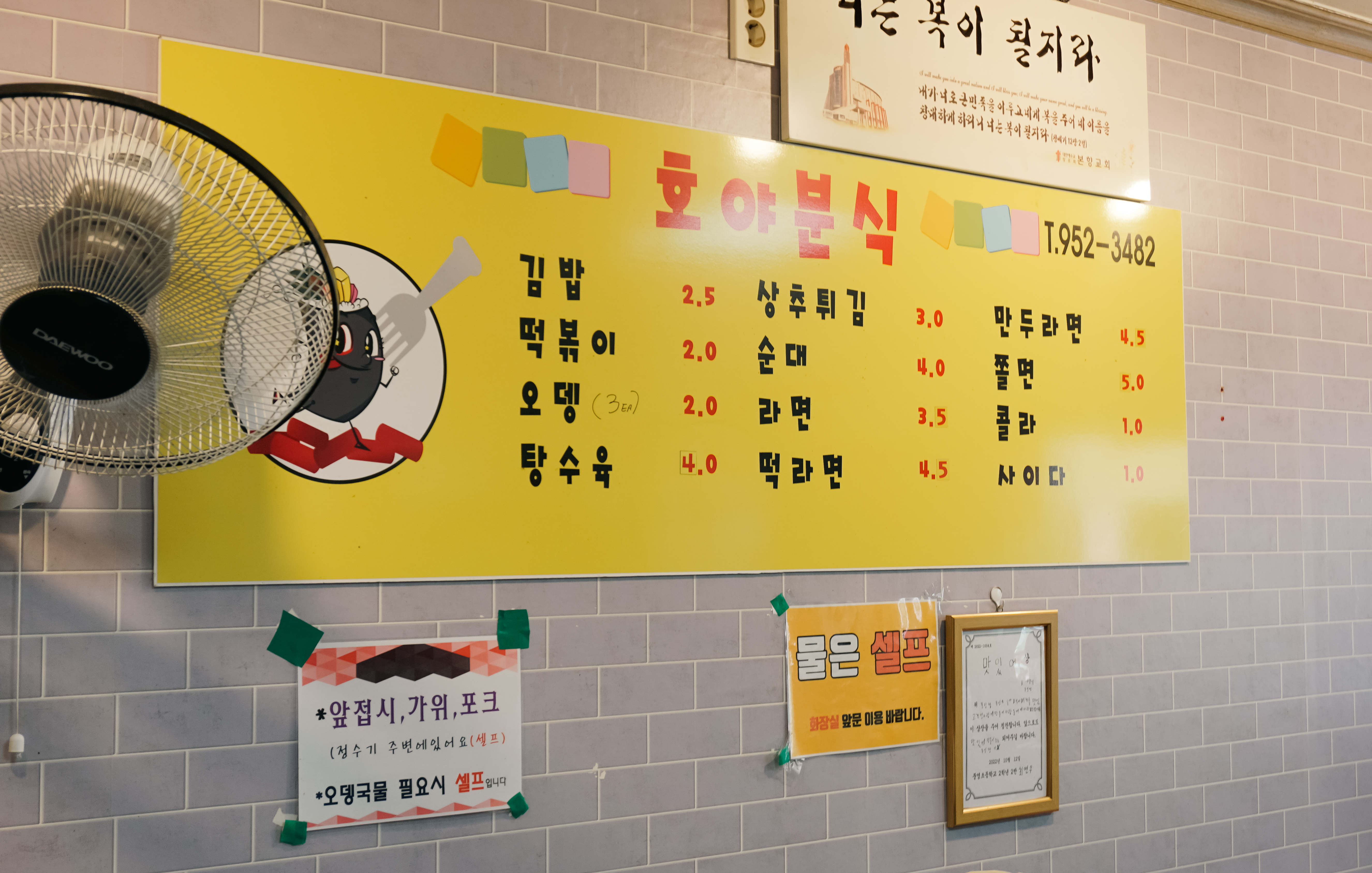 신가동 호야분식 메뉴부터 확인해 보시면 김밥, 떡볶이, 오뎅, 탕수육, 상추튀김, 순대, 라면, 떡라면, 만두라면, 쫄면 등이 있었습니다. 특히 광주 가성비 상추튀김 맛집 호야분식은 가격이 매력이었는데, 대부분의 메뉴가 2,000원~5,000원 사이로 부담 없이 먹을 수 있다는 점이 좋았습니다.