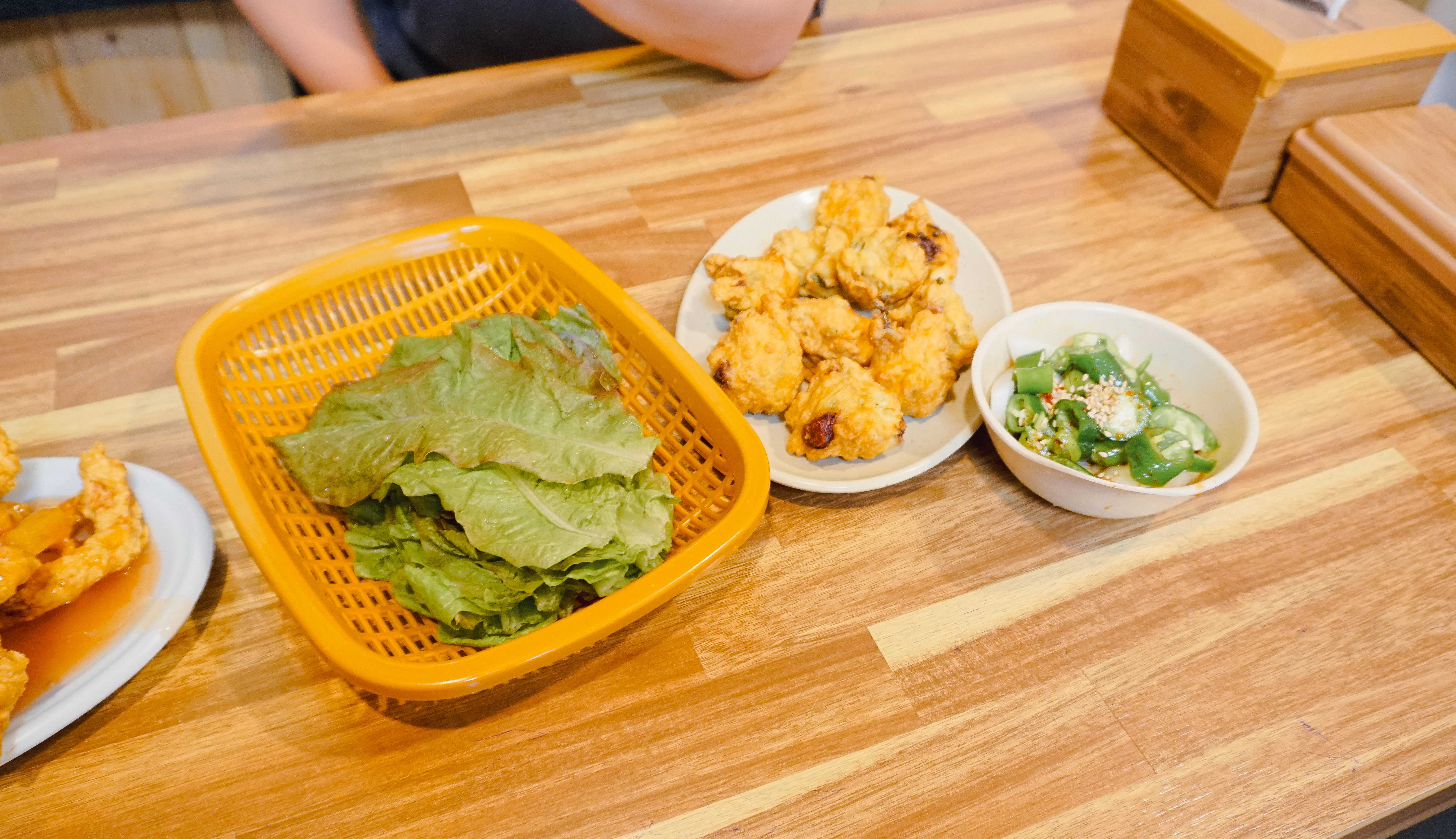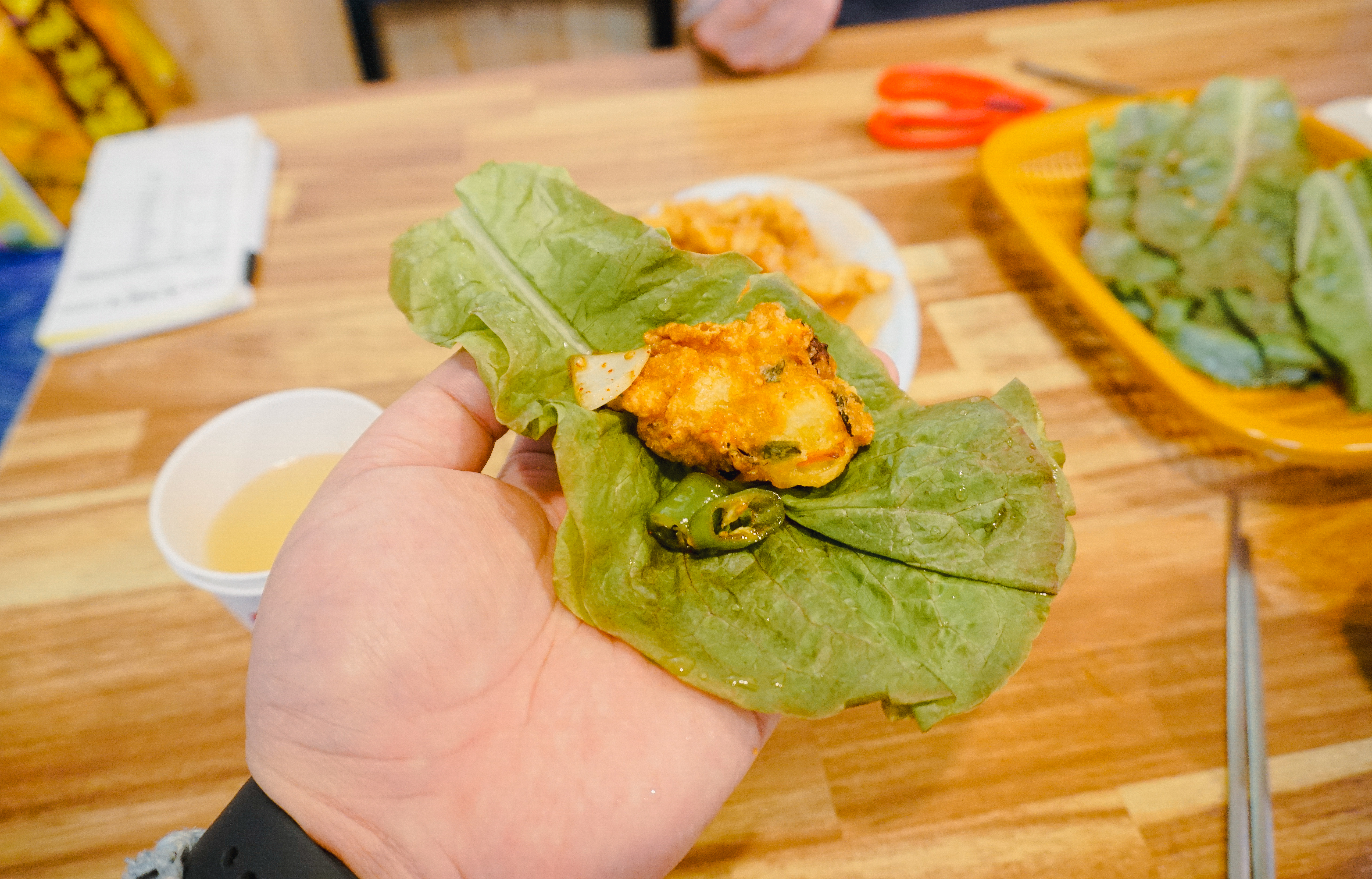 실제로 튀김을 상추에 싸서 양파, 고추와 함께 먹으니 느끼한 맛은 적었고, 뭔가 조합이 생각했던 것보다는 괴식이라기보다는 잘 어울리더라고요. 가격도 3,000원이면 꽤나 저렴한 편이었고요.