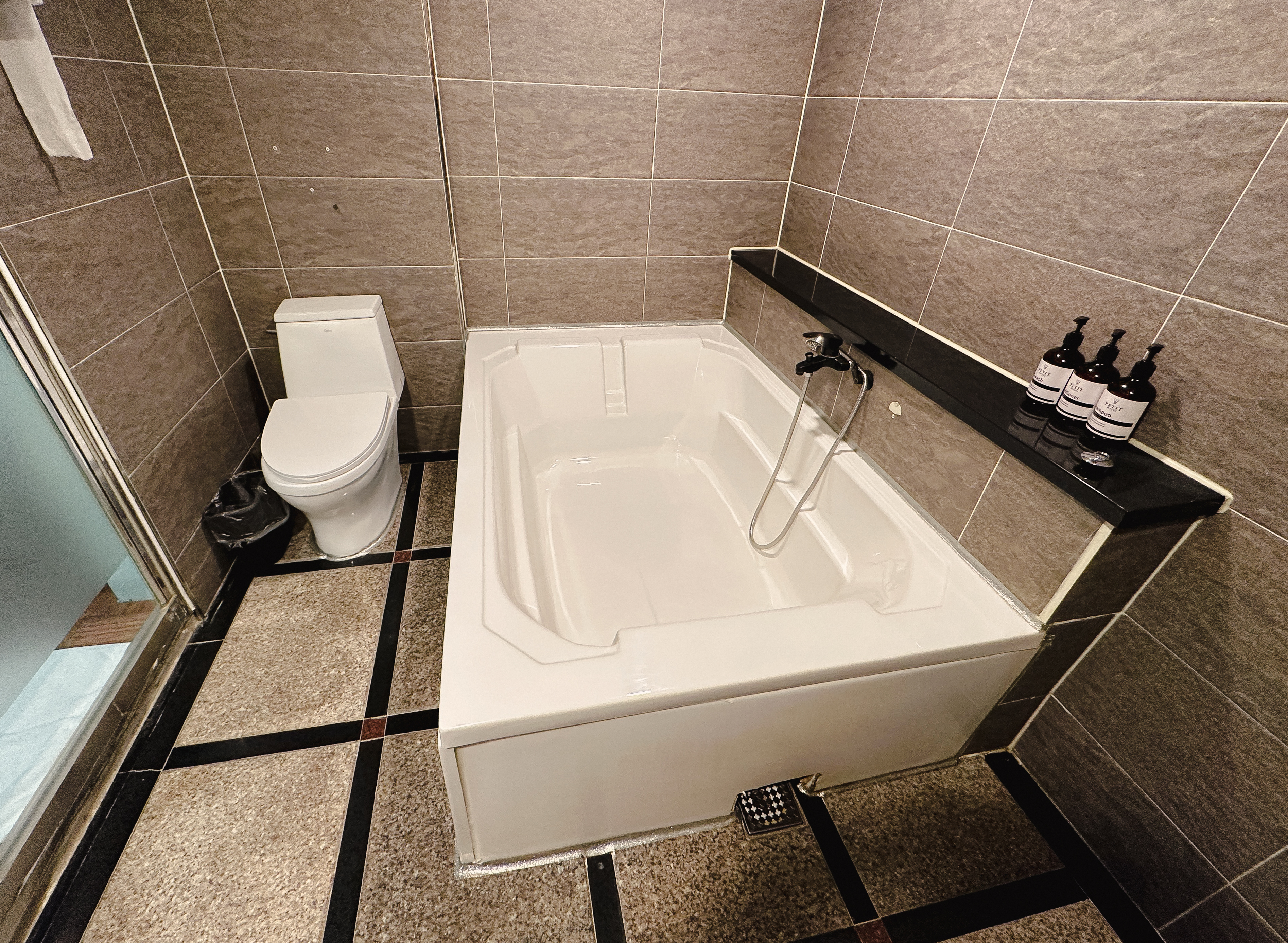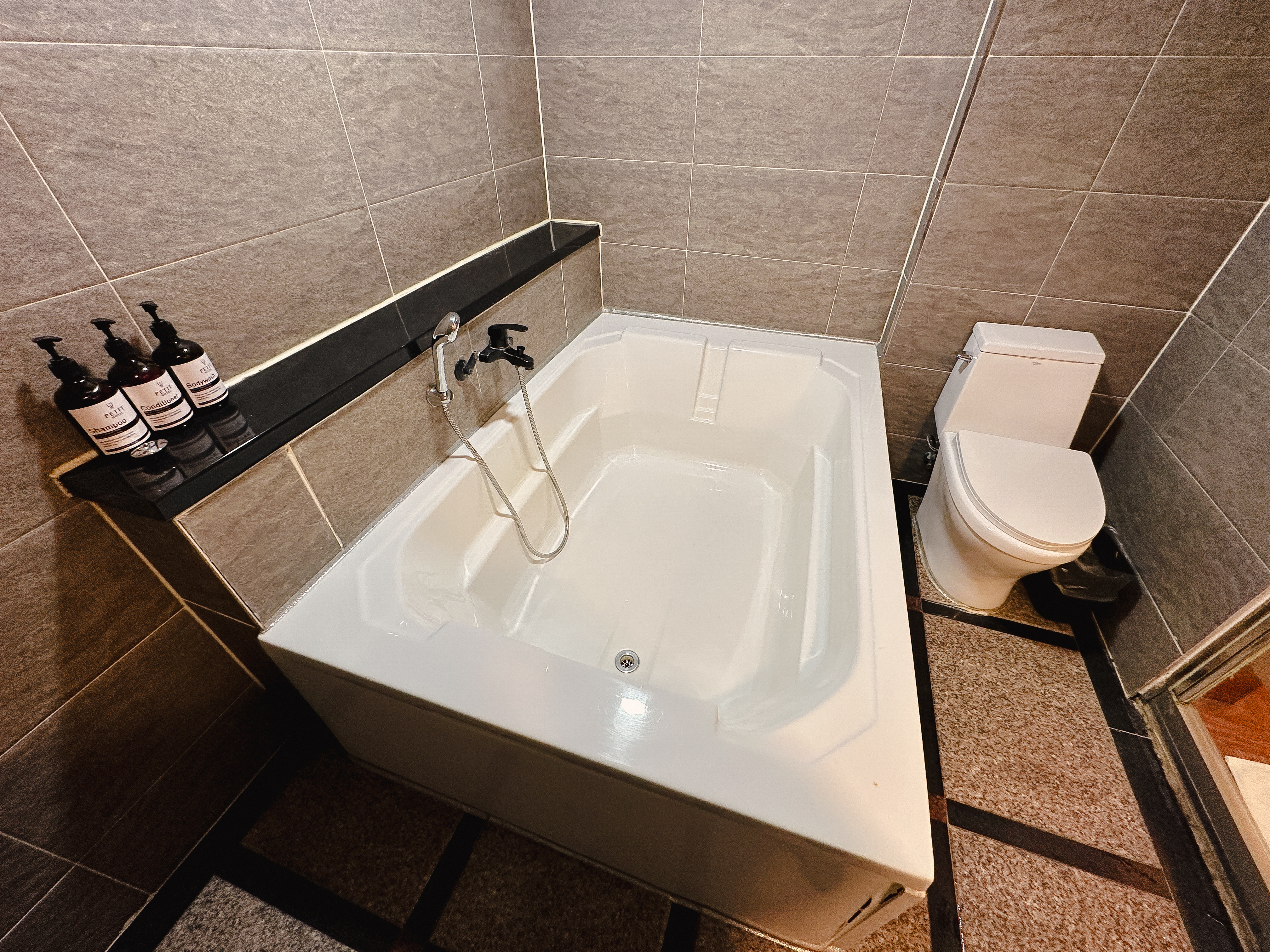 욕실에는 꽤 큰 크기의 욕조가 있었고, 그밖에 세면대와 변기등이 따로 구분 없이 욕실에 모두 배치되어 있었습니다. 바디워시와 컨디셔너, 샴푸는 개별용기로 준비되어 있었고 비누는 공용으로 사용하도록 되어있었습니다. 저는 요즘같이 쌀쌀해지는 날씨에 이런 욕조 있는 숙소에 가서 목욕을 하는 것을 좋아하는데, 욕조가 커서 채우는데 시간이 좀 오래 소요되지만 한 번 목욕을 하고 나면 피로가 싹 풀리는 느낌이더라고요.