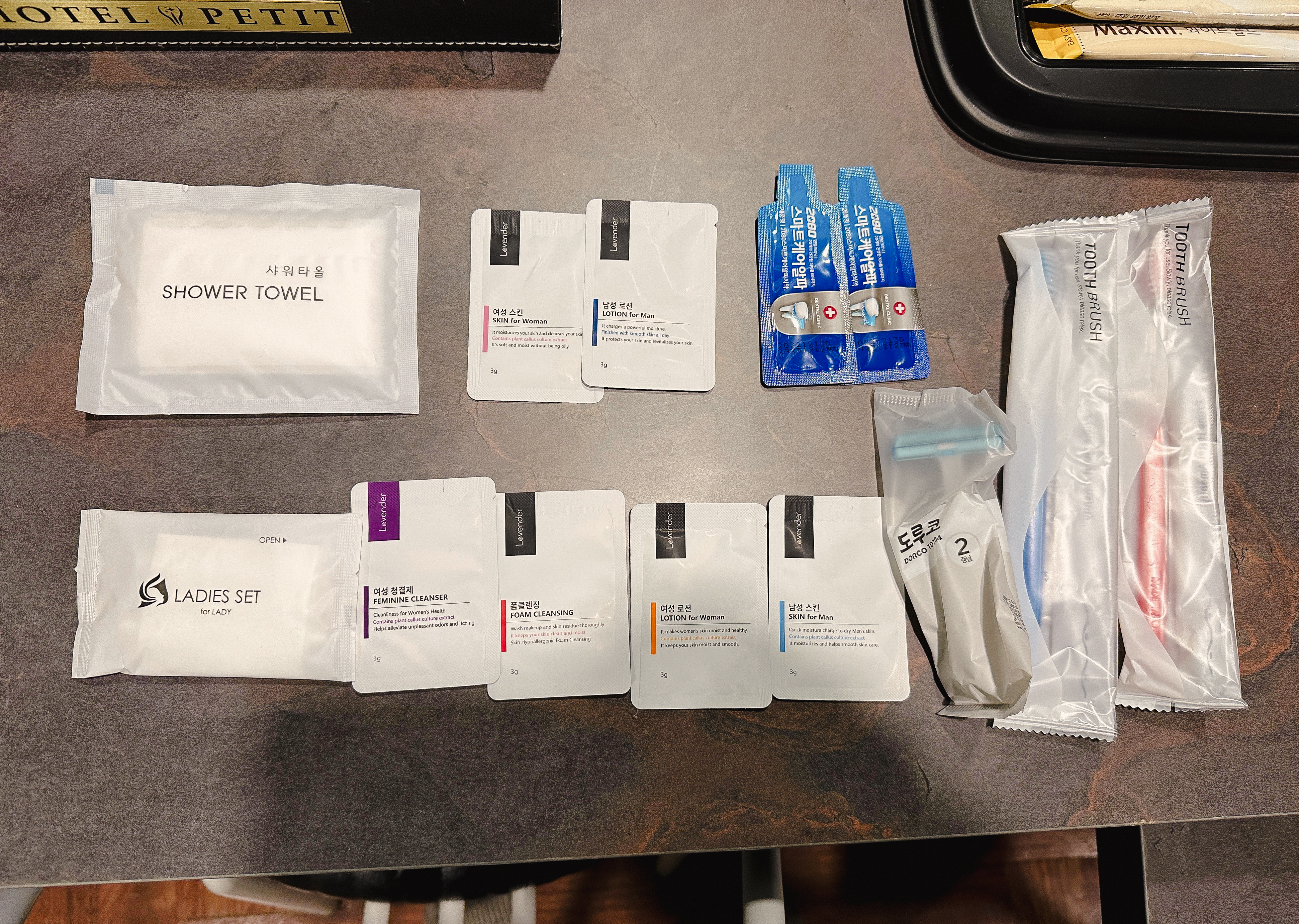 김포 쁘띠호텔은 위와 같이 일회용품을 제공하고 있었고, 방은 바닥난방이 들어오고 에어컨은 객실에서 직접 제어할 수 있도록 하고 있었습니다. 침대는 꽤 크고 널찍했으며 혼자서 이용하기엔 부족함 없는 숙소였습니다. 크기도 크고 청소상태도 잘 되어있었습니다.
