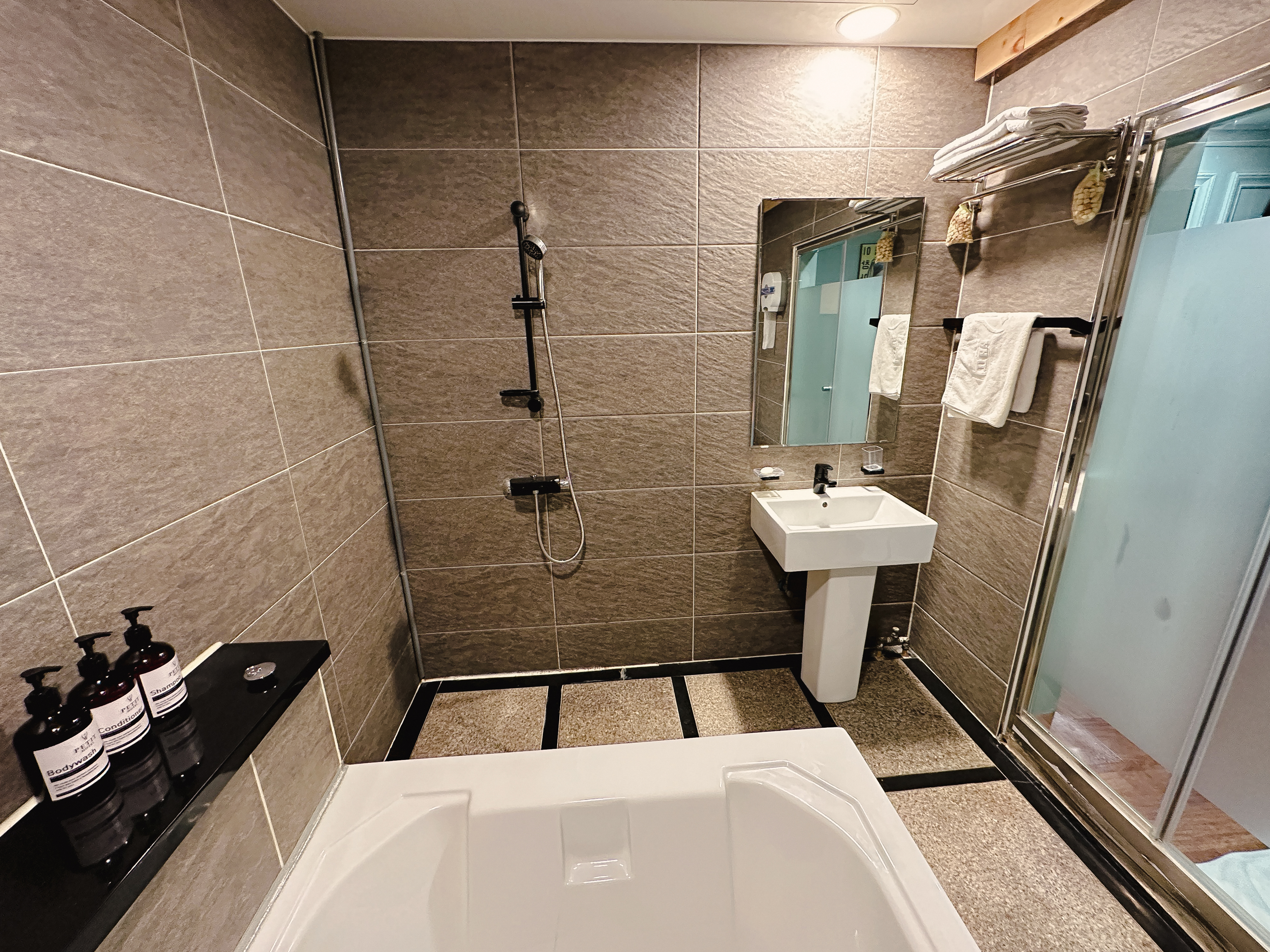 욕실에는 꽤 큰 크기의 욕조가 있었고, 그밖에 세면대와 변기등이 따로 구분 없이 욕실에 모두 배치되어 있었습니다. 바디워시와 컨디셔너, 샴푸는 개별용기로 준비되어 있었고 비누는 공용으로 사용하도록 되어있었습니다. 저는 요즘같이 쌀쌀해지는 날씨에 이런 욕조 있는 숙소에 가서 목욕을 하는 것을 좋아하는데, 욕조가 커서 채우는데 시간이 좀 오래 소요되지만 한 번 목욕을 하고 나면 피로가 싹 풀리는 느낌이더라고요.
