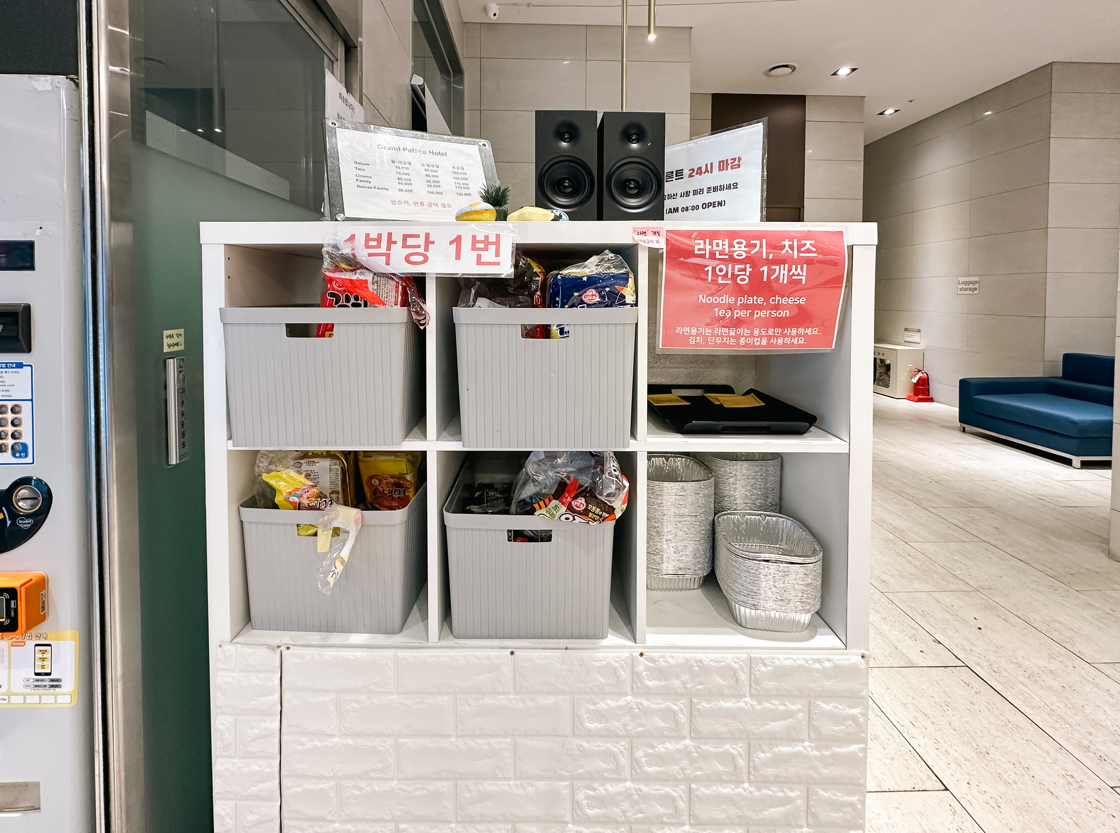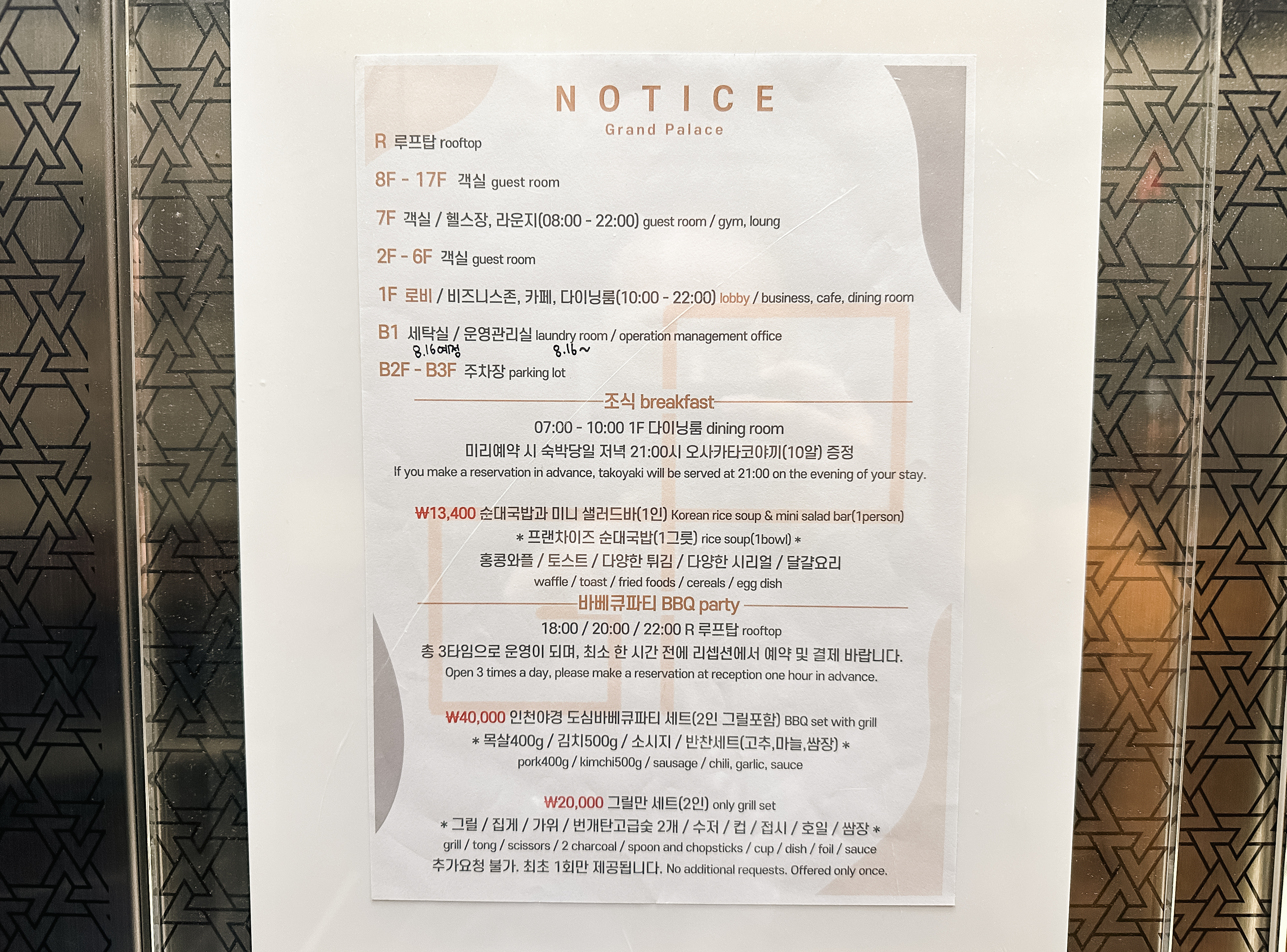 그랜드팰리스호텔은 인천 남동구 논현동 647-5 에 위치해 있었습니다. 건물 뒤편에 SUV와 승용차를 주차할 수 있는 기계식 주차장이 마련되어 있었고, 1층에는 음료와 편의용품을 판매하는 자판기가 있었고, 투숙객을 위해 팝콘이나 라면, 음료를 만들어 먹을 수 있도록 셀프바를 마련해 두었습니다.