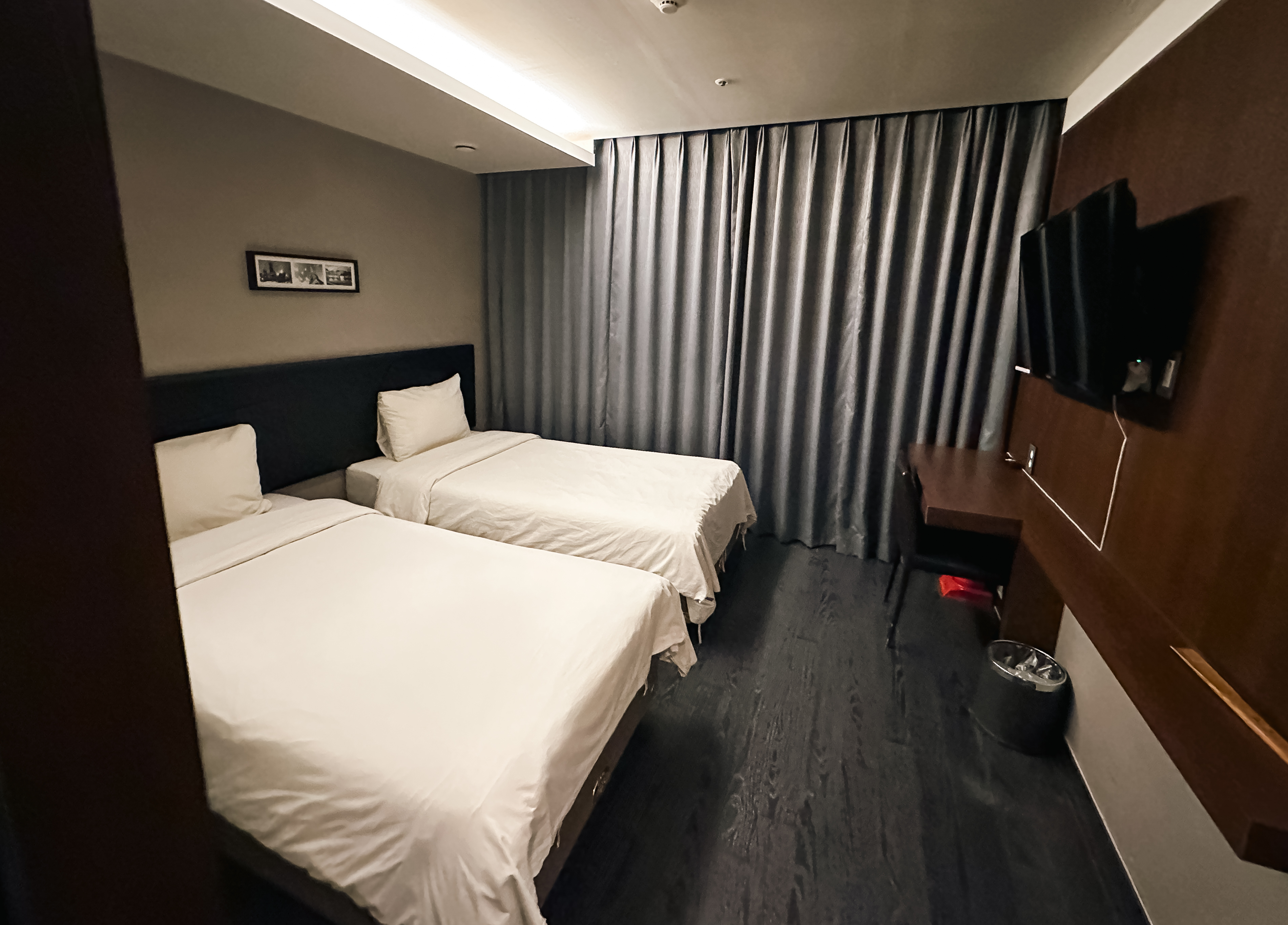 객실은 중앙냉난방으로 되어있었는데, 저녁에 조금 더워서 에어컨을 세게 틀고 싶었는데 조절이 안되어 불편하더라고요. 그밖에 TV와 냉장고, 커피포트가 있었습니다. 객실에는 간단한 작업을 할 수 있는 책상이 2군데 마련되어 있어서 간단한 업무를 할 수도 있었습니다.