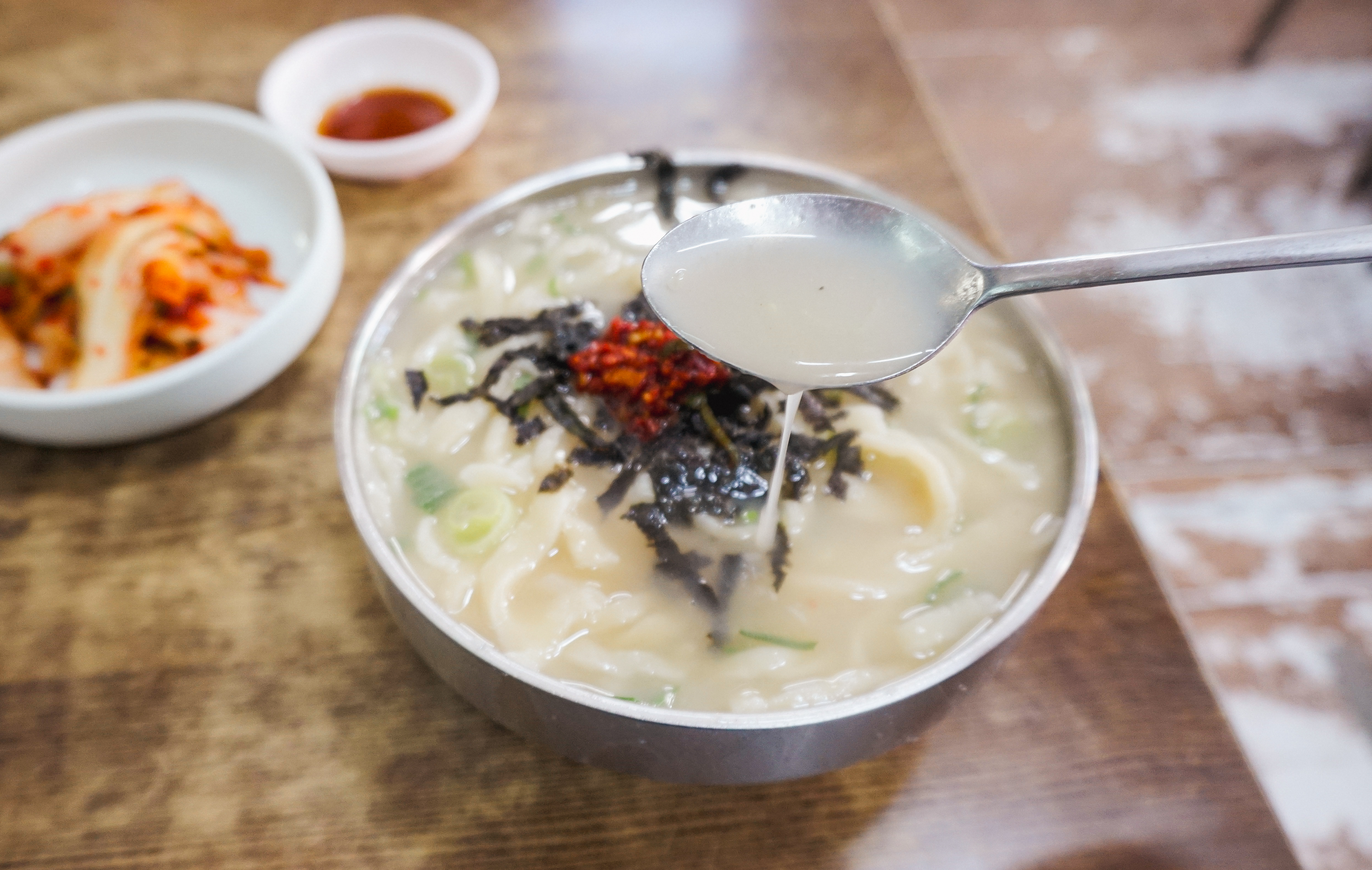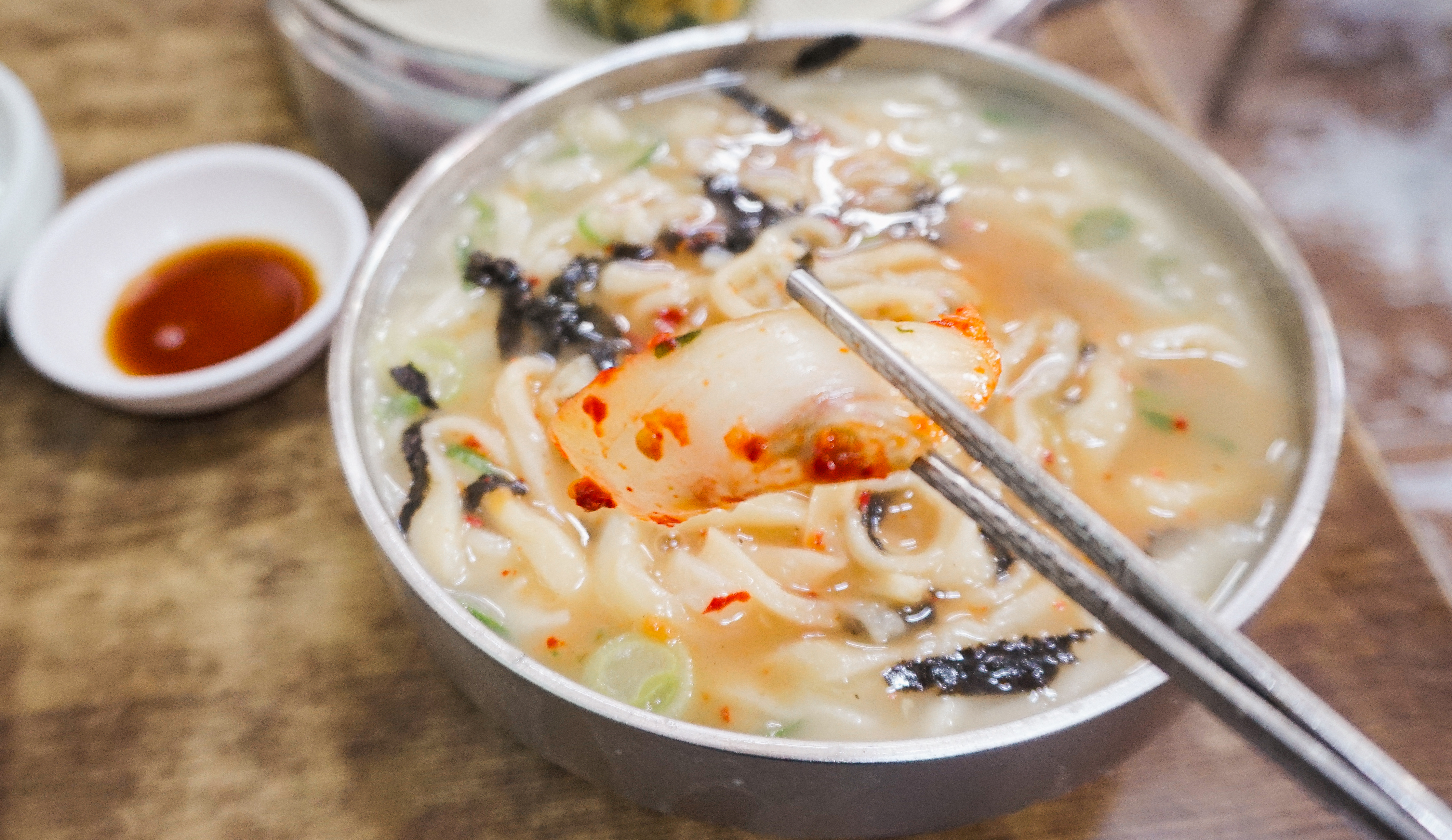 프라자손칼국수의 칼국수는 사골을 이용해 걸쭉하면서도 진한 육수가 특징이었고, 그 위에 김가루와 양념장을 얹어주는데 저는 양념장이 좀 자극적이라 크게 좋아하지는 않지만 그래도 프라자손칼국수만의 특징이니 그냥 먹었죠. 배추김치도 아삭아삭 맛이 좋았습니다.