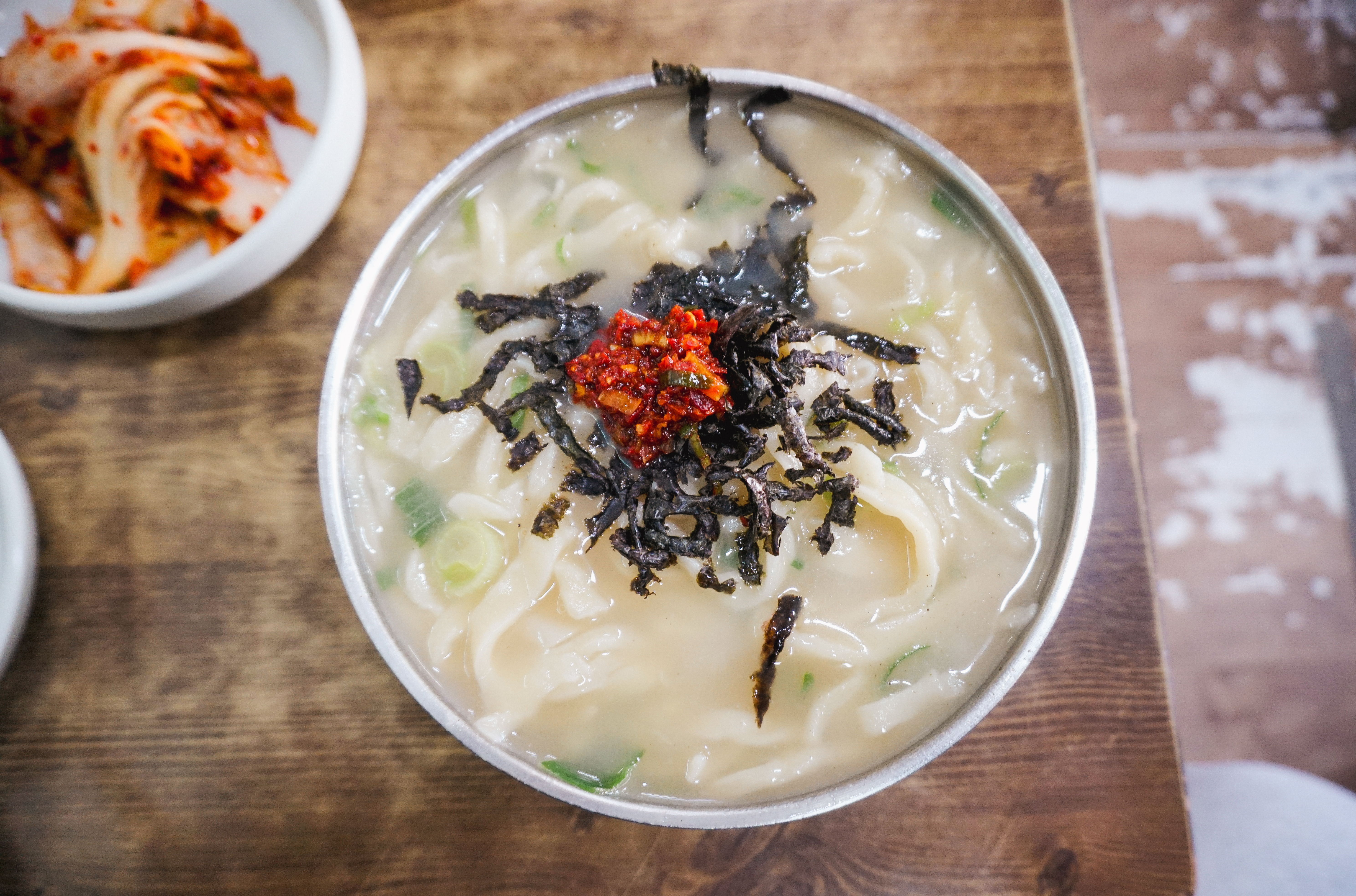 프라자손칼국수의 칼국수는 사골을 이용해 걸쭉하면서도 진한 육수가 특징이었고, 그 위에 김가루와 양념장을 얹어주는데 저는 양념장이 좀 자극적이라 크게 좋아하지는 않지만 그래도 프라자손칼국수만의 특징이니 그냥 먹었죠. 배추김치도 아삭아삭 맛이 좋았습니다.