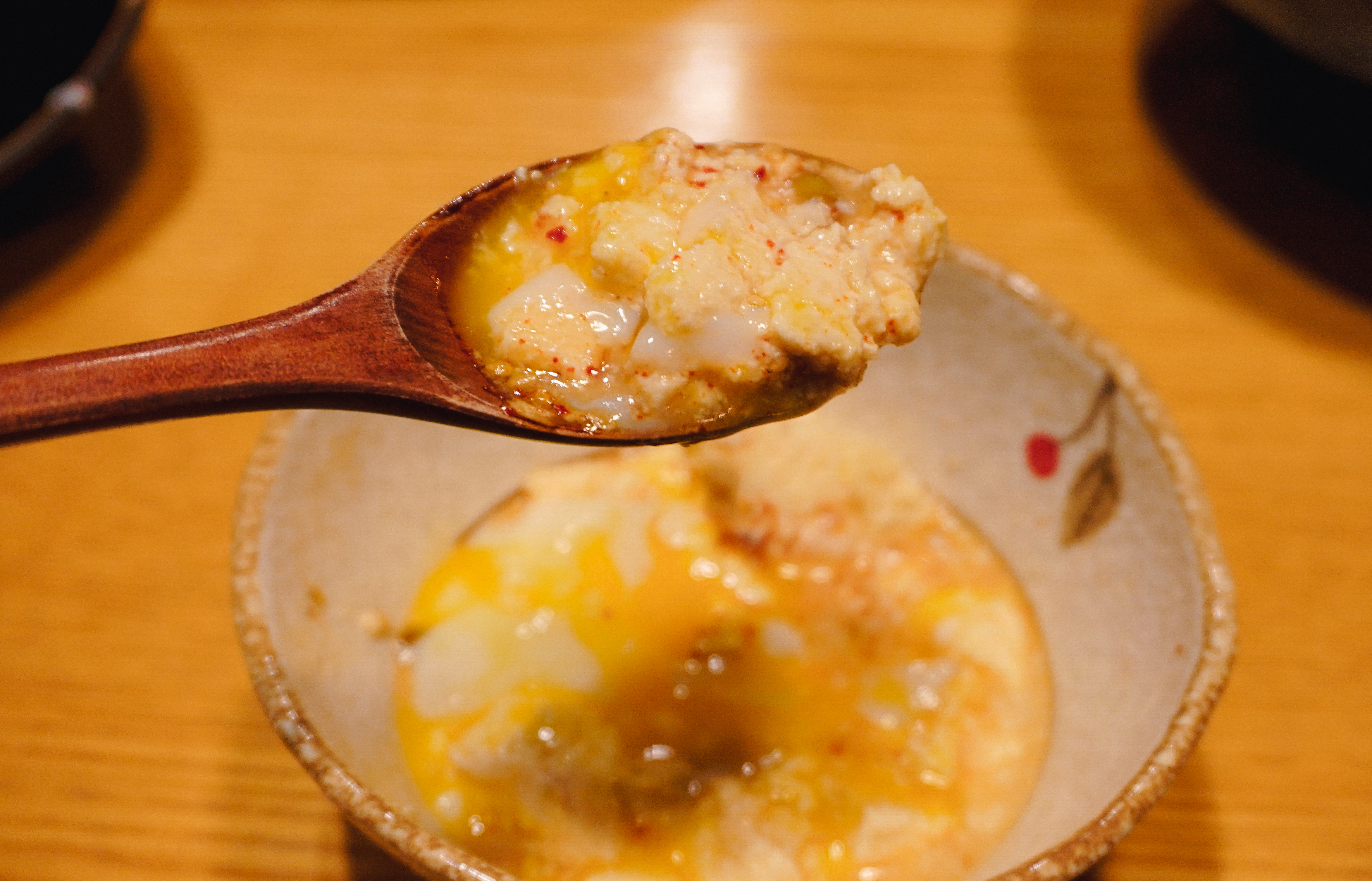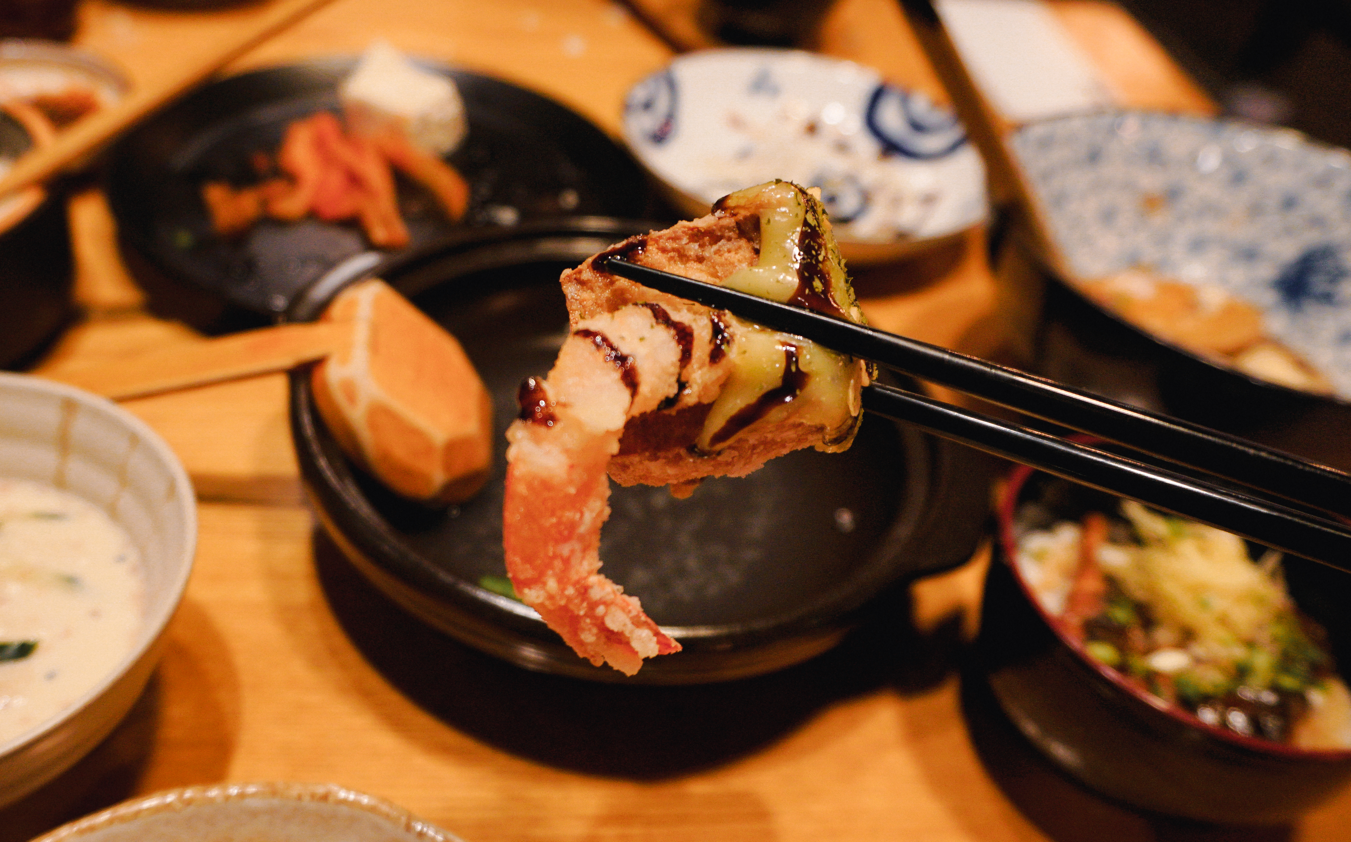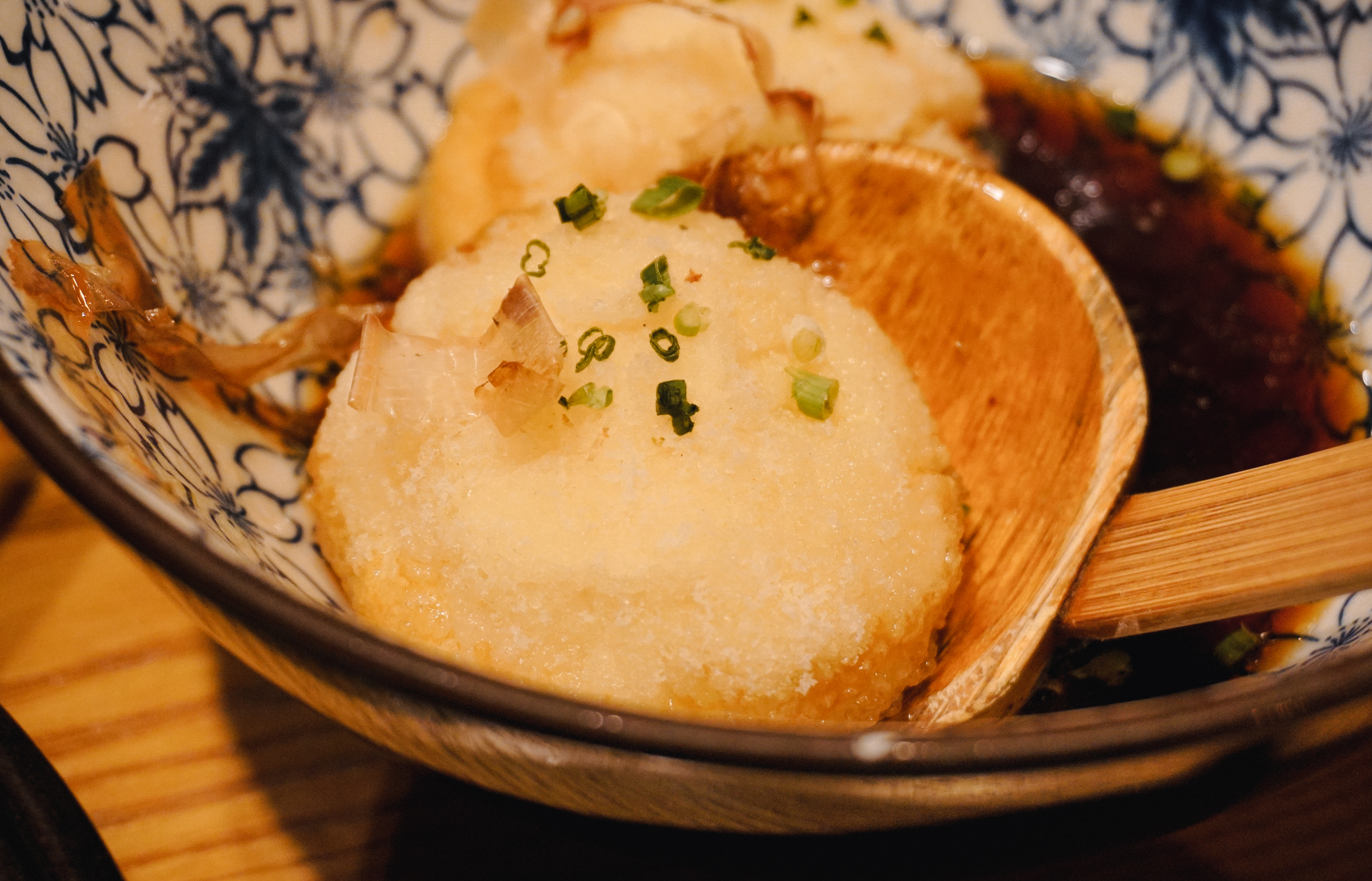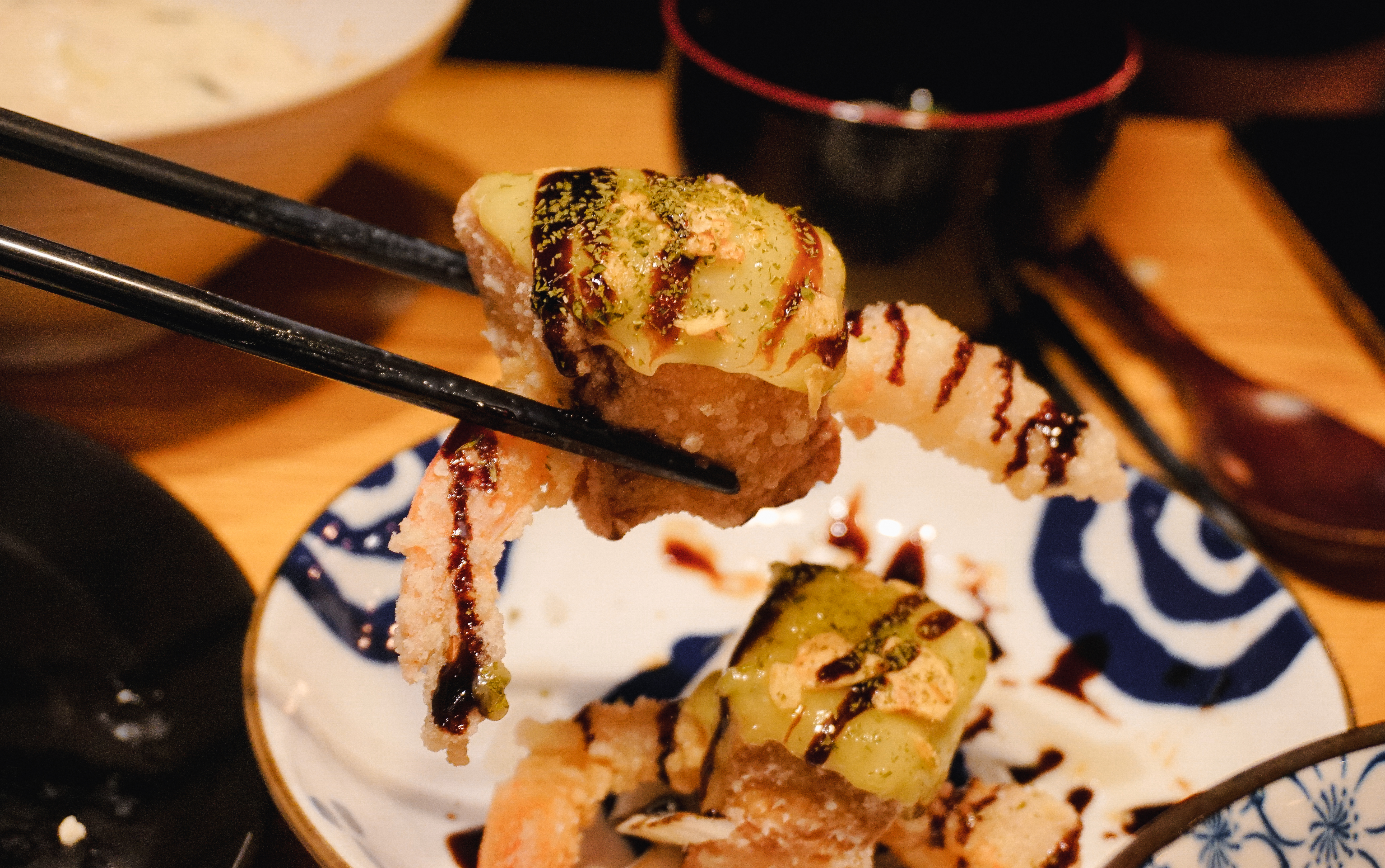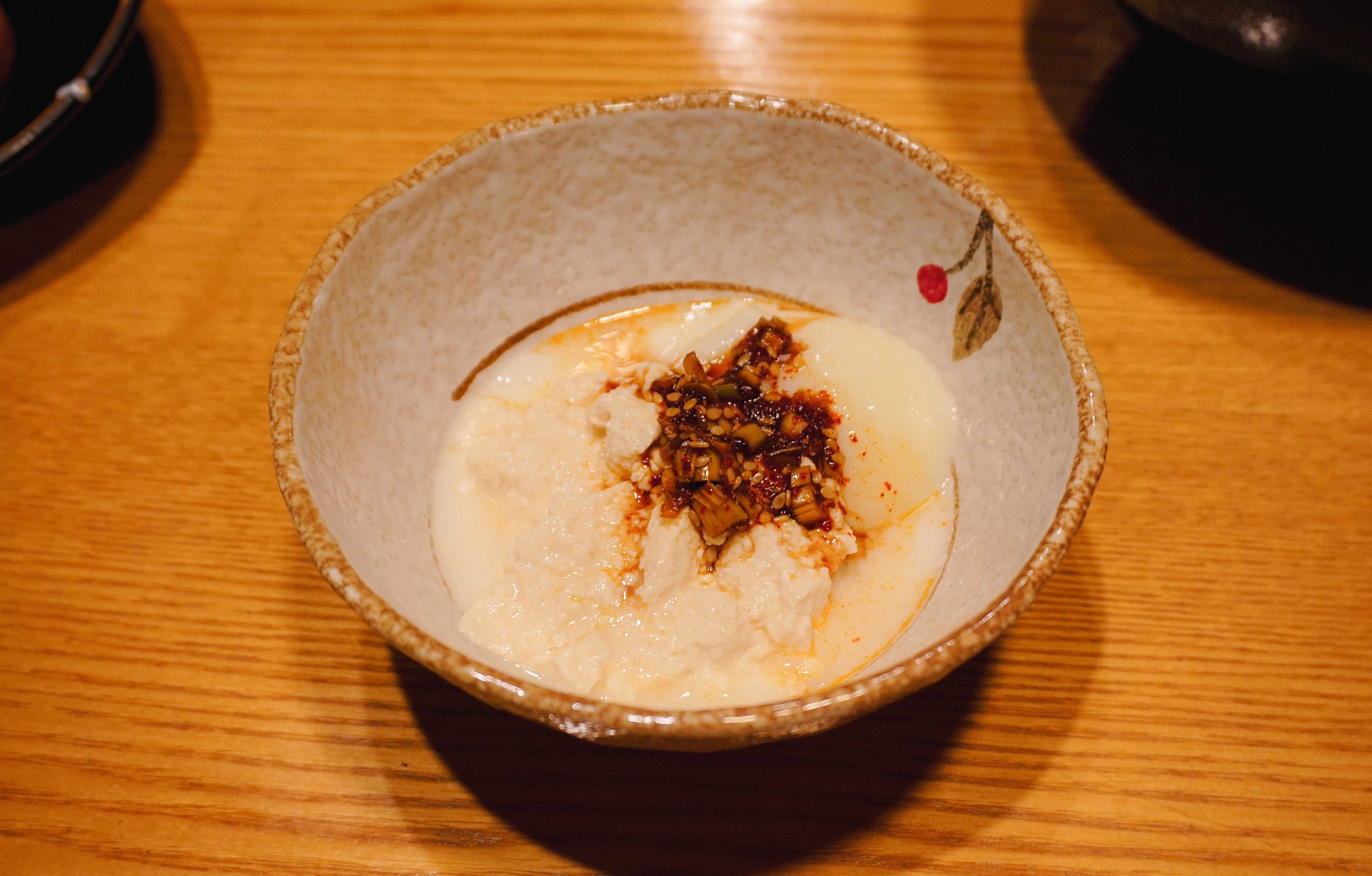 이제 소개할 메뉴는 '와사비크림새우'와 '아게다시도후'입니다. 와사비크림새우는 '아쯔아게'라 불리는 모두부 튀김과 새우튀김 그리고 부드러운 와사비크림이 더해진 메뉴였습니다. 바삭한 식감의 튀김요리였고, 아게다시도후는 연두부를 튀겨만든 메뉴였는데 마치 경단을 먹는 것처럼 부드럽고 크리미 한 식감이 인상적인 메뉴였습니다.