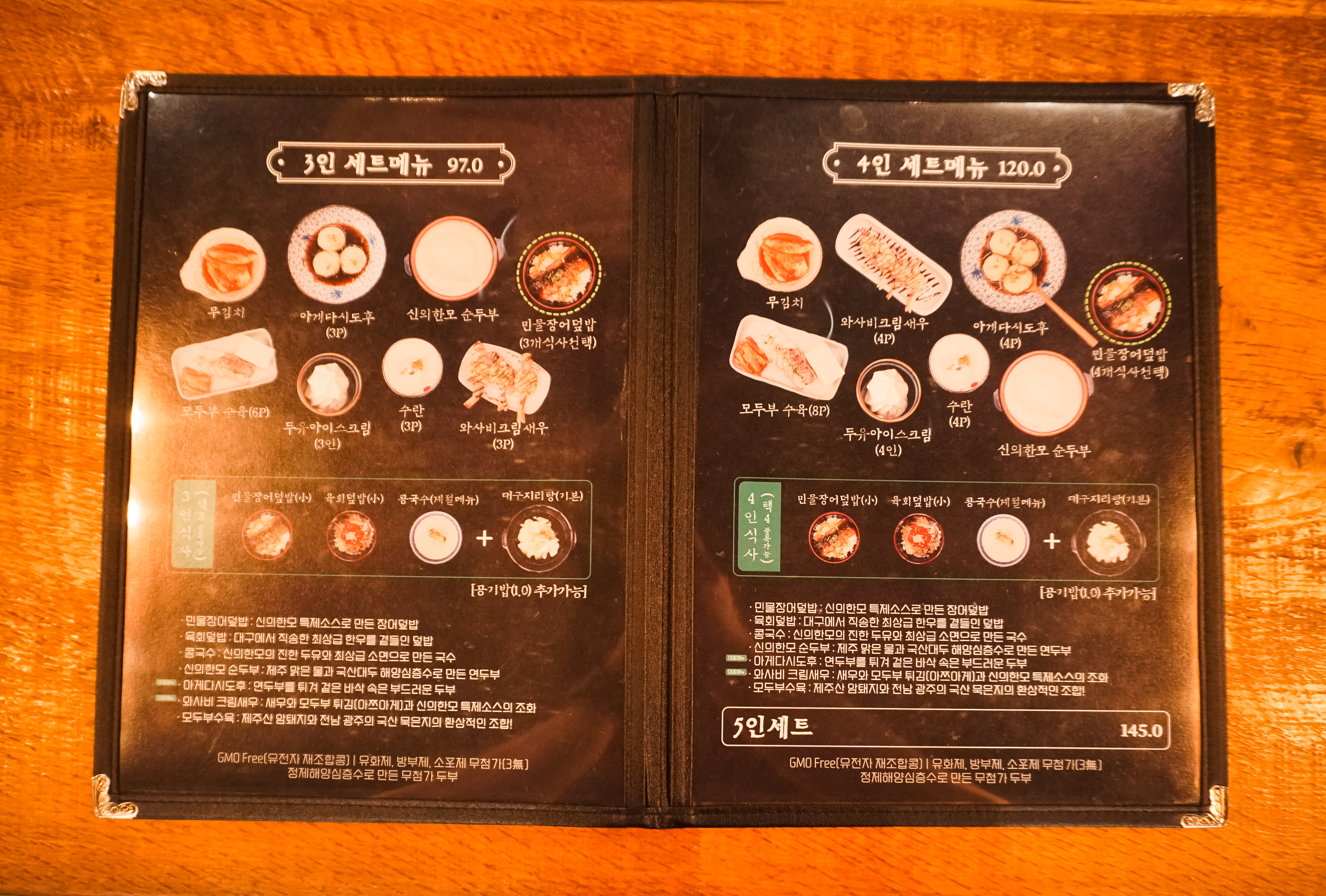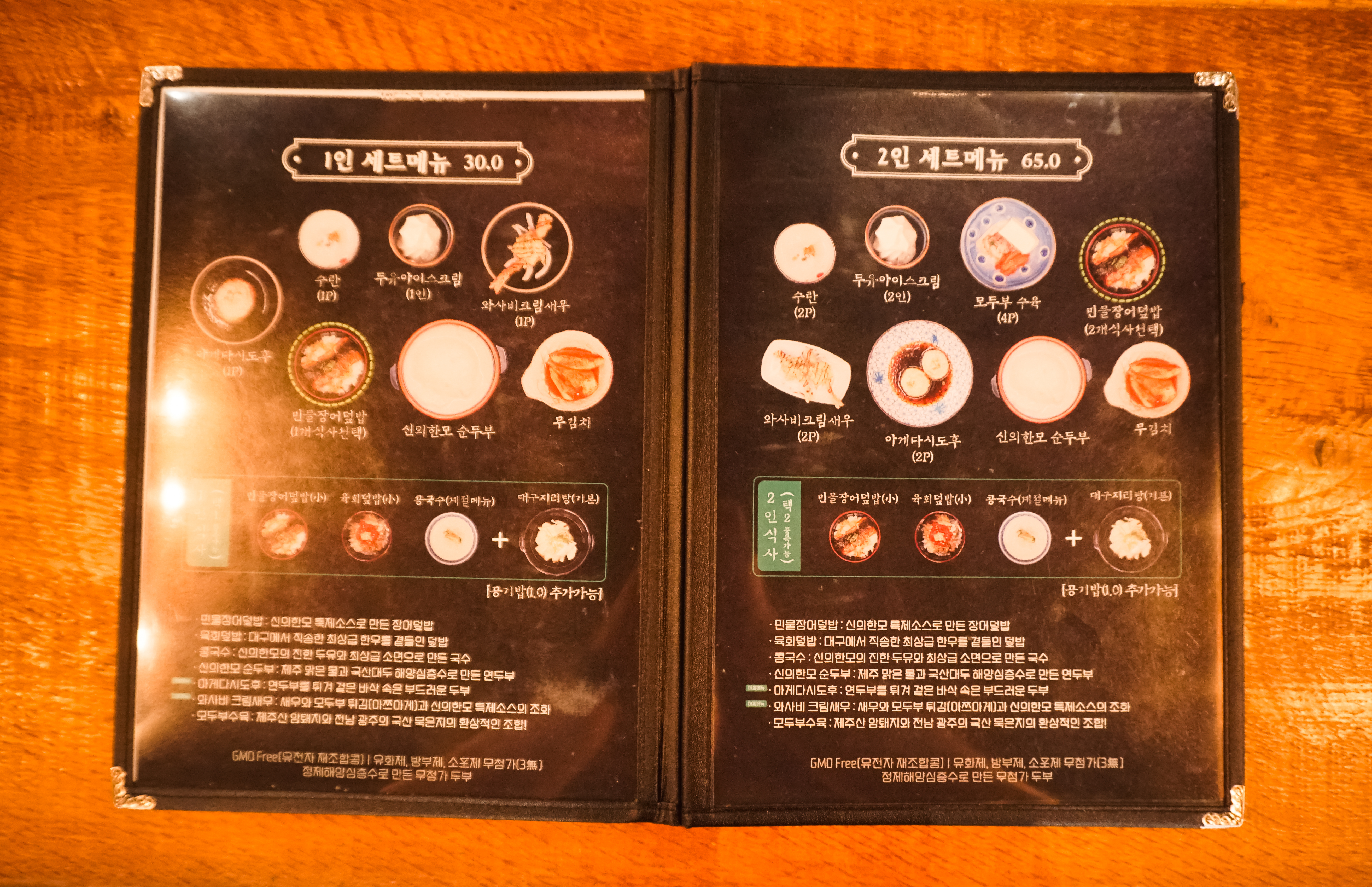 ※ 신의한모 2인세트는 신의한모순두부, 모두부수육, 아게다시도후(일본식두부튀김), 수란, 와사비크림새우, 무김치, 대구지리탕, (민물장어덮밥/ 육회덮밥/ 콩국수 중 택 2), 두유아이스크림 으로 구성되어 있었습니다.