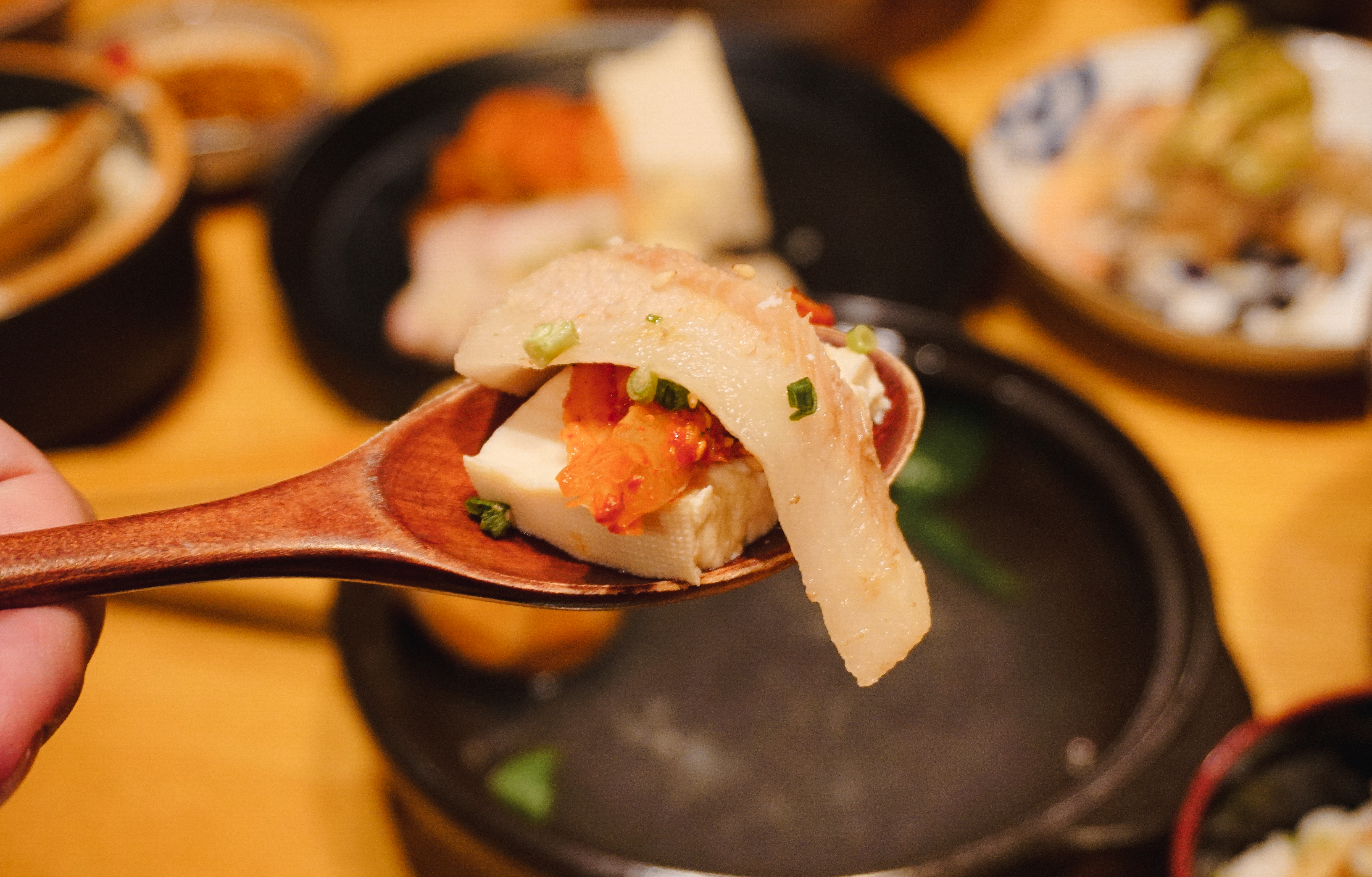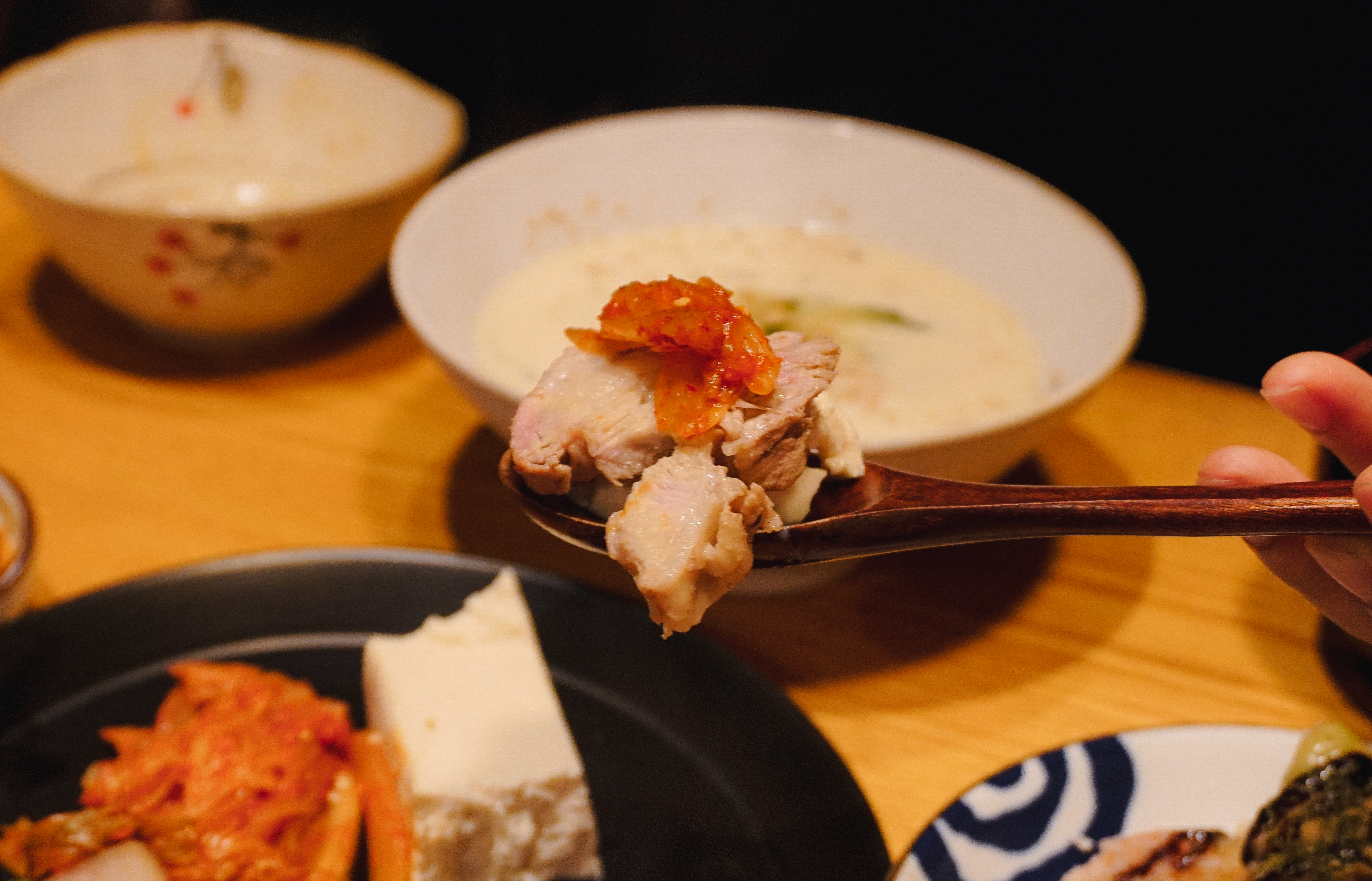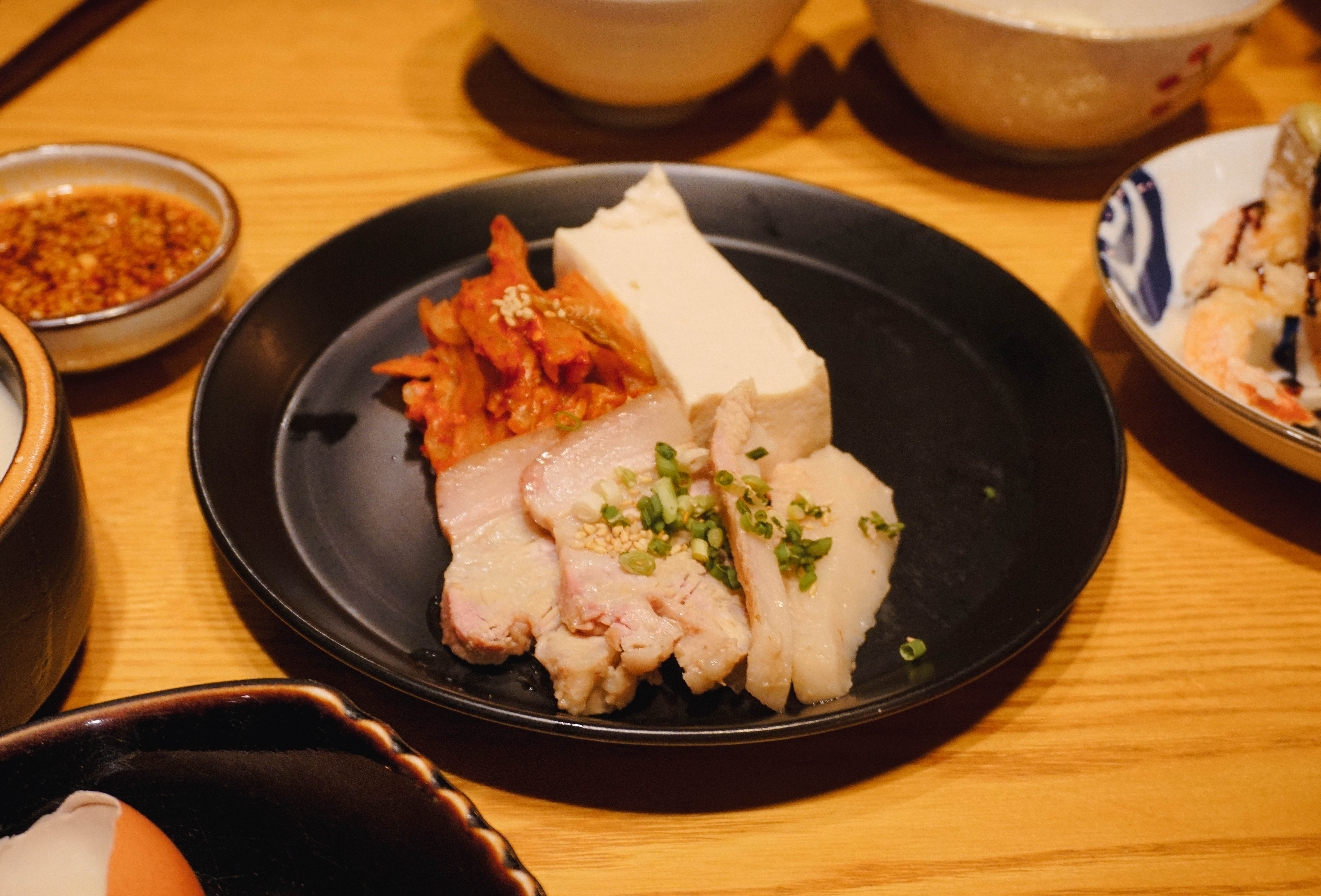 다음으로 나온 메뉴는 모두부 수육입니다. 비계와 살코기의 비율이 적당히 있는 야들야들한 수육과 잘 숙성된 묵은지 그리고 모두부를 삼합처럼 싸 먹으면 되는 메뉴였는데 짭짤하면서 새콤하게 익은 묵은지와 적당히 기름진 수육 그리고 담백하면서도 단단한 식감의 두부와의 조합이 참 괜찮더라고요.