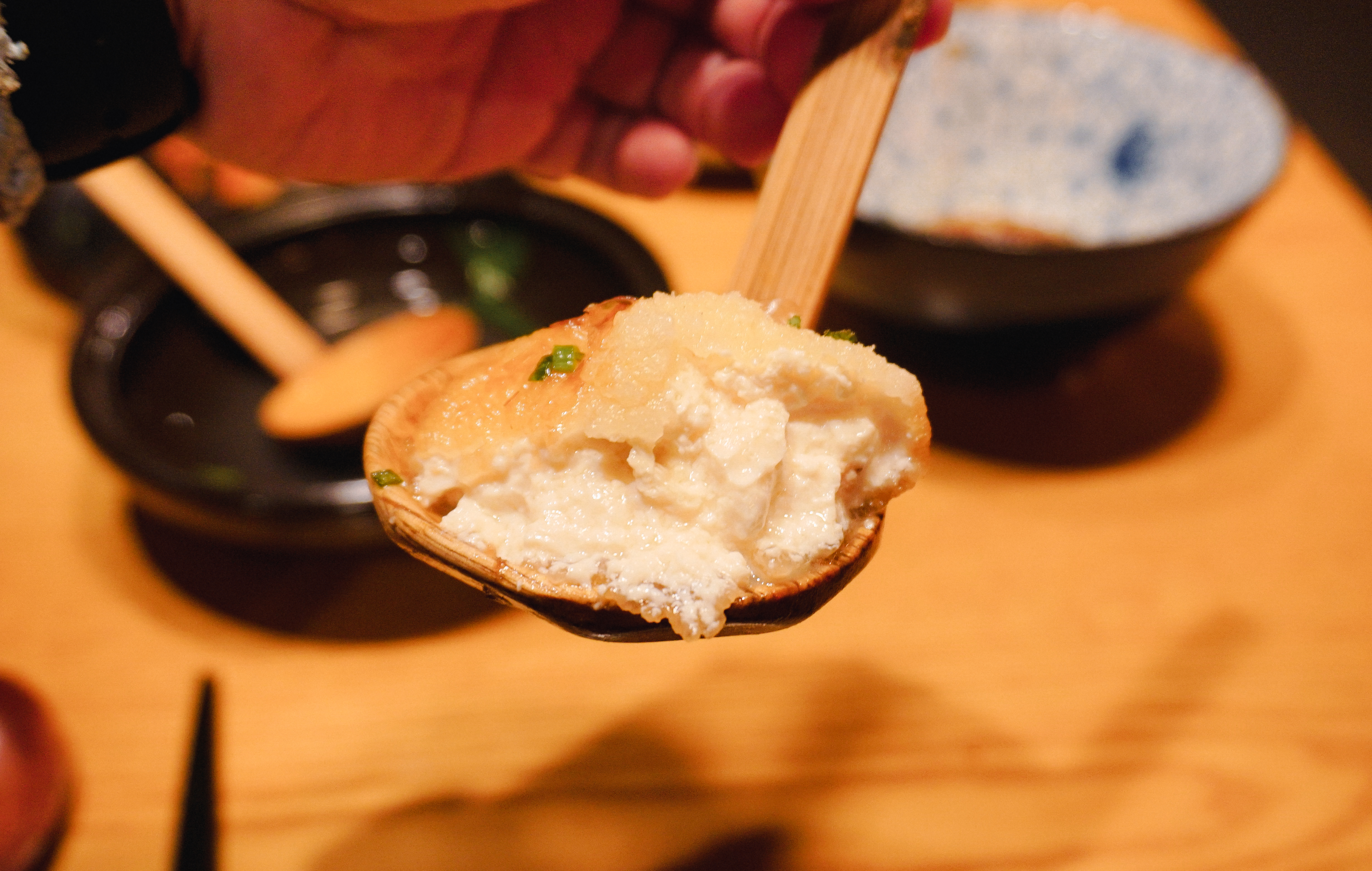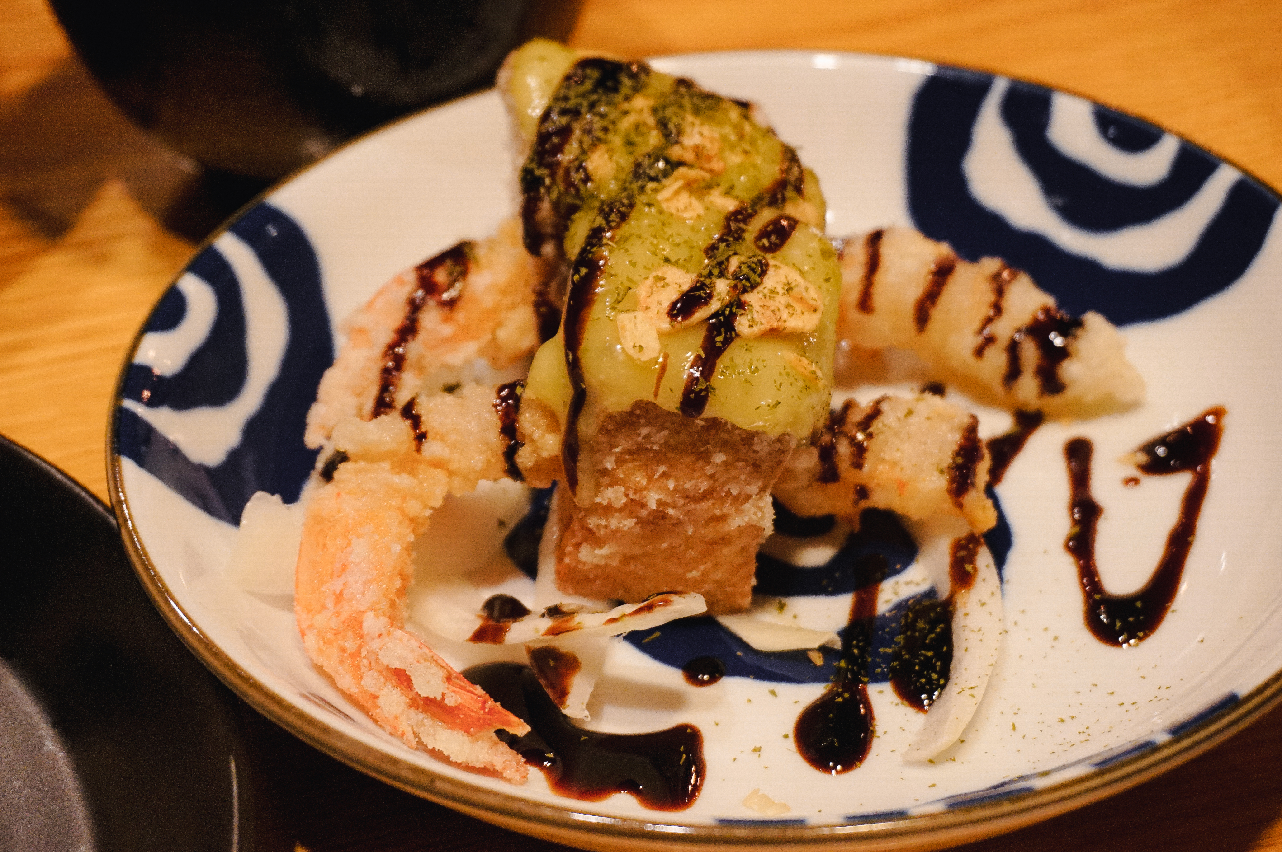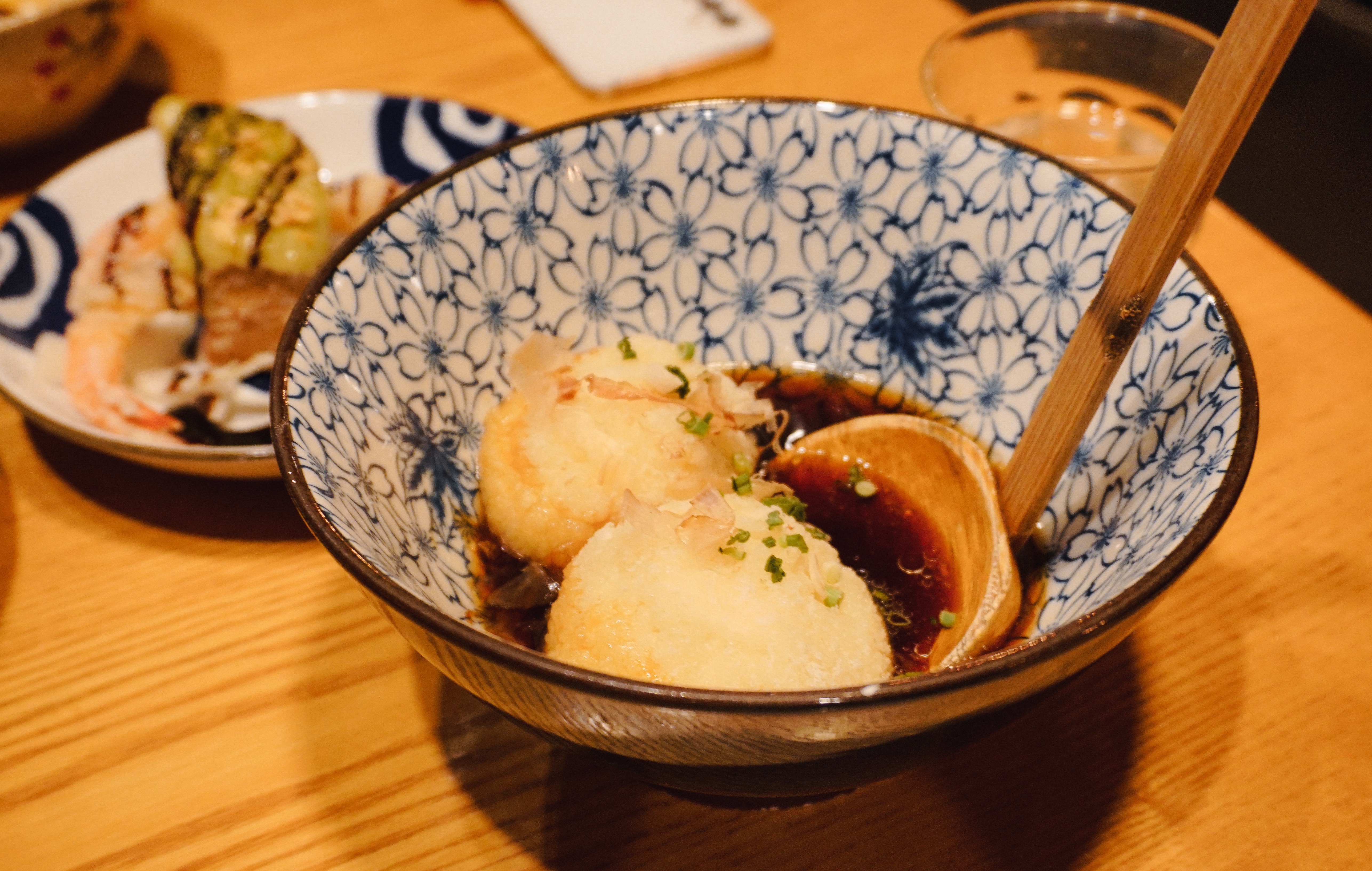 이제 소개할 메뉴는 '와사비크림새우'와 '아게다시도후'입니다. 와사비크림새우는 '아쯔아게'라 불리는 모두부 튀김과 새우튀김 그리고 부드러운 와사비크림이 더해진 메뉴였습니다. 바삭한 식감의 튀김요리였고, 아게다시도후는 연두부를 튀겨만든 메뉴였는데 마치 경단을 먹는 것처럼 부드럽고 크리미 한 식감이 인상적인 메뉴였습니다.