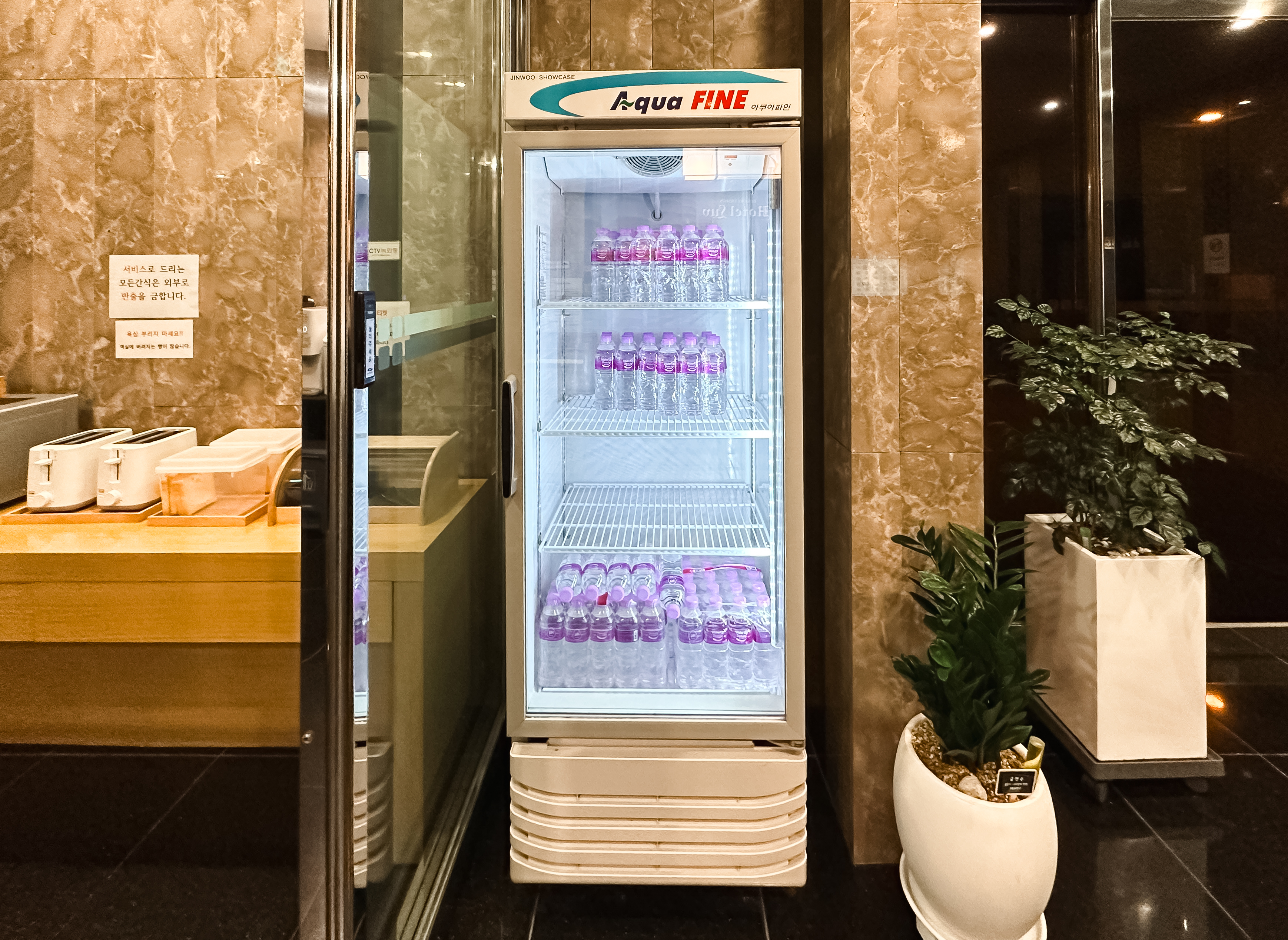 참고로 객실에 물이 부족하면 생수도 꺼내어 마실 수 있도록 별도의 생수냉장고를 두어 손님들이 이용할 수 있도록 하고 있었습니다. 서비스 시설은 이정도로 하고 객실 소개를 해드리겠습니다.